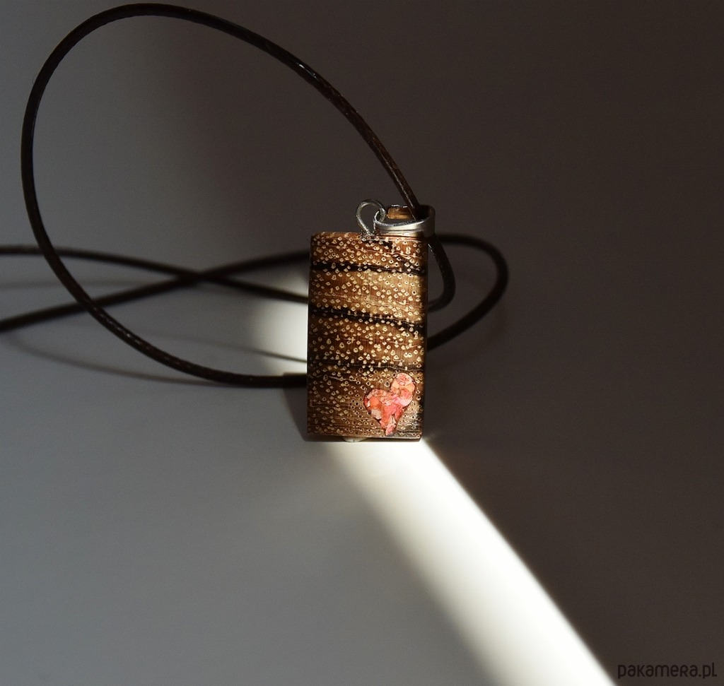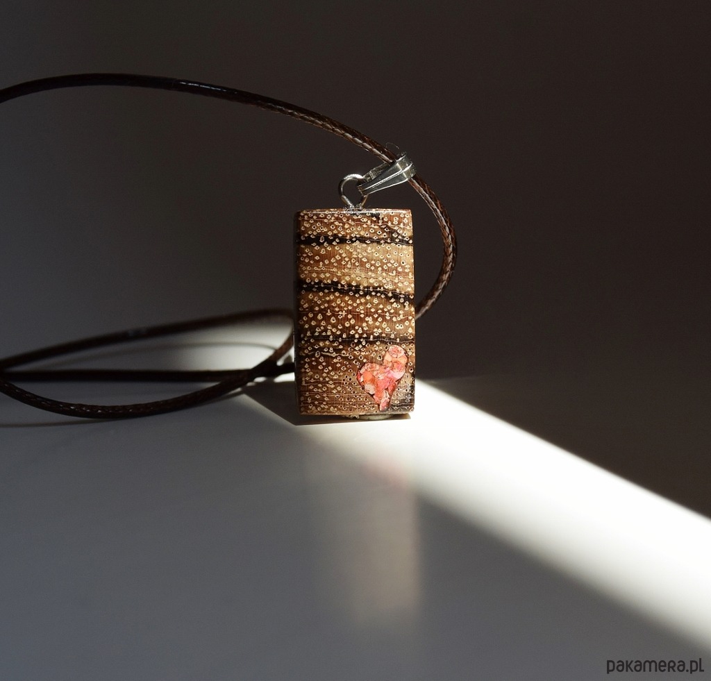 Niewielki wisiorek o klasycznym kształcie wykonany został z drewna zebrano oraz inkrustacji z jaspisu. Kolorystyka drewna oraz dodanie minerału sprawiły, że jest wyjątkowy. Ręcznie szlifowane drewno zabezpieczone zostało naturalnymi woskami i wypolerowane. Wisiorek zawieszony jest na sznurku jubilerskim w kolorze brązowym. Regulacja długości przez przesuwanie węzełków, więc można nosić na dowolnej wysokości. Zawieszka ze stali chirurgicznej, więc nie będzie powodowała uczulenia i nie będzie ciemniała.