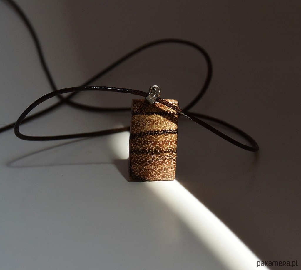 Wymiary części drewnianej wisiorka: wys. 2,1 cm, szer. 1,2 cm, grubość 4 mm.