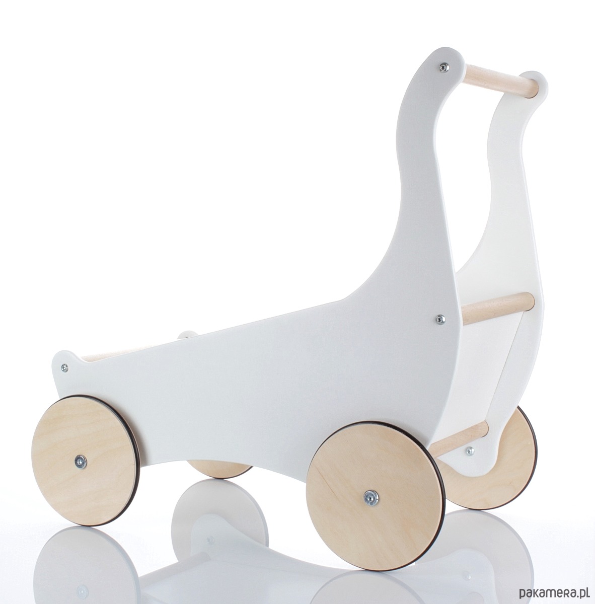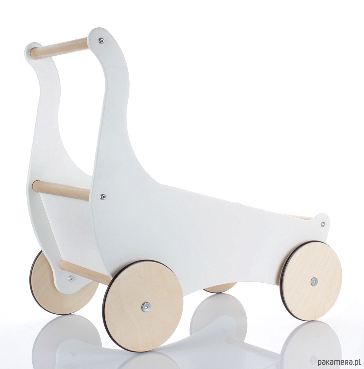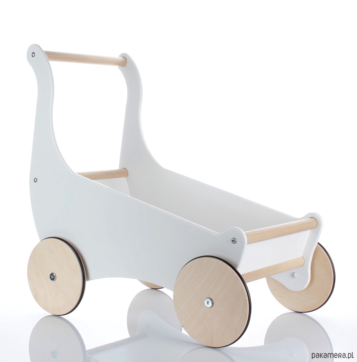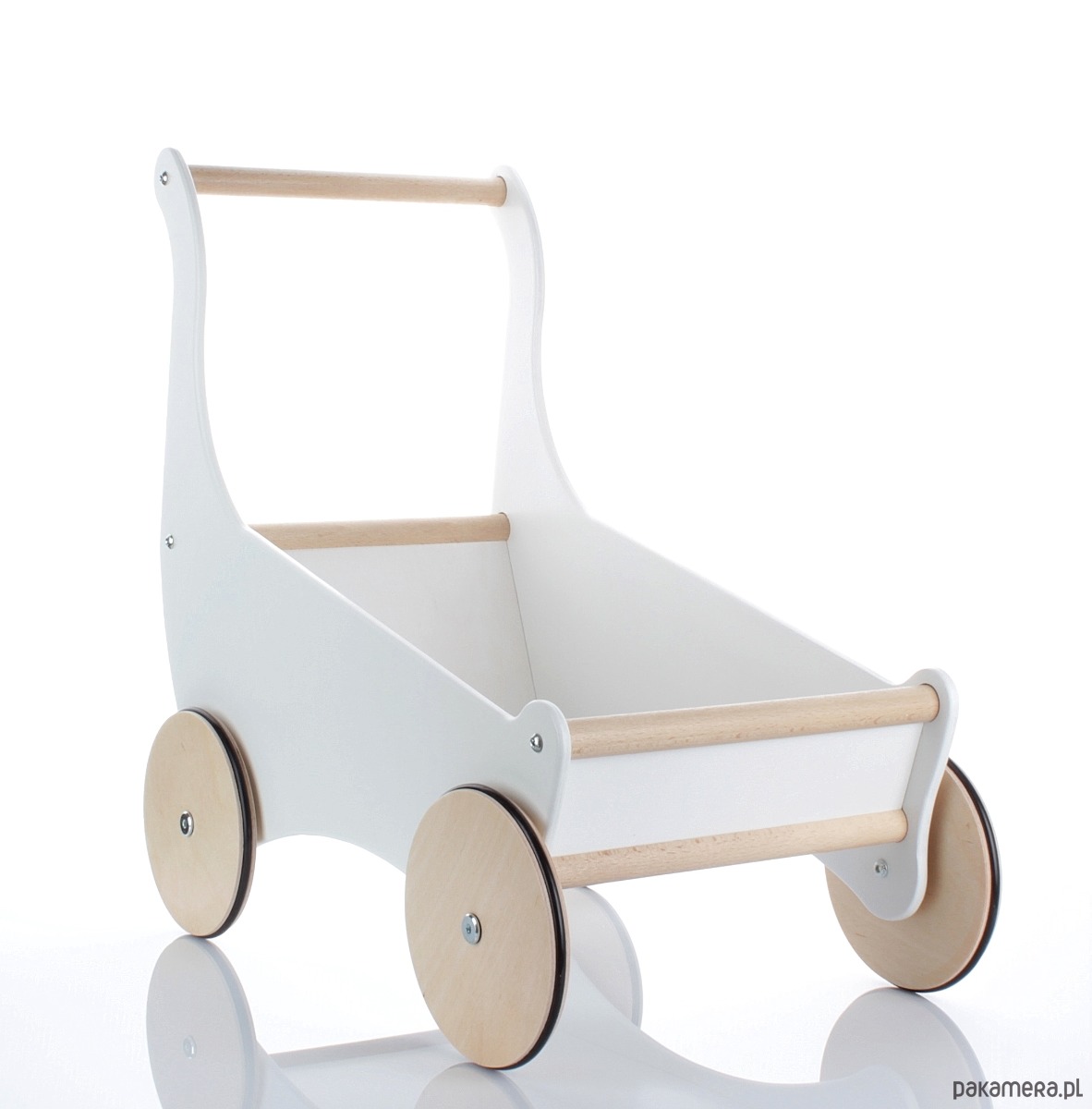 Bezpieczny w użytkowaniu dzięki zaokrąglonym krawędziom oraz wzmocnieniu patyczkami bukowymi miejscu w których wózek uderza w ścianę czy ostre kanty. Szeroki rozstaw kółek gwarantuje jego stabilność podczas zabawy i sprawdzi się świetnie również jako pierwszy pchacz / chodzik do nauki chodzenia dla najmłodszych. Kółka kręcą się w równomierny sposób, dzięki temu wózek "nie ucieka" dziecku przy zabawie czy próbie stawiania pierwszych kroków, kółka wykończone są gumą antypoślizgową, dlatego wózek jest cichy i nie niszczy podłogi podczas zabawy. Wózek swą uniwersalną formą idealnie wpisuje się w wystrój każdego pokój dziecięcego, eleganckiego salonu czy kącika zabaw.