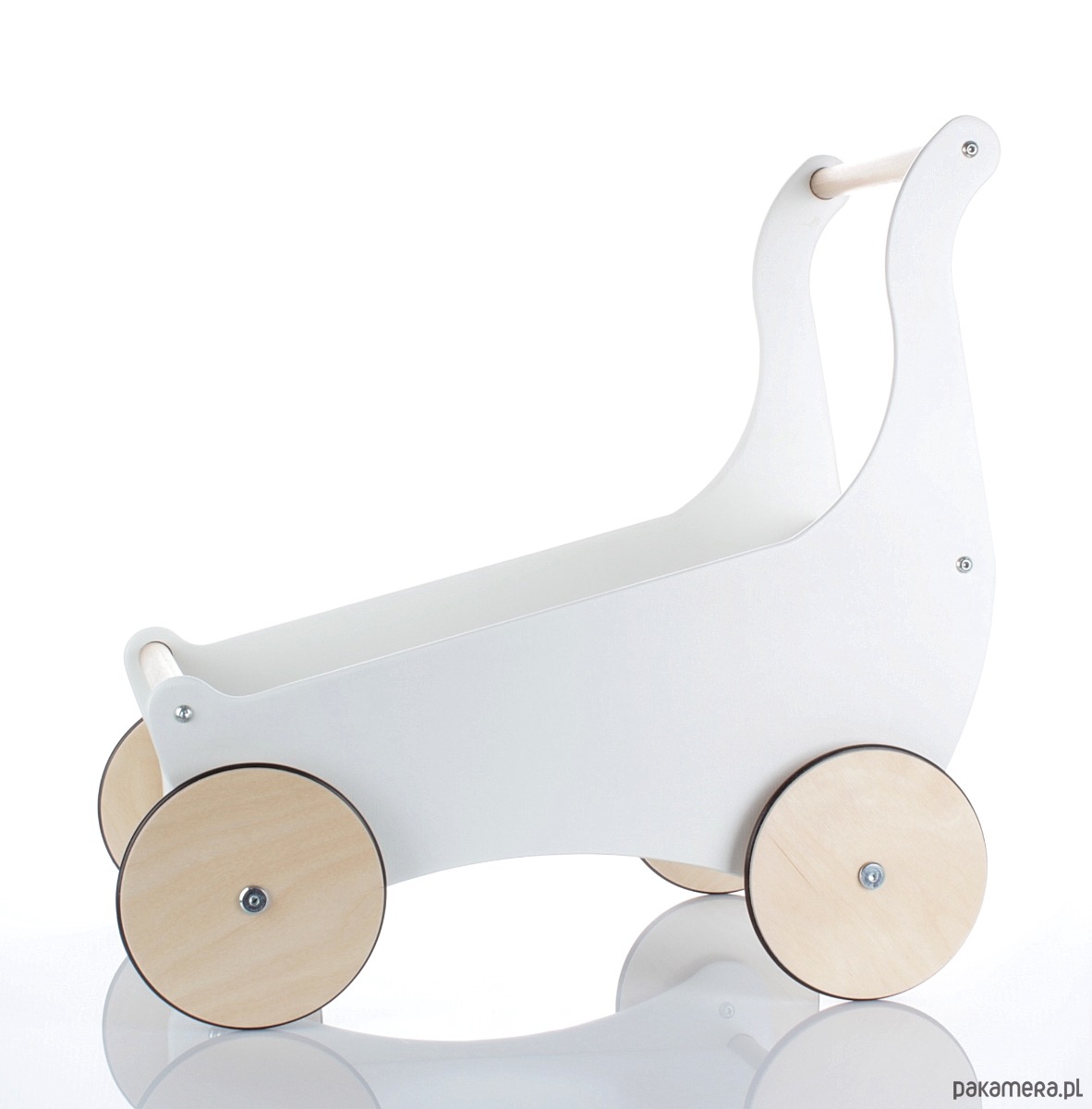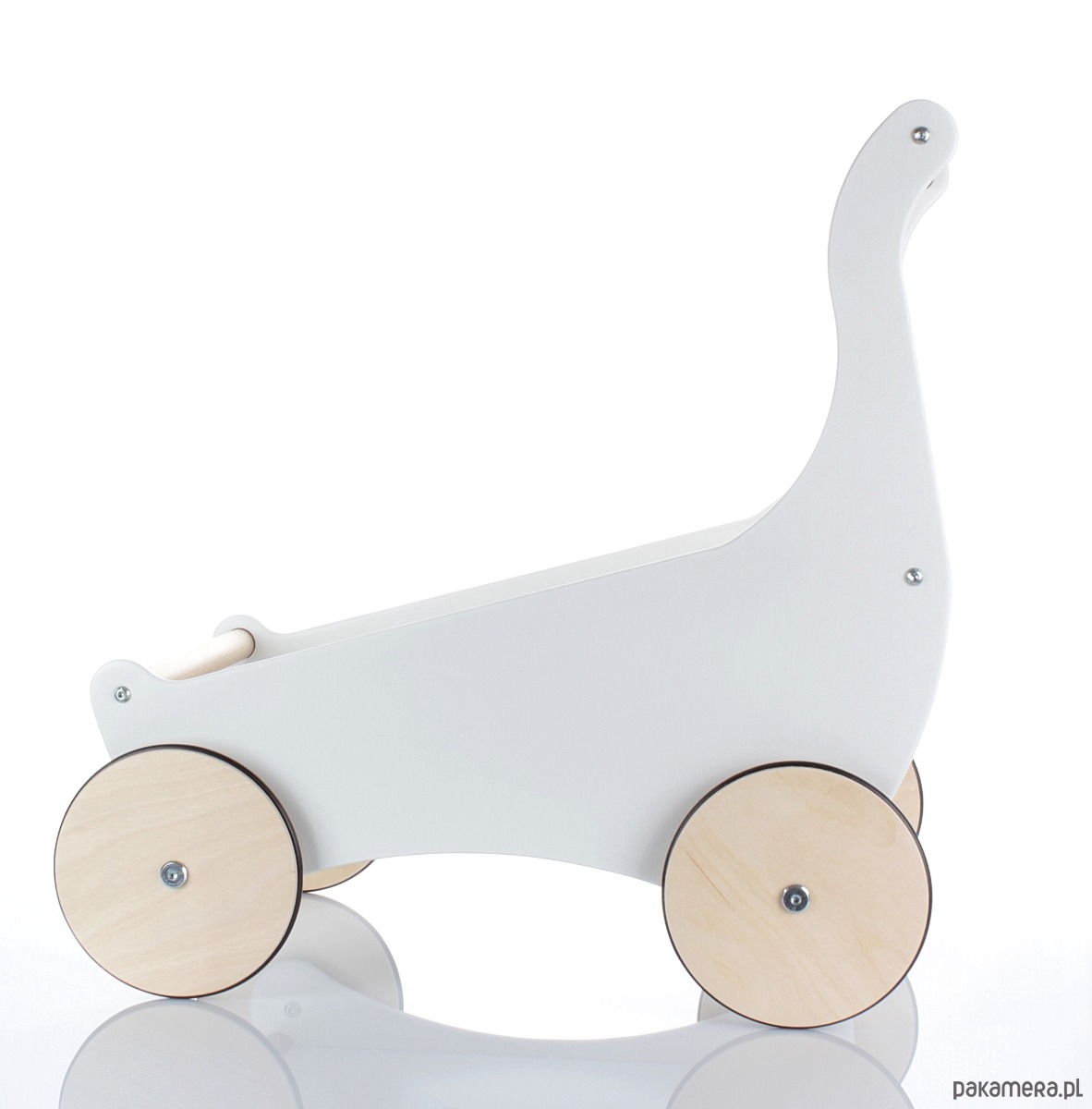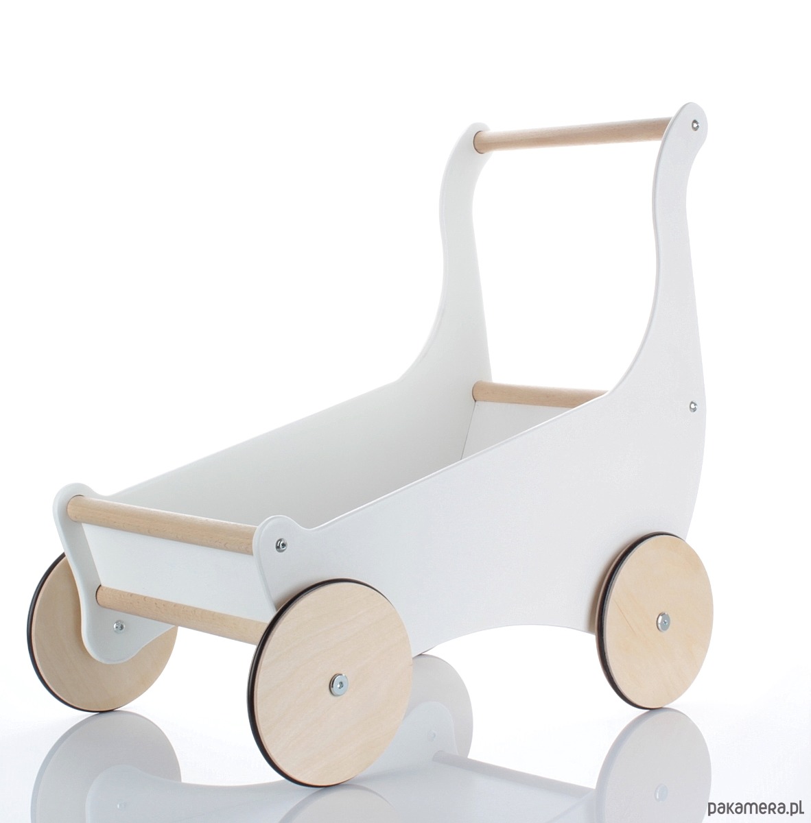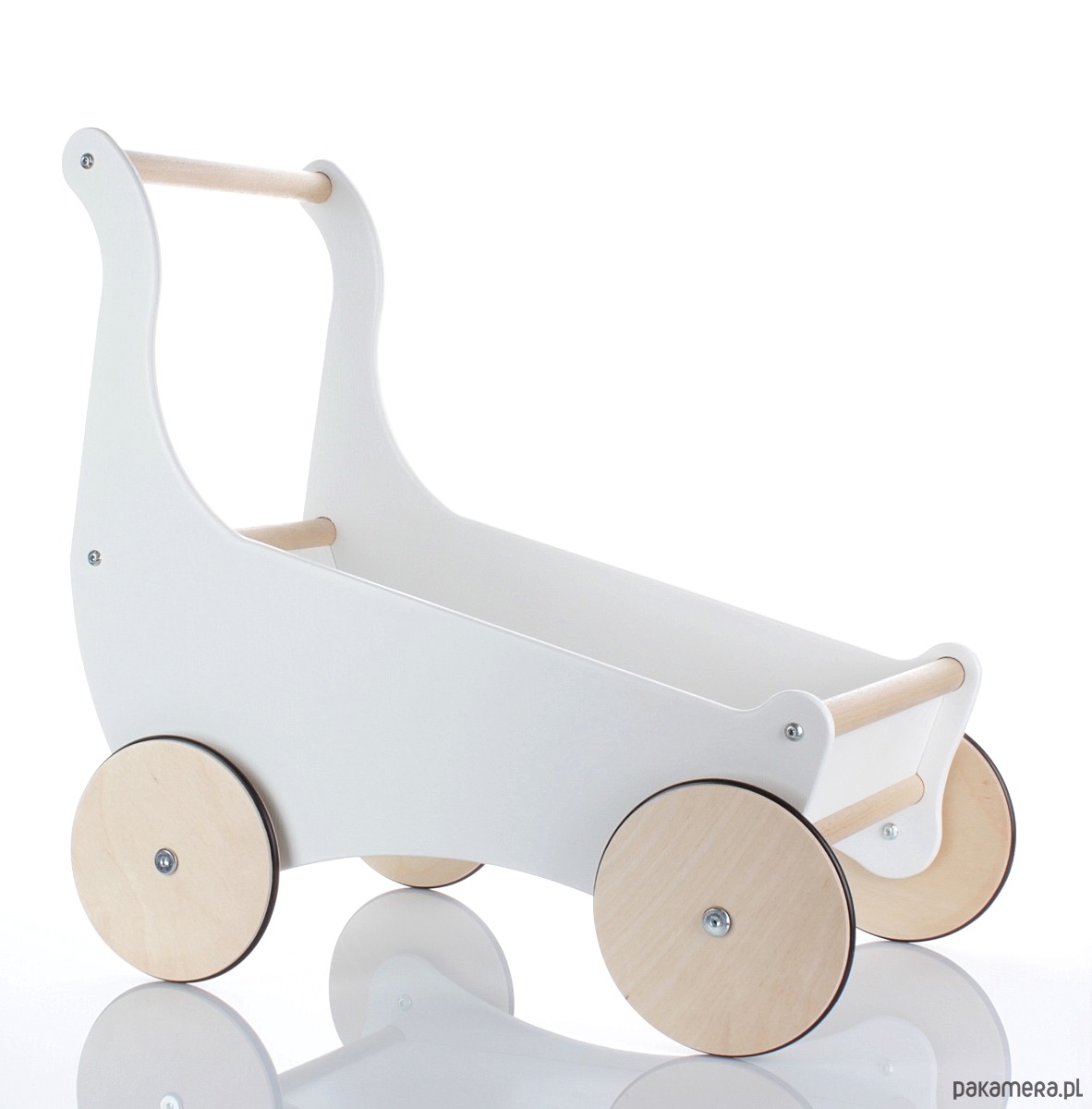 Bezpieczny w użytkowaniu dzięki zaokrąglonym krawędziom oraz wzmocnieniu patyczkami bukowymi miejscu w których wózek uderza w ścianę czy ostre kanty. Szeroki rozstaw kółek gwarantuje jego stabilność podczas zabawy i sprawdzi się świetnie również jako pierwszy pchacz / chodzik do nauki chodzenia dla najmłodszych. Kółka kręcą się w równomierny sposób, dzięki temu wózek "nie ucieka" dziecku przy zabawie czy próbie stawiania pierwszych kroków, kółka wykończone są gumą antypoślizgową, dlatego wózek jest cichy i nie niszczy podłogi podczas zabawy. Wózek swą uniwersalną formą idealnie wpisuje się w wystrój każdego pokój dziecięcego, eleganckiego salonu czy kącika zabaw.