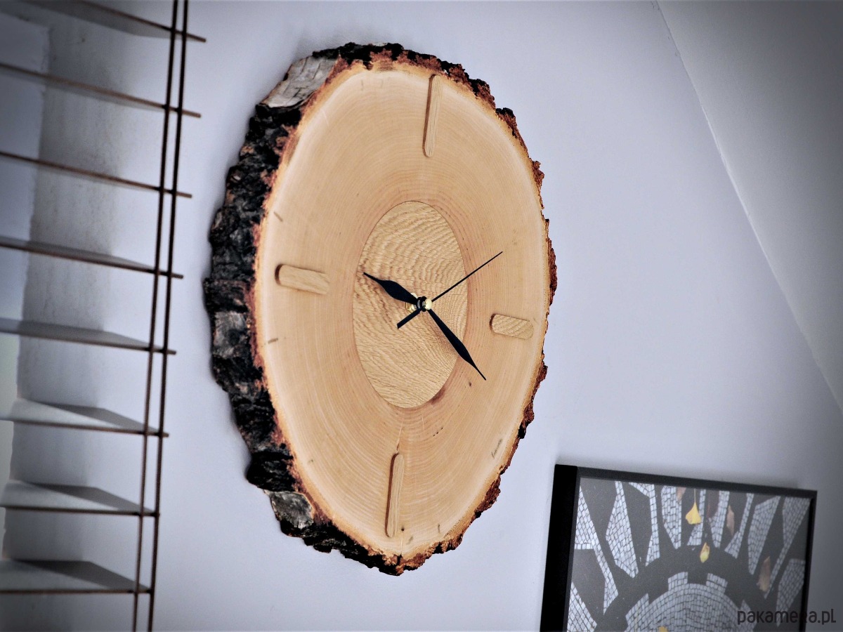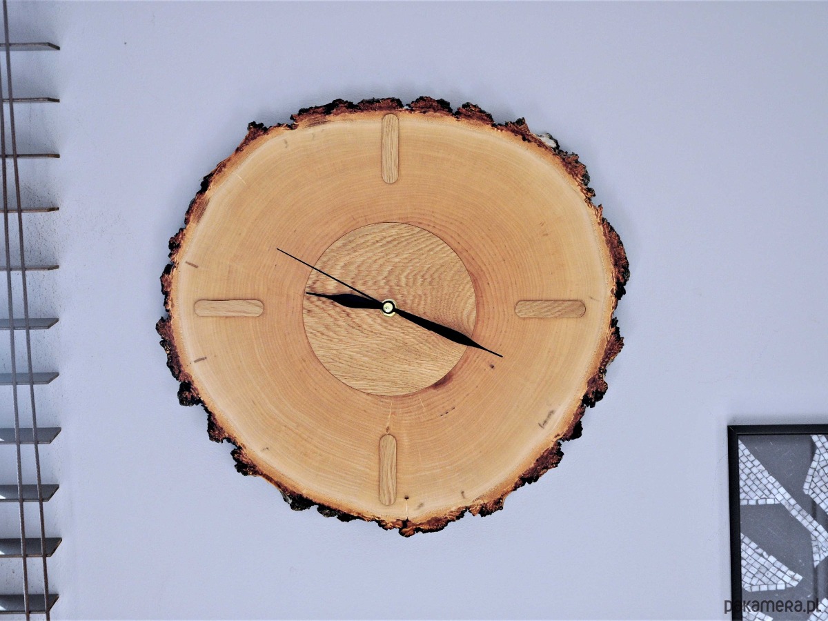Każdy zegar tworzony jest ręcznie, co sprawia, że różnice w układzie słojów czy drobne pęknięcia mogą się pojawić – to naturalny proces pracy drewna, który nadaje mu niepowtarzalny charakter.