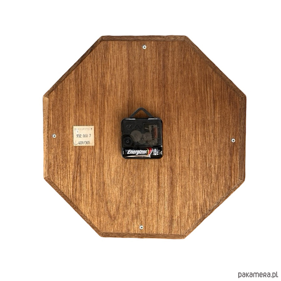 Drewniany zegar ścienny w stylu rustykalnym wyprodukowany przez niemiecką firmę Ebg w drugiej połowie ubiegłego wieku. Korpus wykonany z drewna -masyw dębowy, cyferblat mosiężny. Zegar ma mechanizm kwarcowy- na pojedynczą baterię AA, sprawny w stanie bardzo dobrym, nosi niewielkie ślady użytkowania. Cyferblat przykryty szkłem.