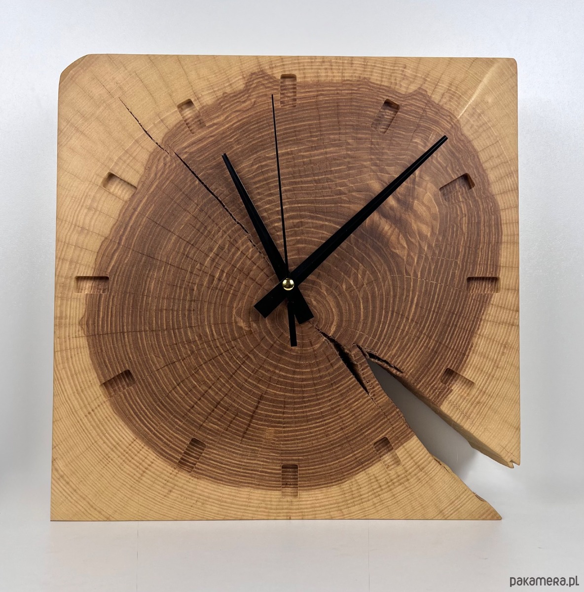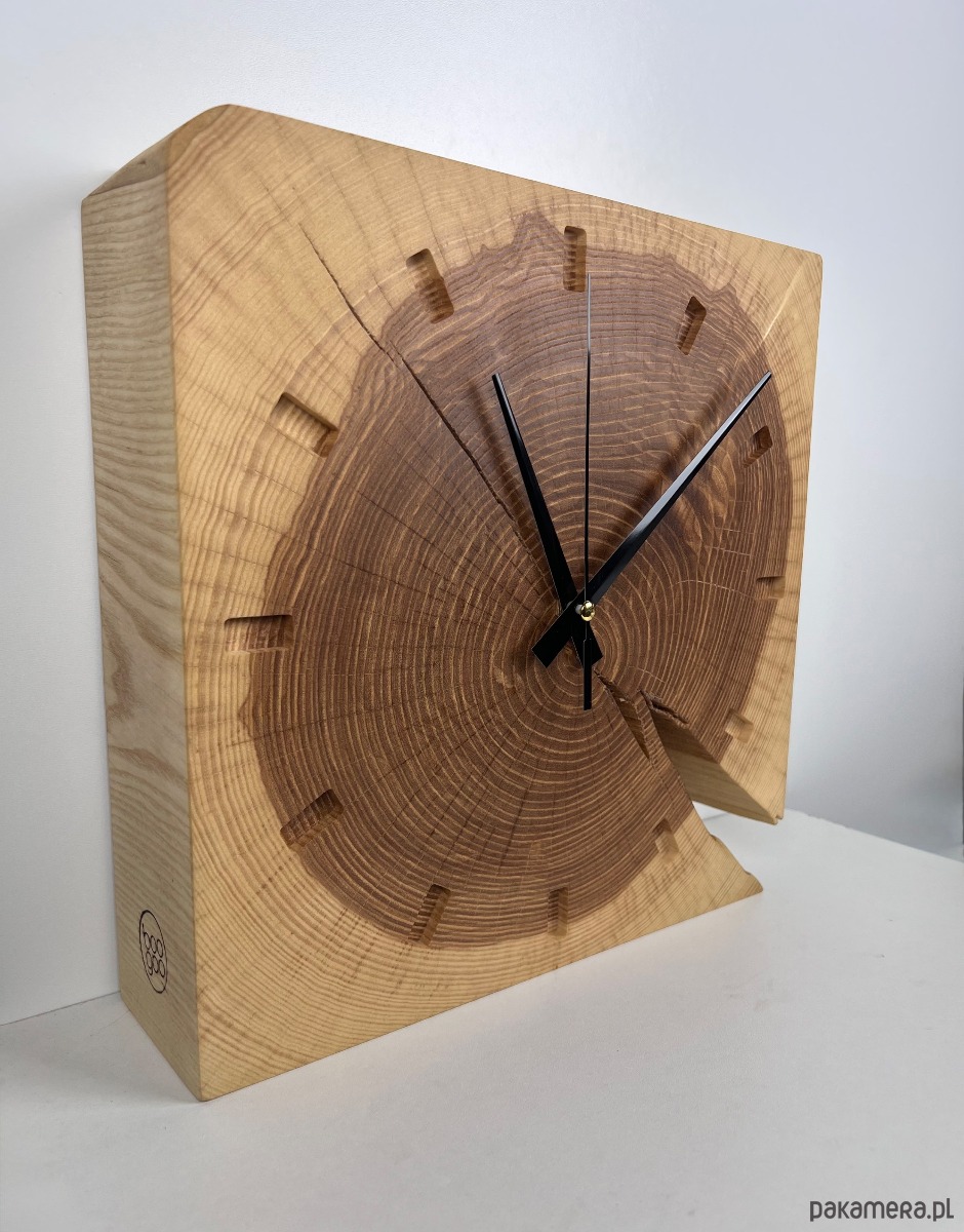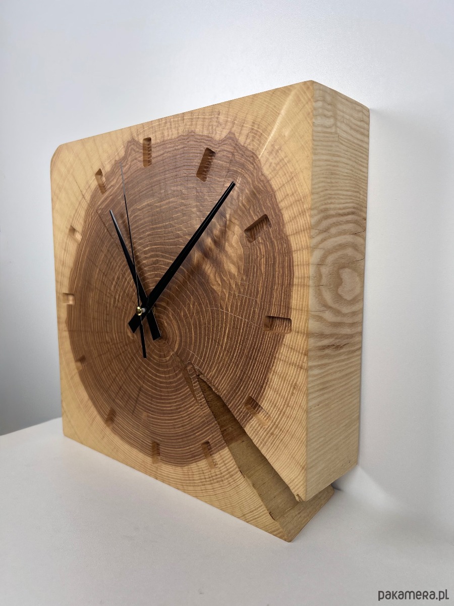 Unikatowy zegar wykonany z naturalnego plastra jesiona i kształt kwadrat to połączenie rzemiosła artystycznego i ponadczasowego designu. Zachwyca niepowtarzalnym układem słojów, naturalnymi pęknięciami i ciepłą kolorystyką drewna, dzięki czemu zegar jest jedyny w swoim rodzaju. Idealnie sprawdzi się jako zegar ścienny lub zegar do postawienia – na komodzie, półce czy biurku.