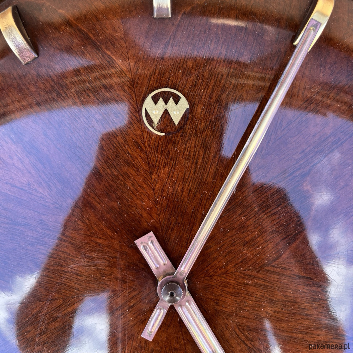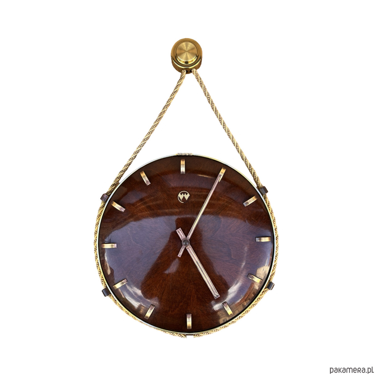 Drewniany zegar ścienny w stylu mid-century modern wyprodukowany przez niemicką firmę VEB Uhrenwerk Weimar w latach 60. Zegar nakręcany, wyposarzony w precyzyjny, mosiężny mechanizm. Bardzo ładny zegar wykonany z płyty oklejonej fornirem mahoniowym. Cyferblat sferycznym okutym w mosiądz. Zegar w pełni sprawny, w stanie oryginalnym, bardzo dobrym. Sposób zawieszenie: sznur zwieńczony mosiężnym okuciem.