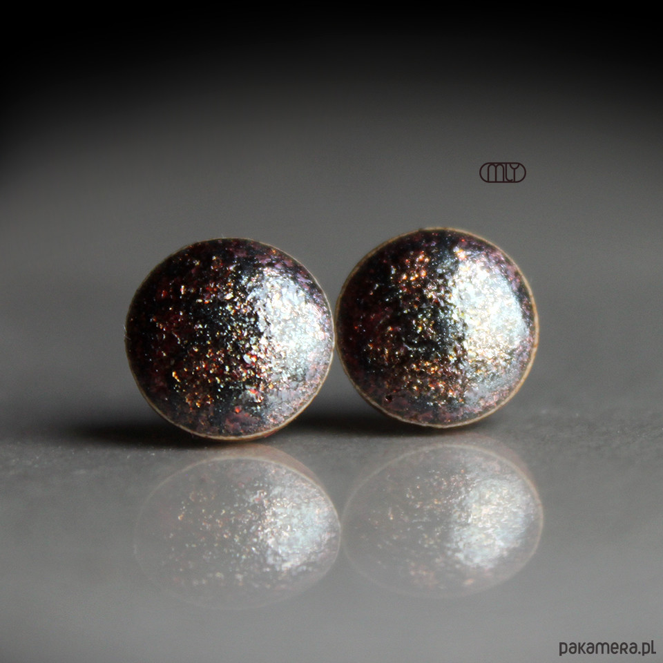 Efektowne kolczyki w formie sztyftów, ręcznie wykonane z delikatnej gliny kamionkowej, jednostronnie szkliwione efektownym połyskującym drobinkami szkliwem, na antyalergicznych sztyftach w kolorze srebrnym.średnica elementu ceramicznego ok. 6mm, Polecam