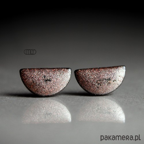 Ceramiczne kolczyki w formie sztyftów, ręcznie wykonane z delikatnej czekoladowobrązowej gliny kamionkowej, jednostronnie szkliwione mieszanką brązowych szkliw z efektem plamek i połyskujących drobinek, na antyalergicznych sztyftach w kolorze srebrnym. Długość około ok. 13mm. Polecam