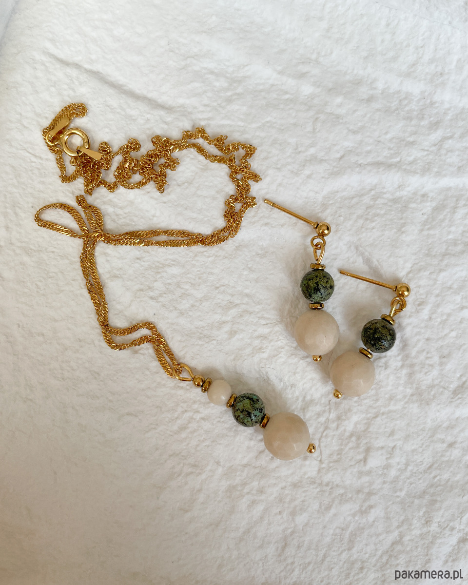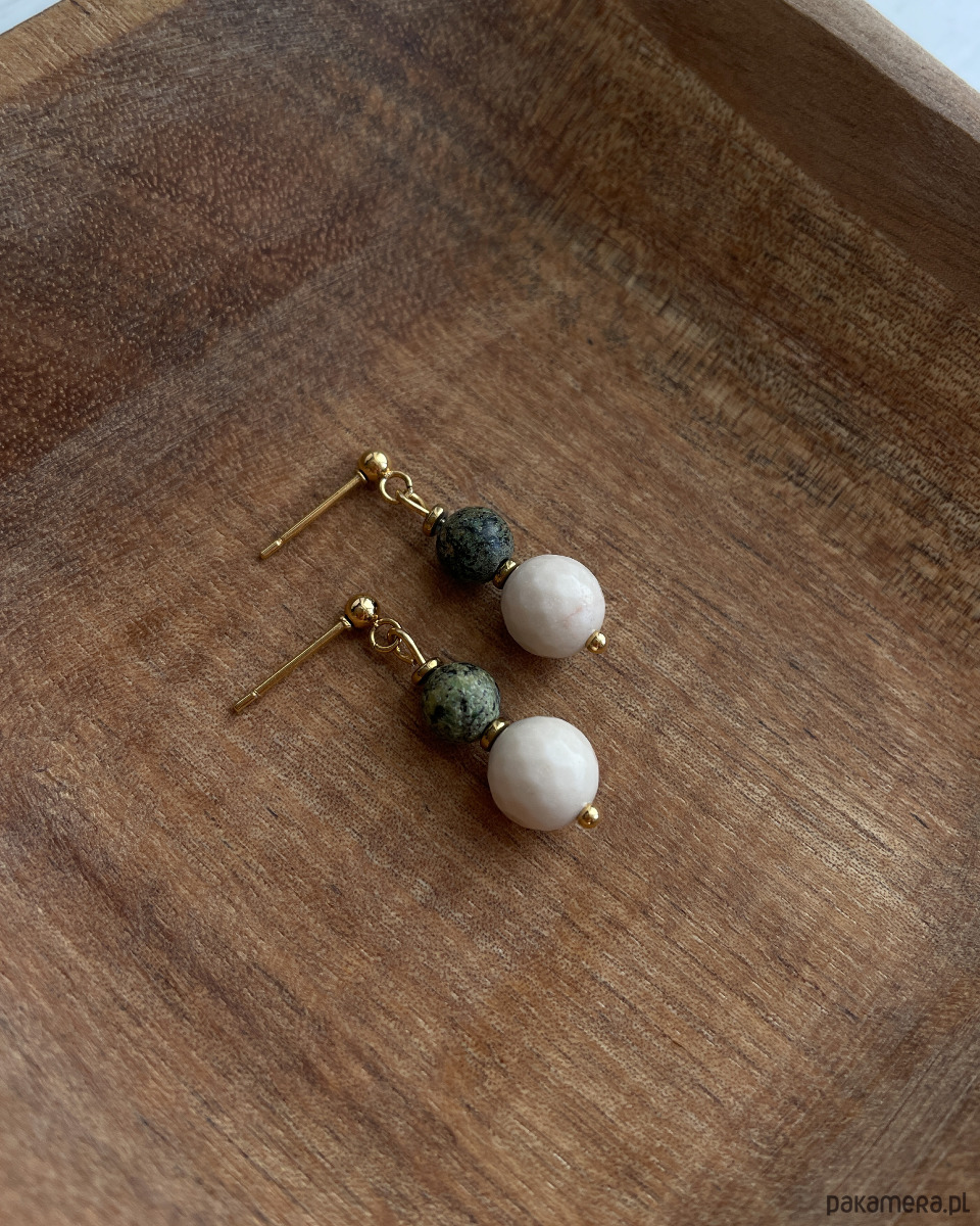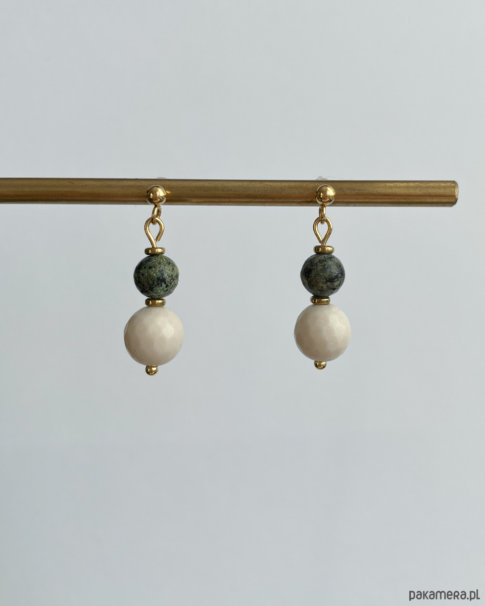 Drobne, delikatne kolczyki na lato z zielonym TURKUSEM AFRYKAŃSKIM i beżowym, fasetowanym KAMIENIEM RZECZNYM z dodatkiem złotego HEMATYTU. Sztyfty z kulką to STAL SZLACHETNA w kolorze złotym.