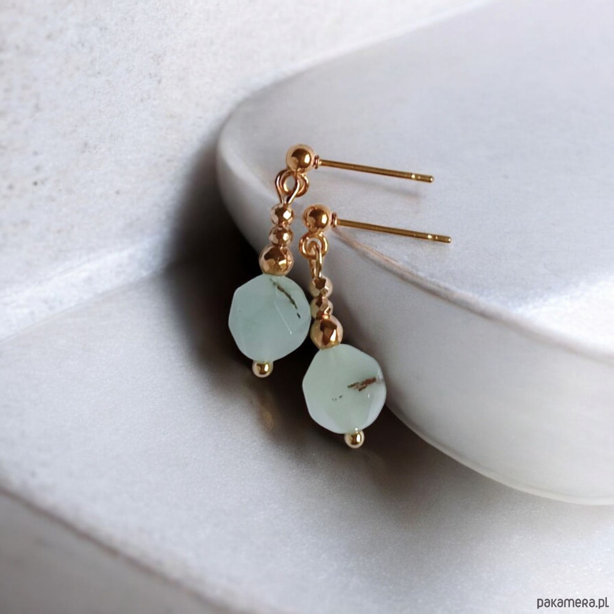 Delikatne kolczyki wykonane z jadeitu amazonitowego o ciekawym szlifie (ok 8mm) - kolor jasnoniebieski z ciemnymi wtrąceniami ,przekładek ze złotego hematytu.