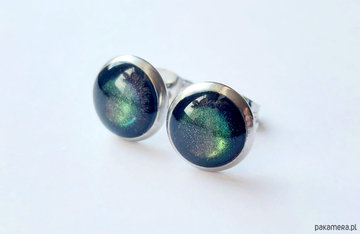 Drobne zielone kolczyki mieniące się na złoto.
