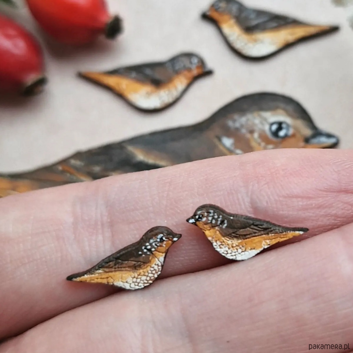 Lekkie kolczyki-sztyfty wykonane na podstawie autorskiego rysunku. Zrobione z drewna, ręcznie malowane i lakierowane. Każda para będzie niepowtarzalna. Wysokość ok 1cm. Sztyfty nie uczulą, bo są z silikonu!