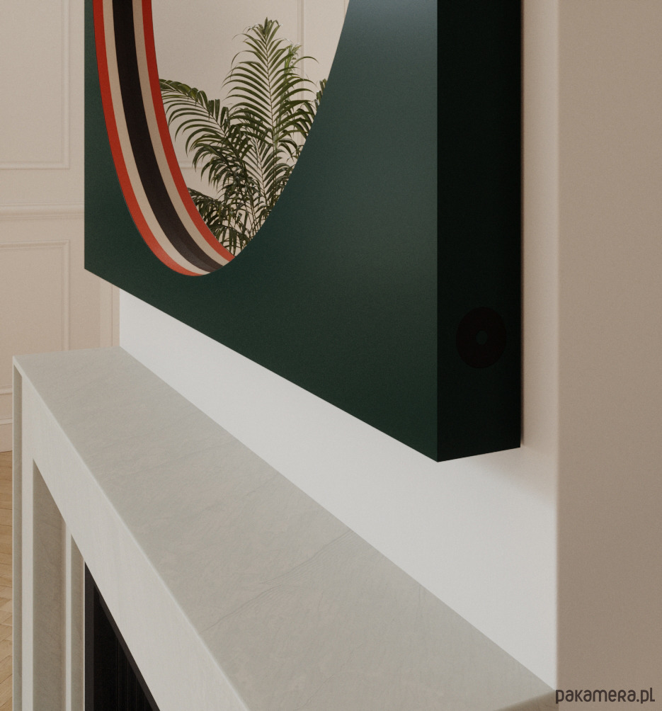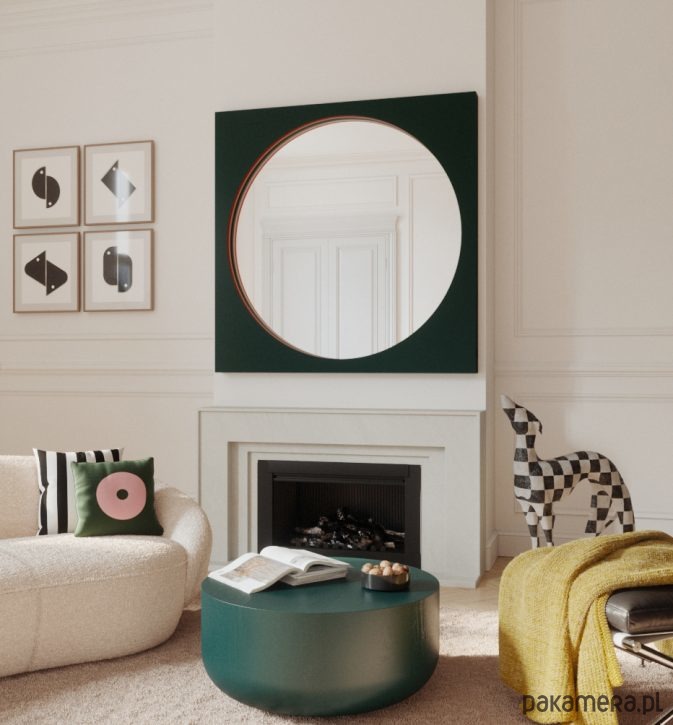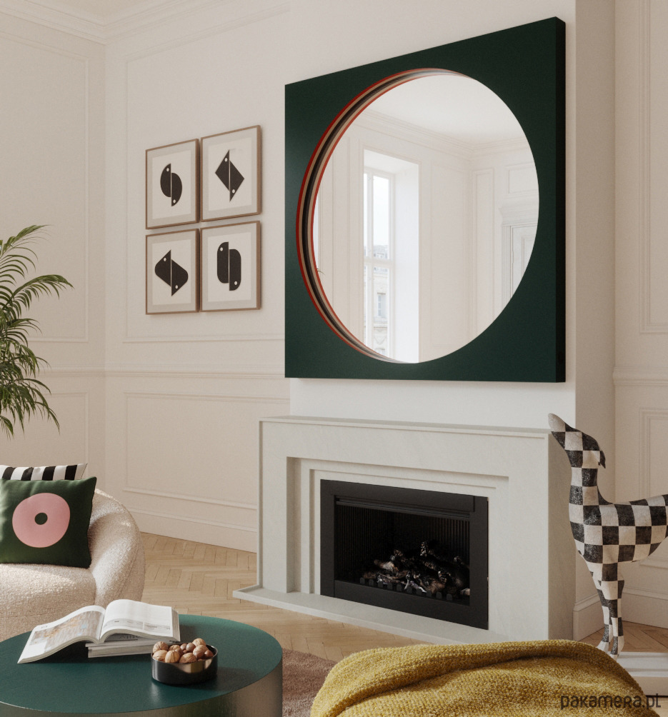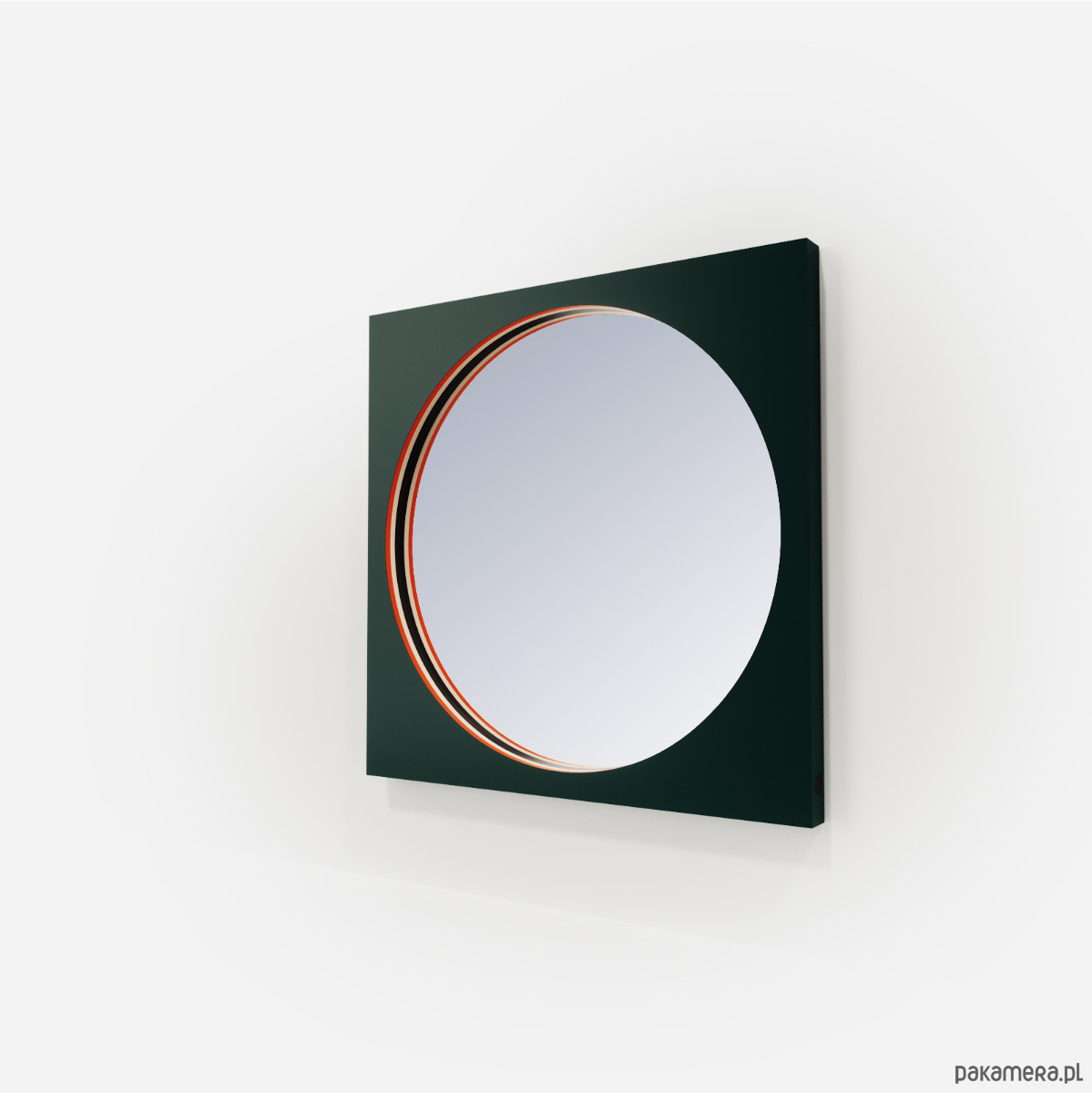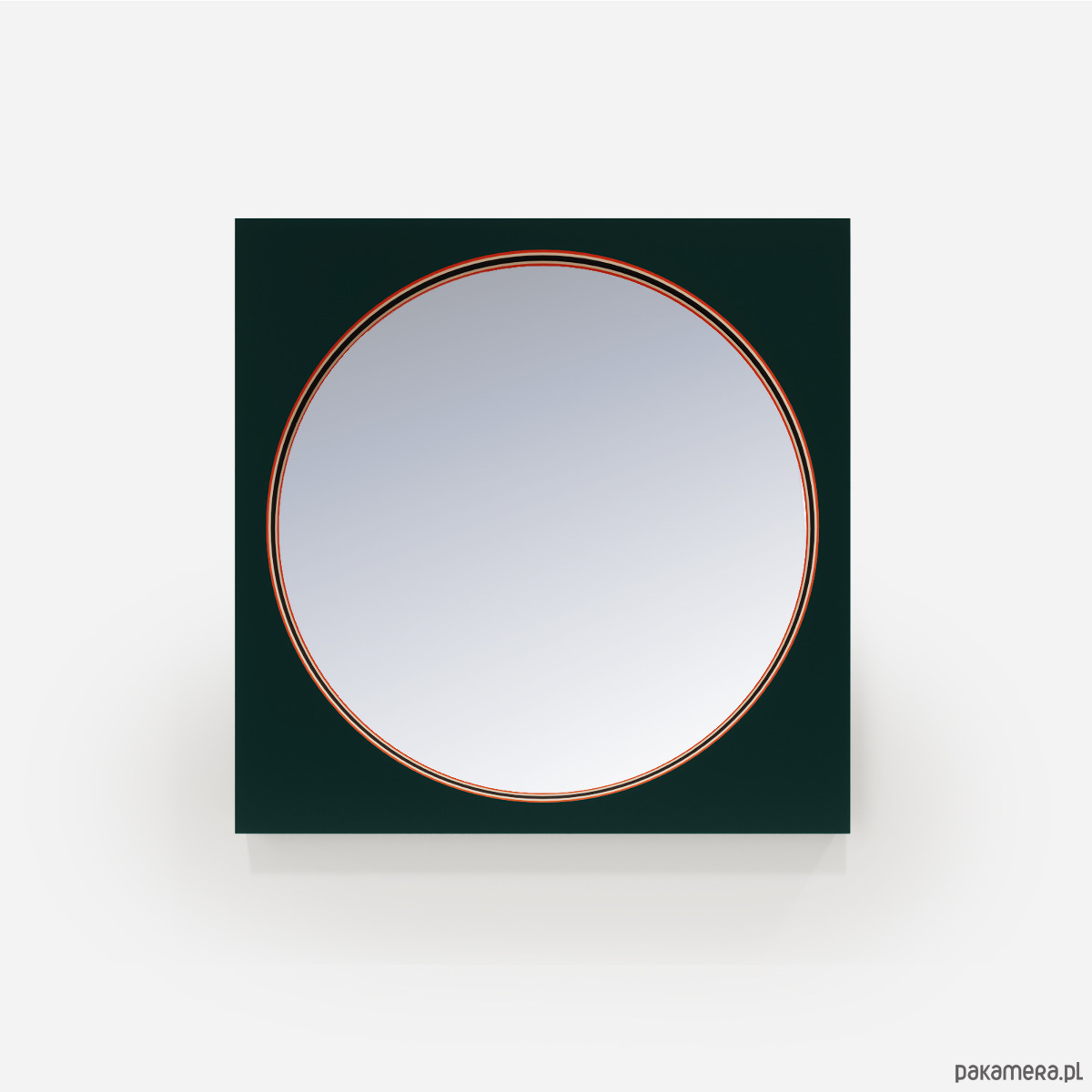 To duże, spektakularne lustro jest klasykiem w nowoczesnej, odważnej odsłonie. Okrągła lustrzana tafla wpisana w przestrzenny kwadrat to format który zostaje w pamięci. Powiększy każde wnętrze – sypialnię, salon czy hall. Sprawdzi się również w łazience. Jego nowoczesny kształt to połączenie minimalistycznego funkcjonalizmu stylu Bauhaus i postmodernistycznej, energetycznej estetyki Grupy Memphis. Wyjątkową formę tworzy geometryczna, przestrzenna rama, wykończona detalem w postaci graficznych pasów w trzech kolorach, które zaskakują, dodają energii i potęgują głębię lustra. Kolory, które wybraliśmy nadadzą wnętrzu charakteru i zdefiniują przestrzeń.