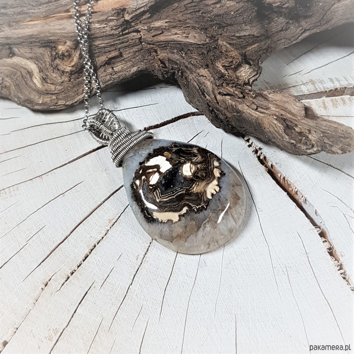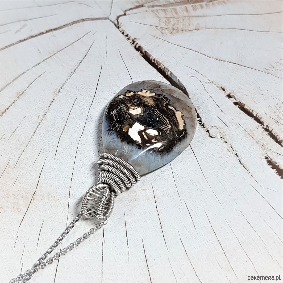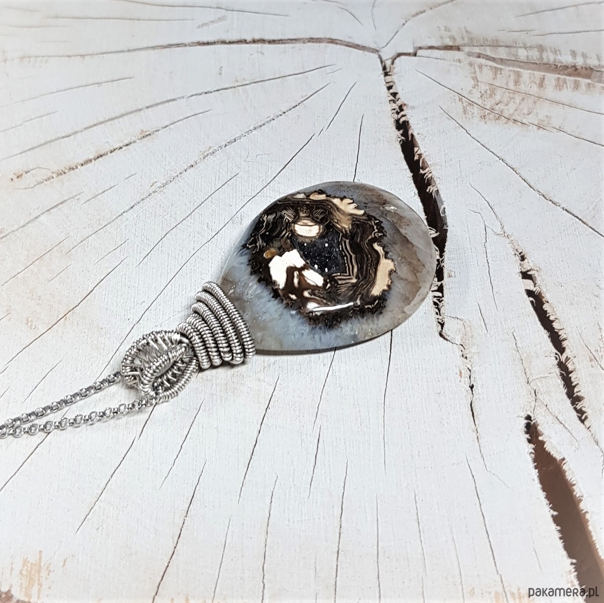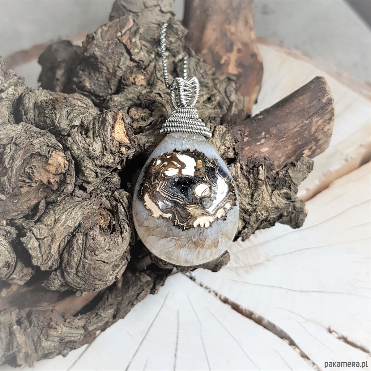 Zawieszka wykonana ręcznie metodą wire-wrappingu której głównym elementem jest wyjątkowy, niepowtarzalny agat z kryształem i piękną czarną druzą pośrodku. Wewnątrz druzy setki kryształków połyskują lustrzanym blaskiem. Do wykonania wisiorka użyłam srebra najwyższej próby 999 które następnie oksydowałam i wypolerowałam w celu uzyskania szlachetnego efektu postarzenia . Wymiary zawieszki 50x28mm z łańcuszkiem długości około 45-50 cm. (s103)