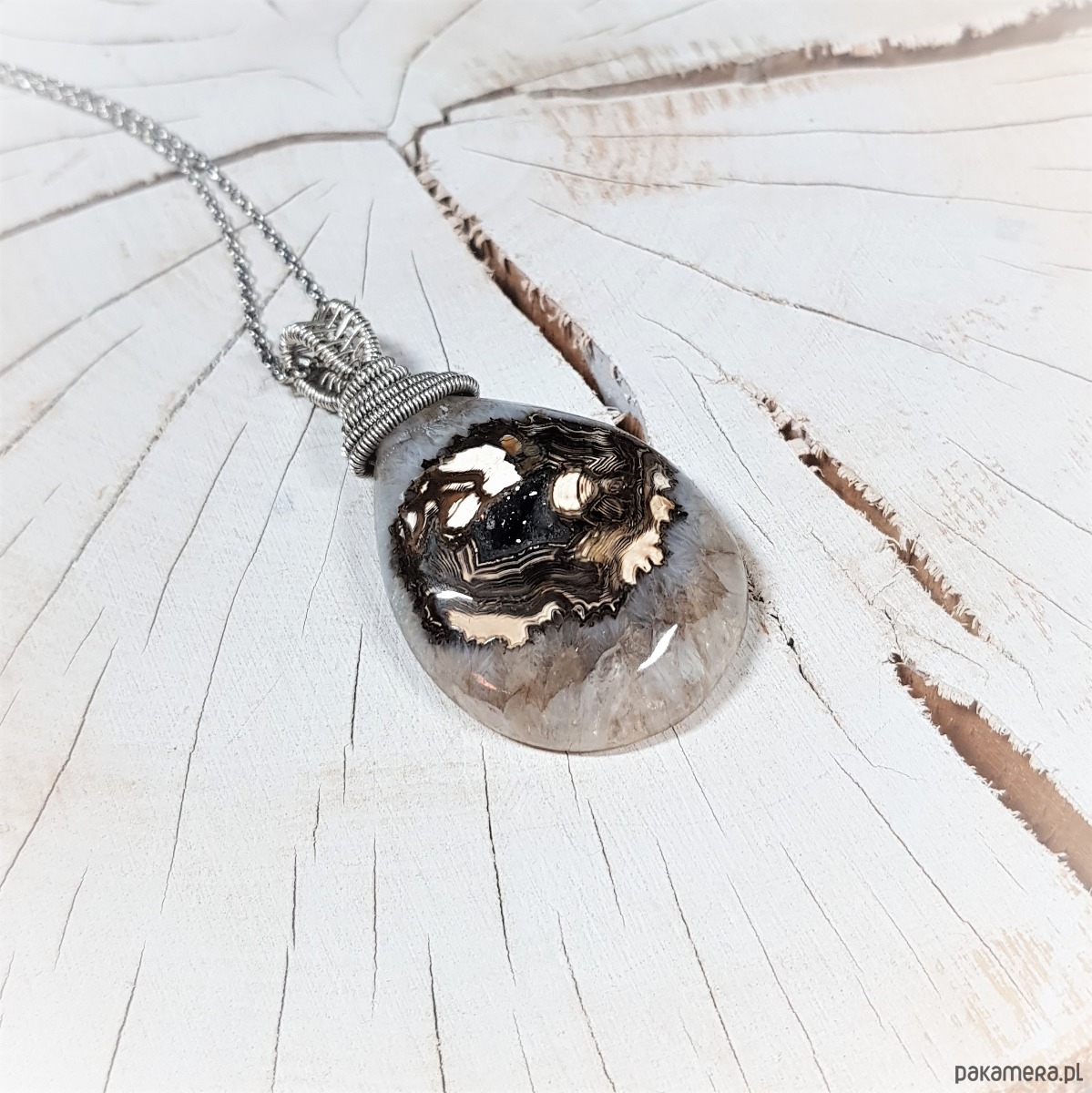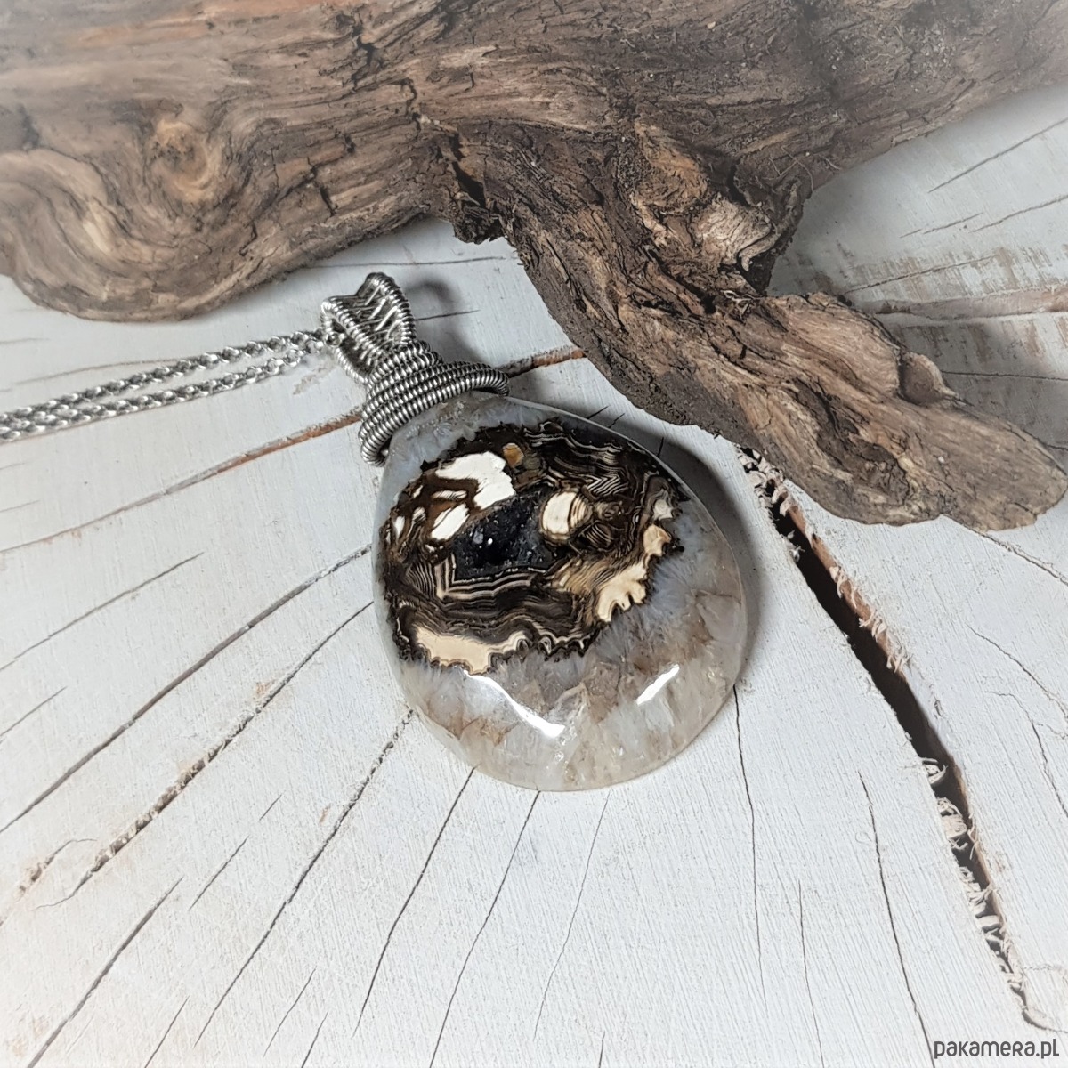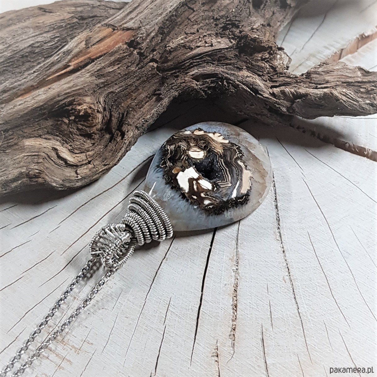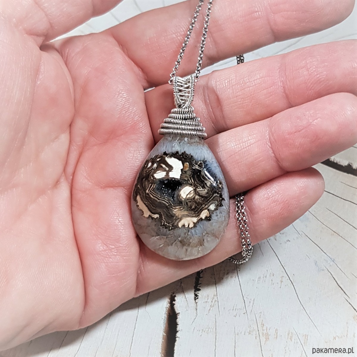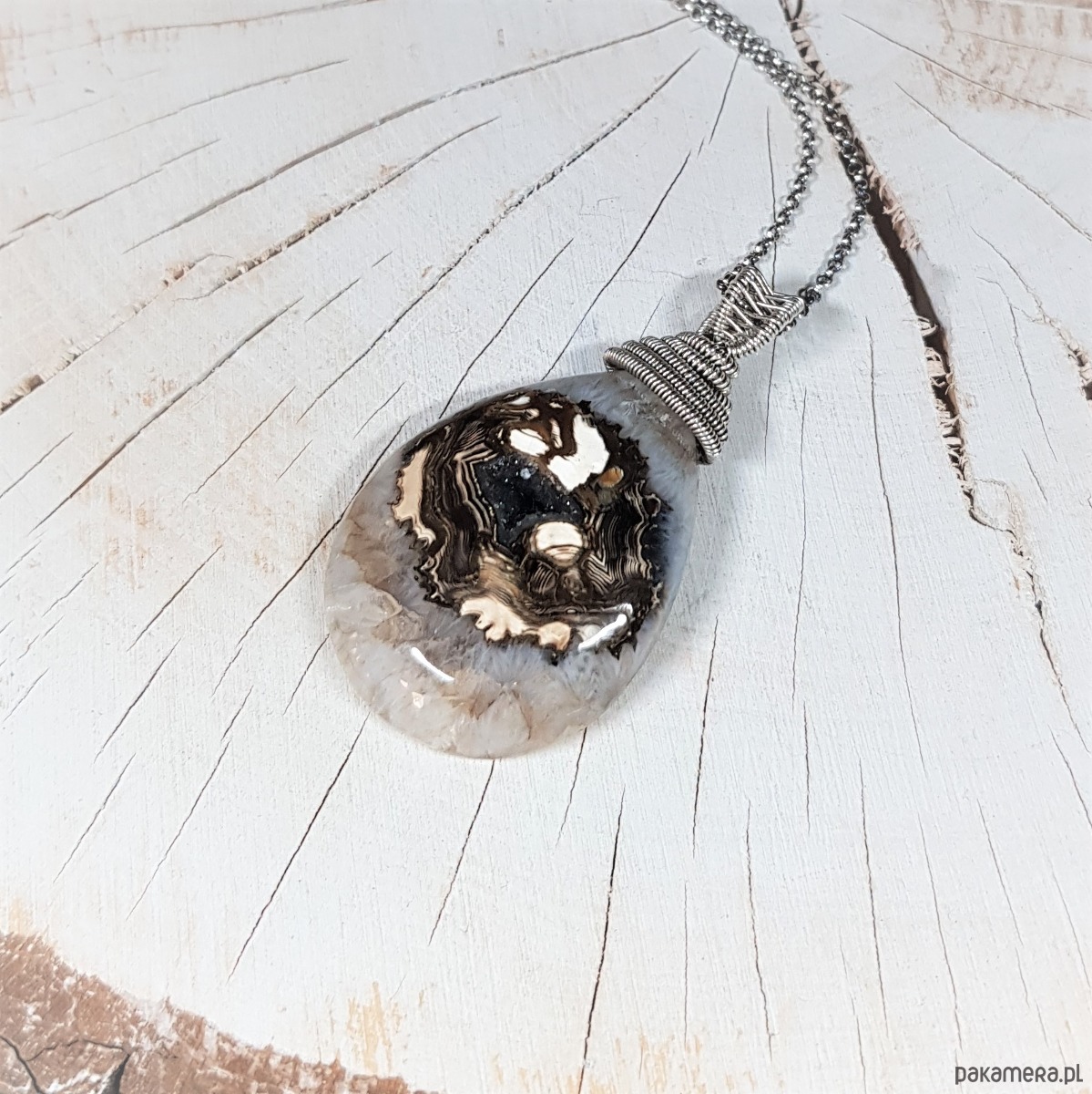 Zawieszka wykonana ręcznie metodą wire-wrappingu której głównym elementem jest wyjątkowy, niepowtarzalny agat z kryształem i piękną czarną druzą pośrodku. Wewnątrz druzy setki kryształków połyskują lustrzanym blaskiem. Do wykonania wisiorka użyłam srebra najwyższej próby 999 które następnie oksydowałam i wypolerowałam w celu uzyskania szlachetnego efektu postarzenia . Wymiary zawieszki 50x28mm z łańcuszkiem długości około 45-50 cm. (s103)