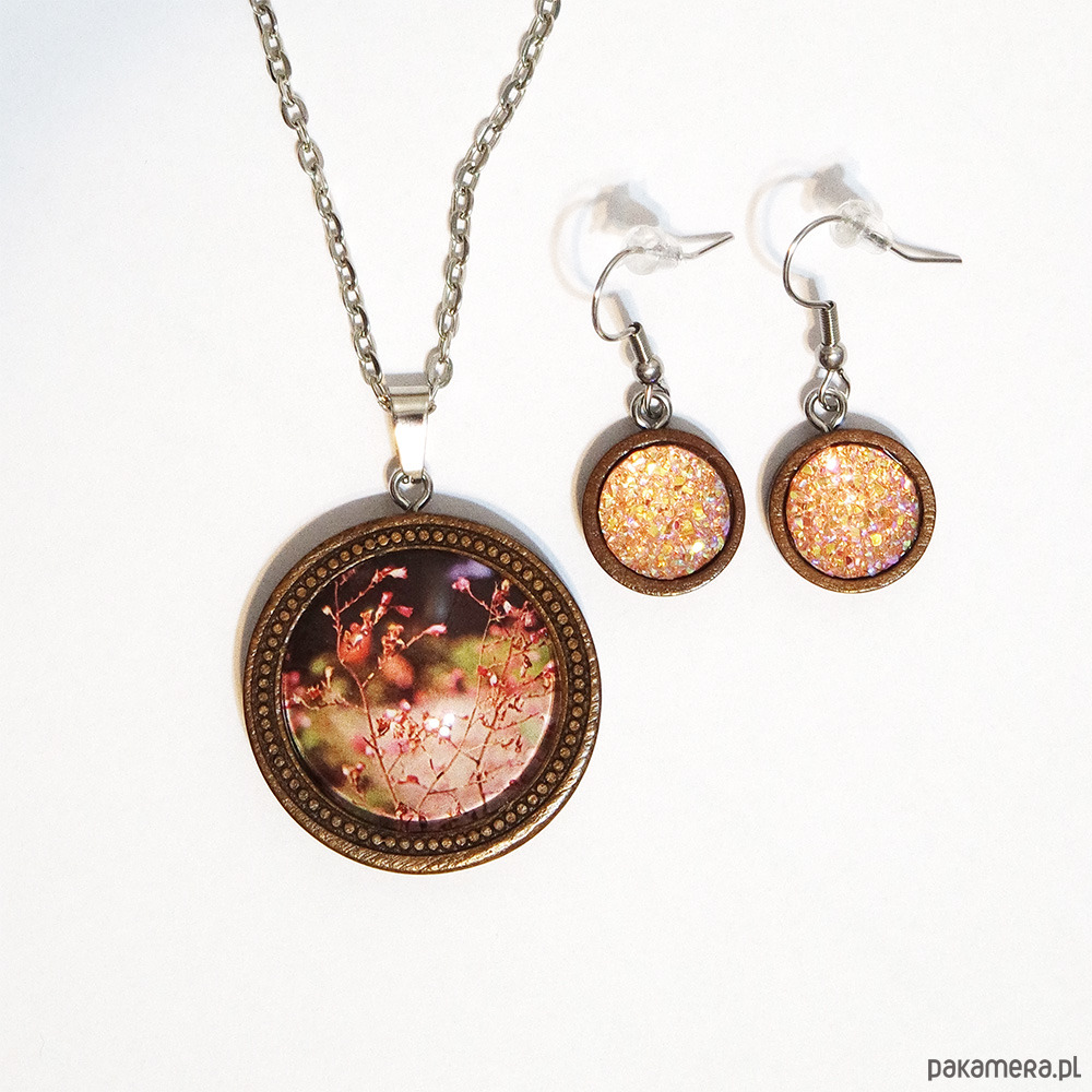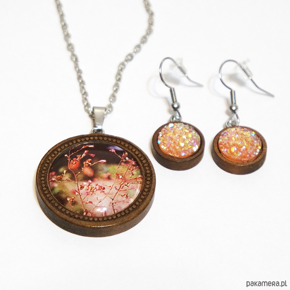 Druzy morelowe, drewno - naszyjnik i kolczyki