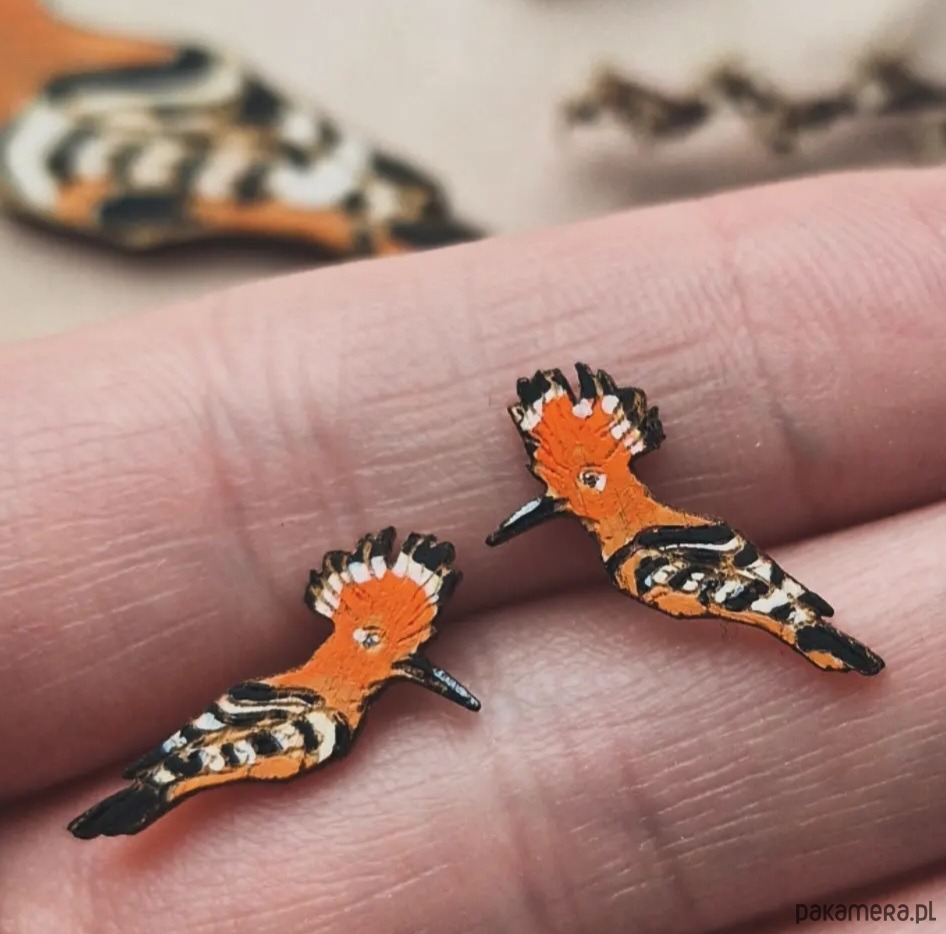 Lekkie kolczyki-sztyfty wycinane według autorskiego rysunku w drewnie i ręcznie malowane. Każda para będzie niepowtarzalna. Wielkość kolczyków ok 1cm. Sztyfty nie uczulą, bo są z silikonu!