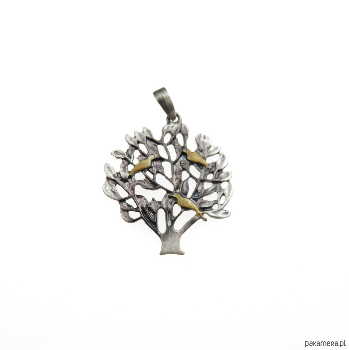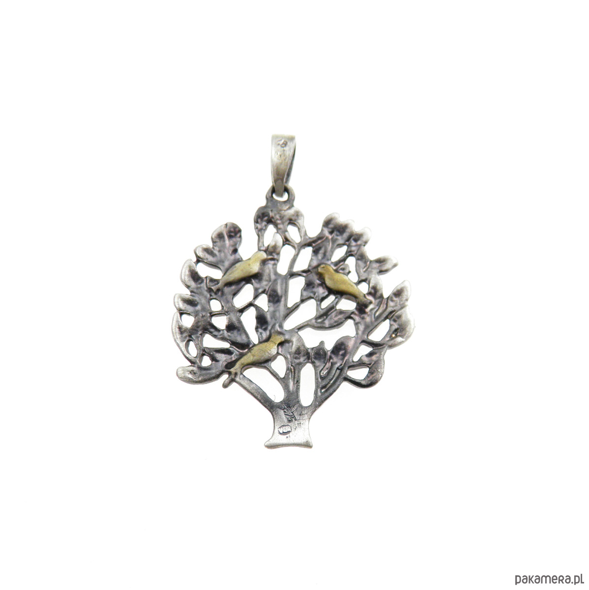 Zawieszka wykończona oksydą grafitową, ptaszki pomalowane złotem.