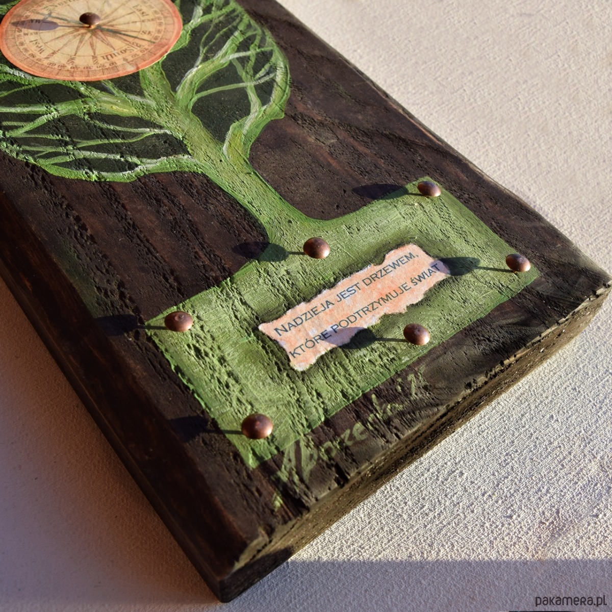 Obraz - abstrakcyjne drzewo - wykonany w technice mieszanej na kawałku deski sosnowej (tło jest bejcowane, drzewo malowane farbami akrylowymi). W projekcie wykorzystane są również sosnowe listewki, pinezki oraz elementy collage. Słowa cytatu przypisywane są Pliniuszowi Starszemu.
