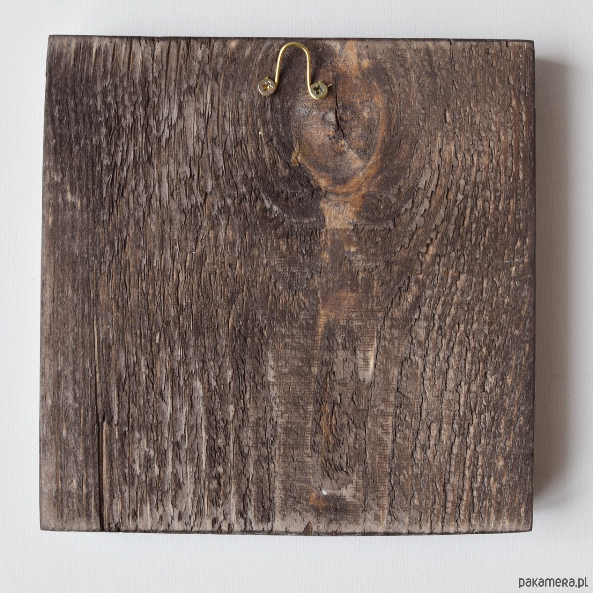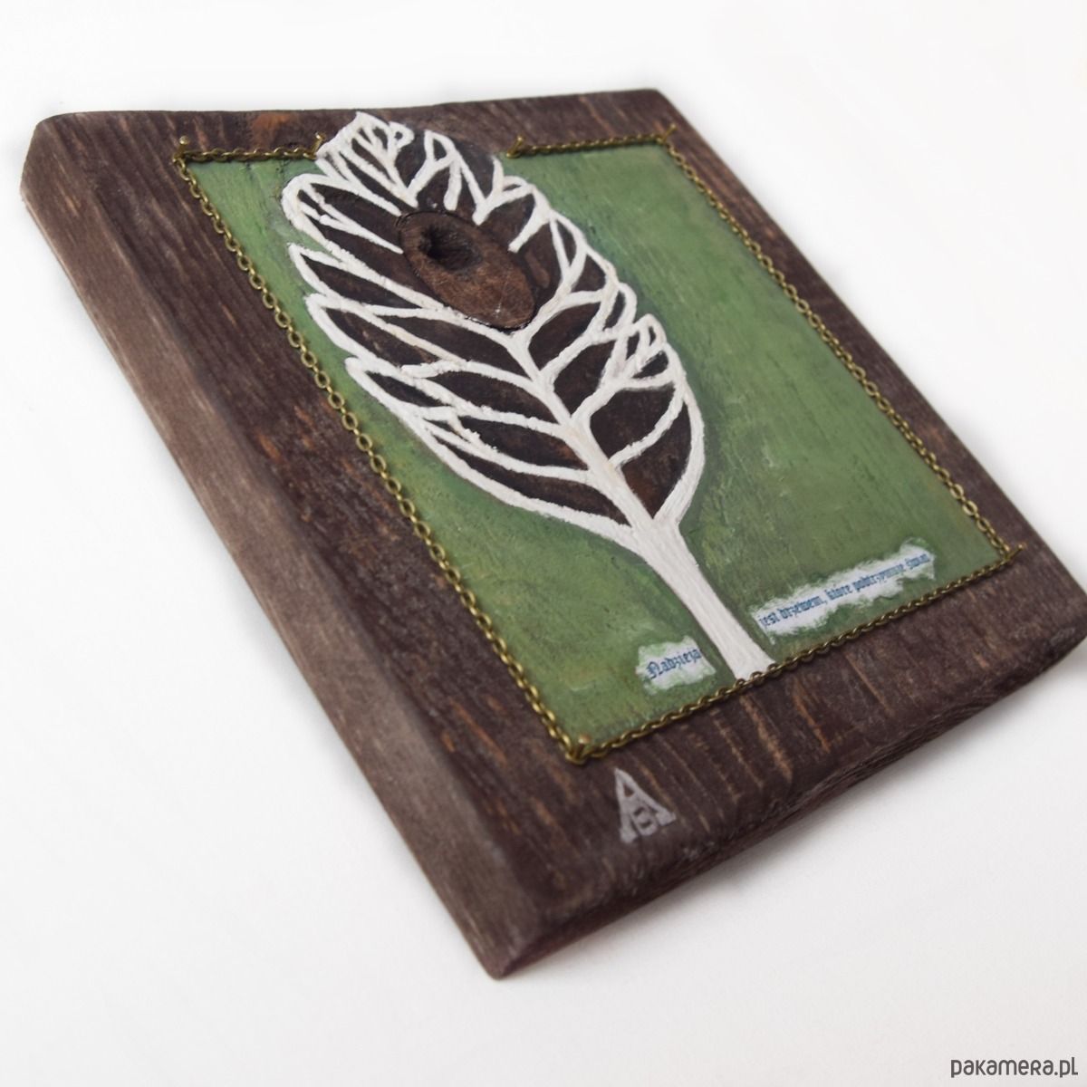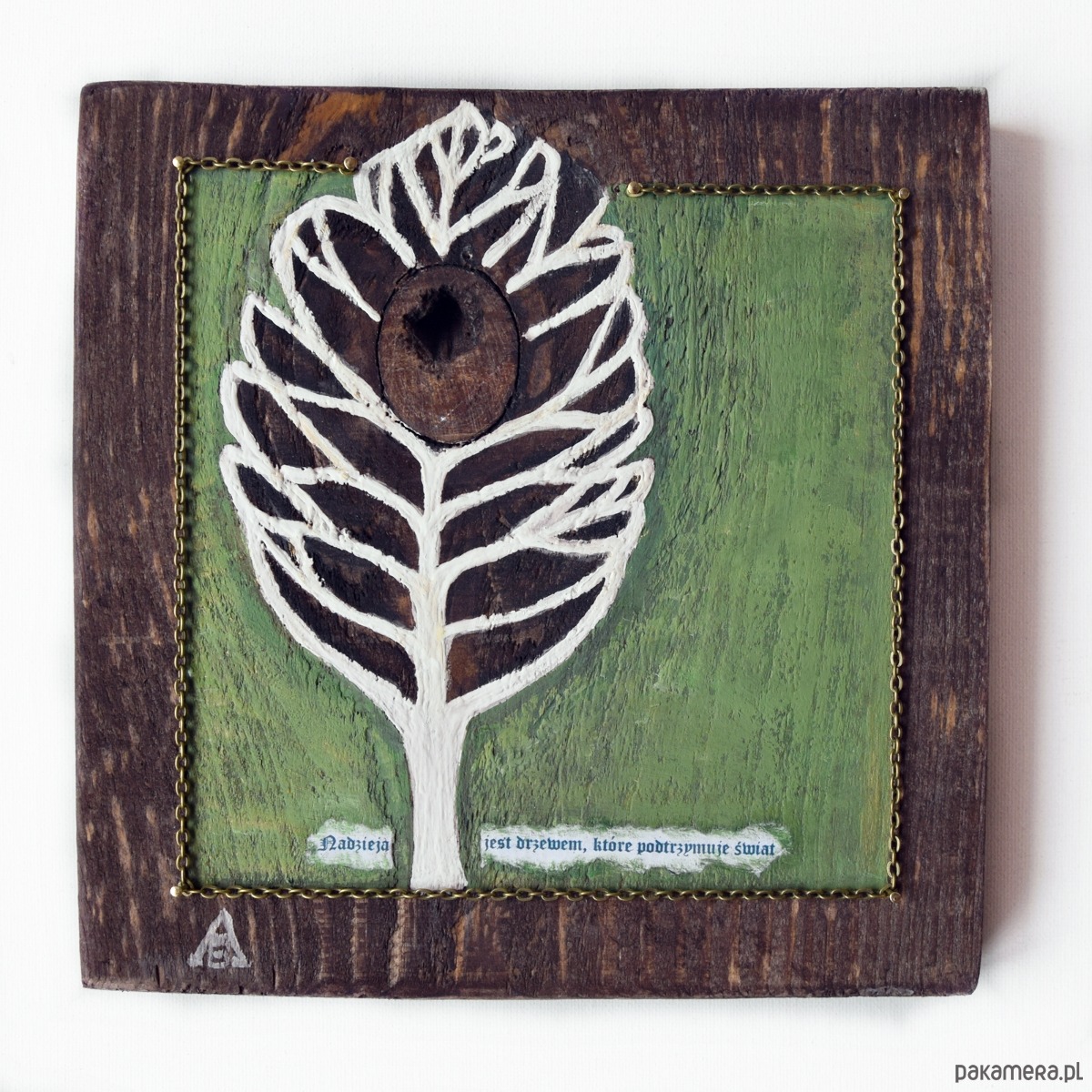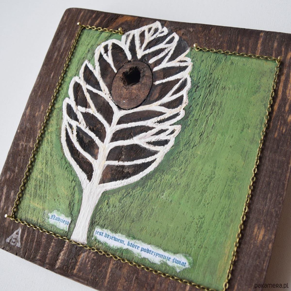 Obraz wykonany w technice mieszanej na kawałku deski sosnowej (bejca, collage-cytat, farby akrylowe). W projekcie wykorzystany jest również łańcuszek w kolorze starego mosiądzu i gwoździe. Słowa cytatu przypisywane są Pliniuszowi Starszemu.