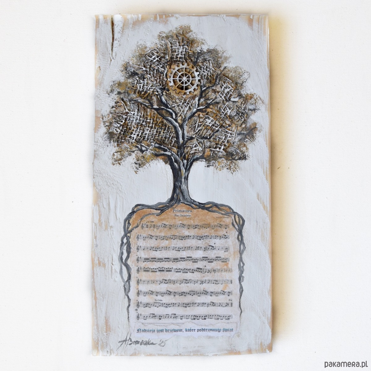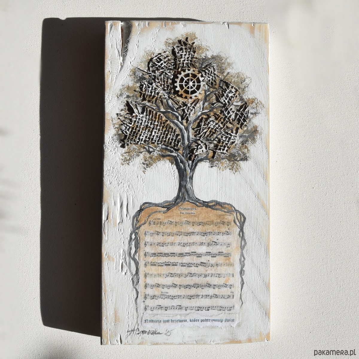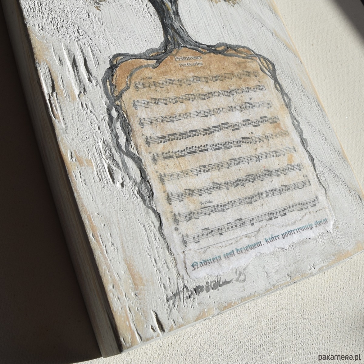 Obraz-miniatura malowany farbami akrylowymi na kawałku deski sosnowej. W projekcie wykorzystane są również kawałki tkaniny jutowej, drewniany dekor - koło, element collage (nuty - Wiosna z Czterech Pór Roku Vivaldiego) oraz cytat - przypisywany Pliniuszowi Starszemu.