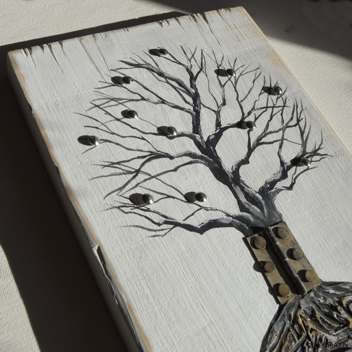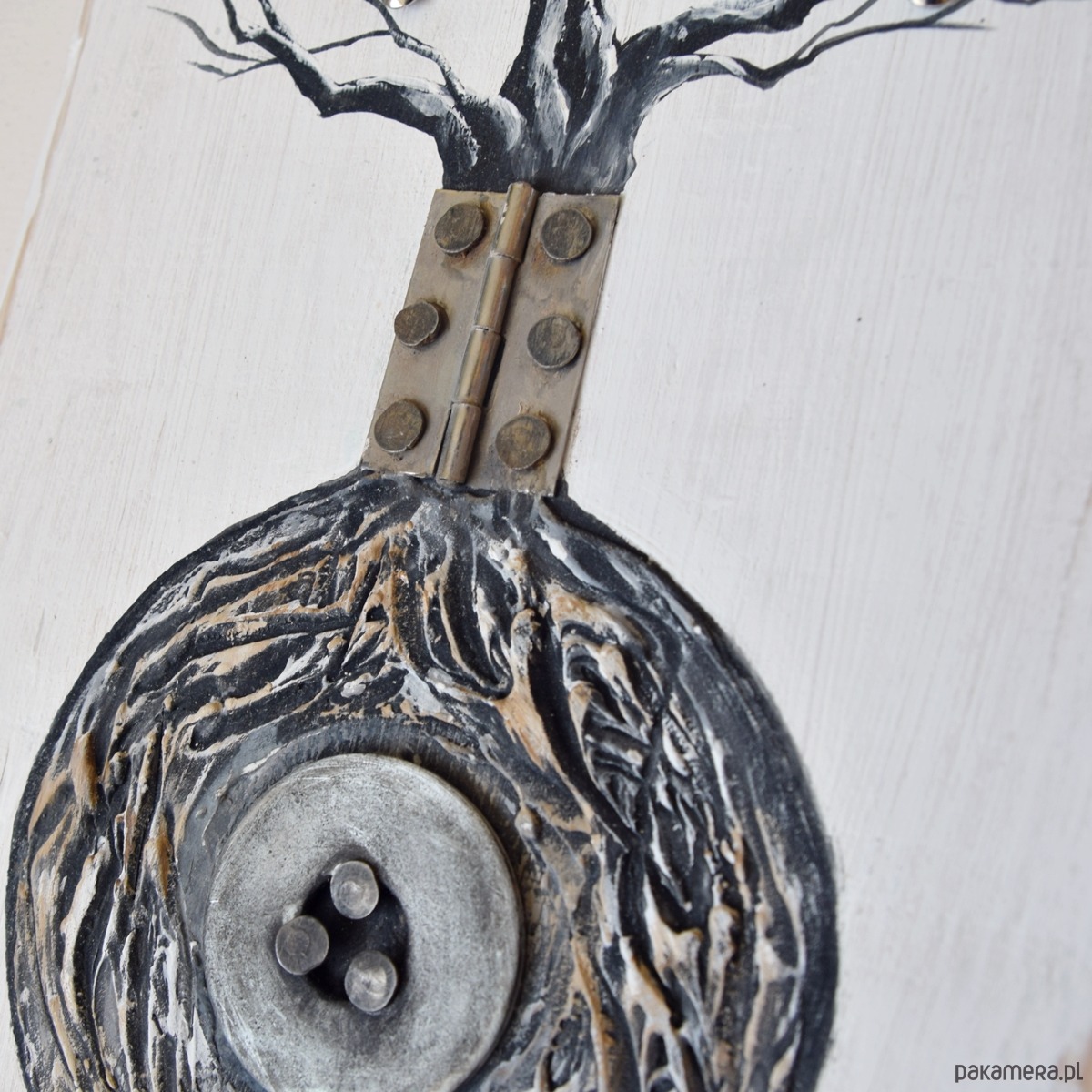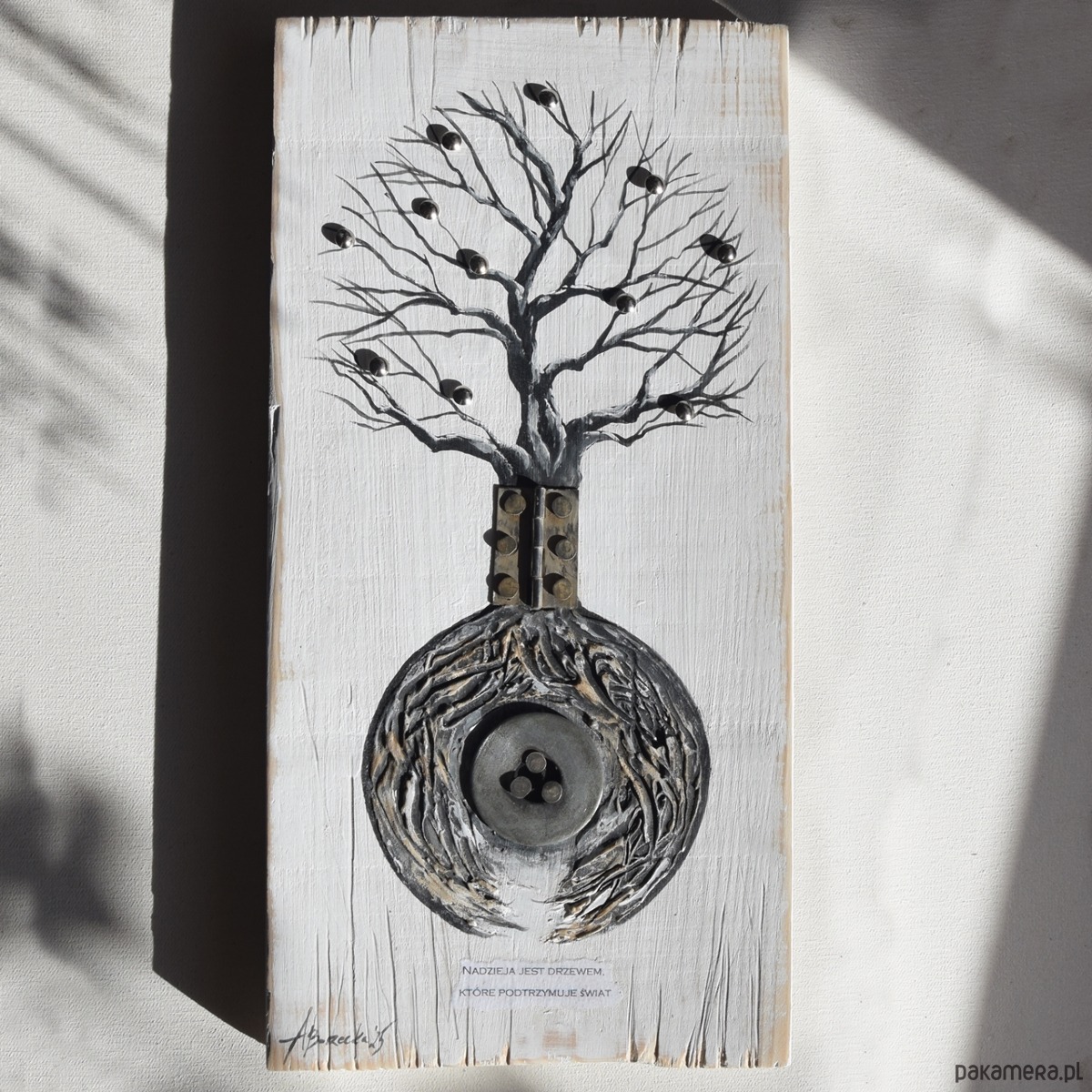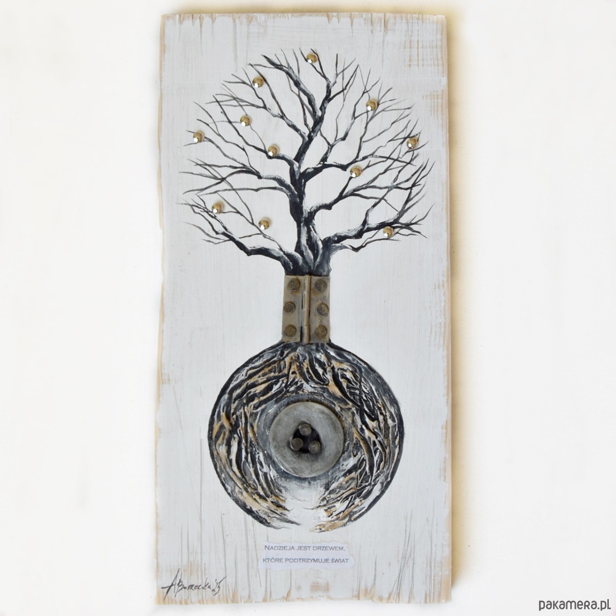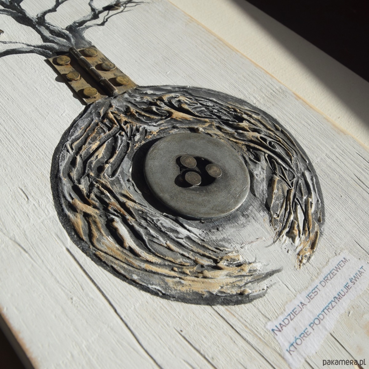 Obraz w technice mieszanej, malowany farbami akrylowymi na kawałku deski sosnowej. W projekcie wykorzystane są również metalowe elementy industrialne - zawias, gwoździe, podkładka, pinezki, oraz cytat - przypisywany Pliniuszowi Starszemu.