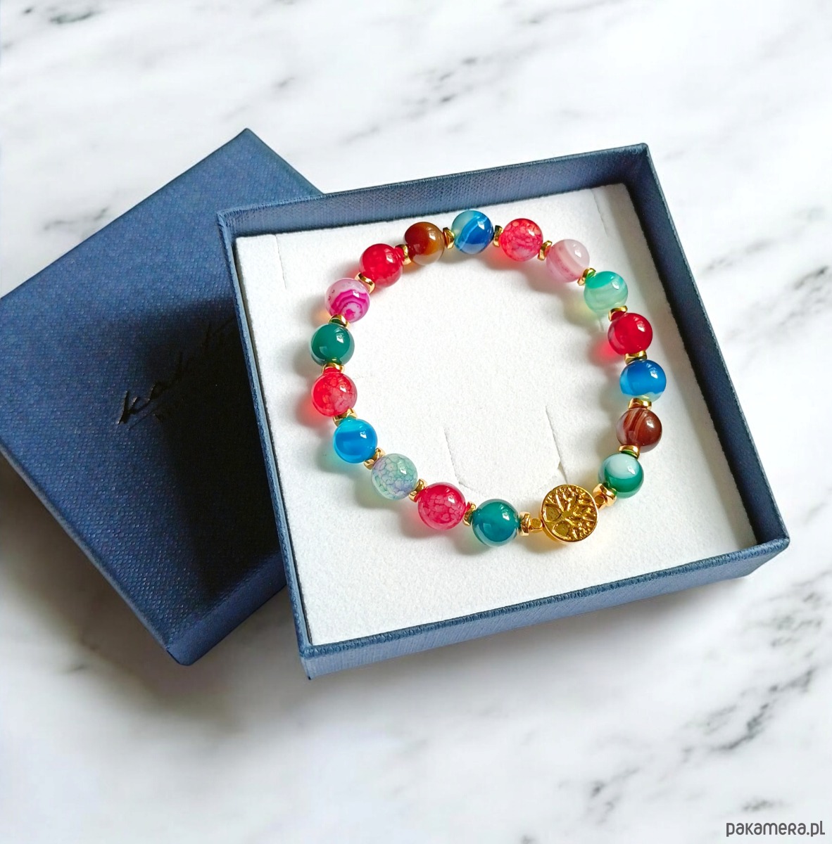 śliczna bransoletka na solidnej lince elastycznej, wykonana z wielobarwnego agatu 8mm oraz przekładek i drzewa ze złotego hematytu.