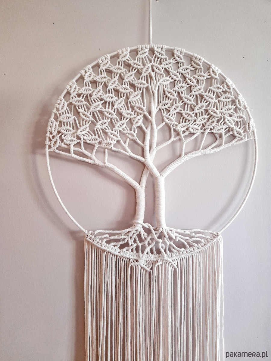 Drzewko życia zaplecione na metalowej obręczy o średnicy 60 cm. Wykonane ze sznurka plecionego w kolorze naturalnym.