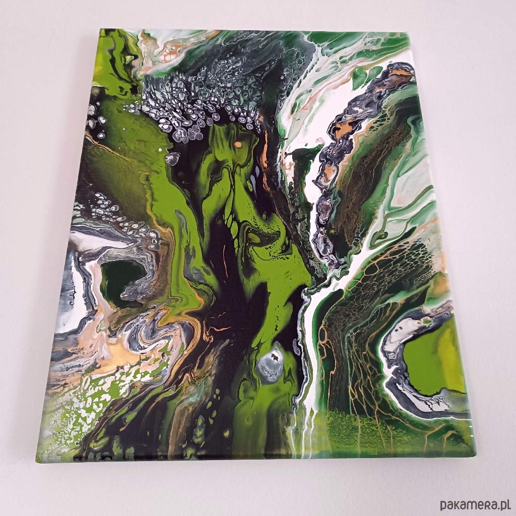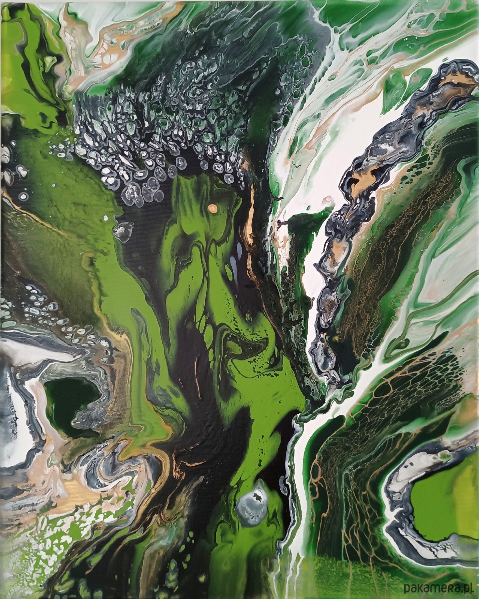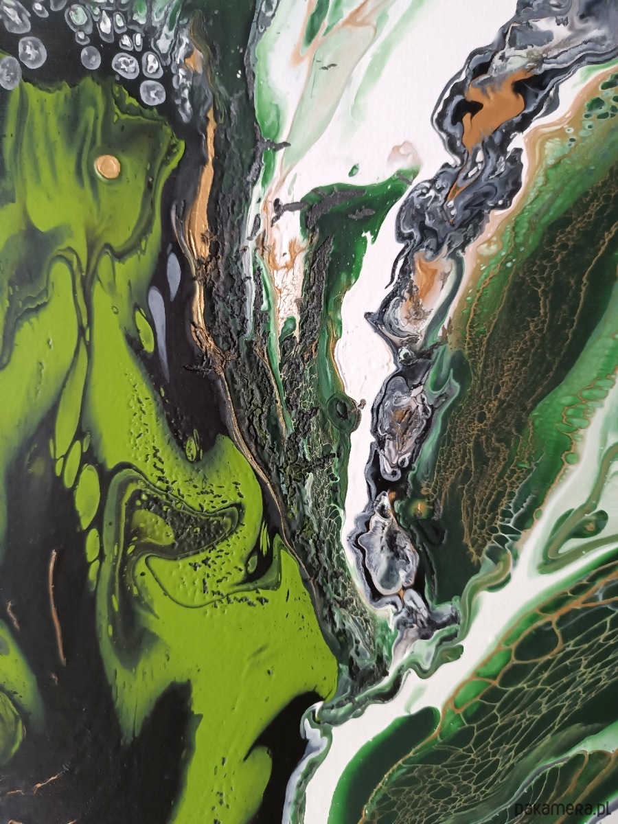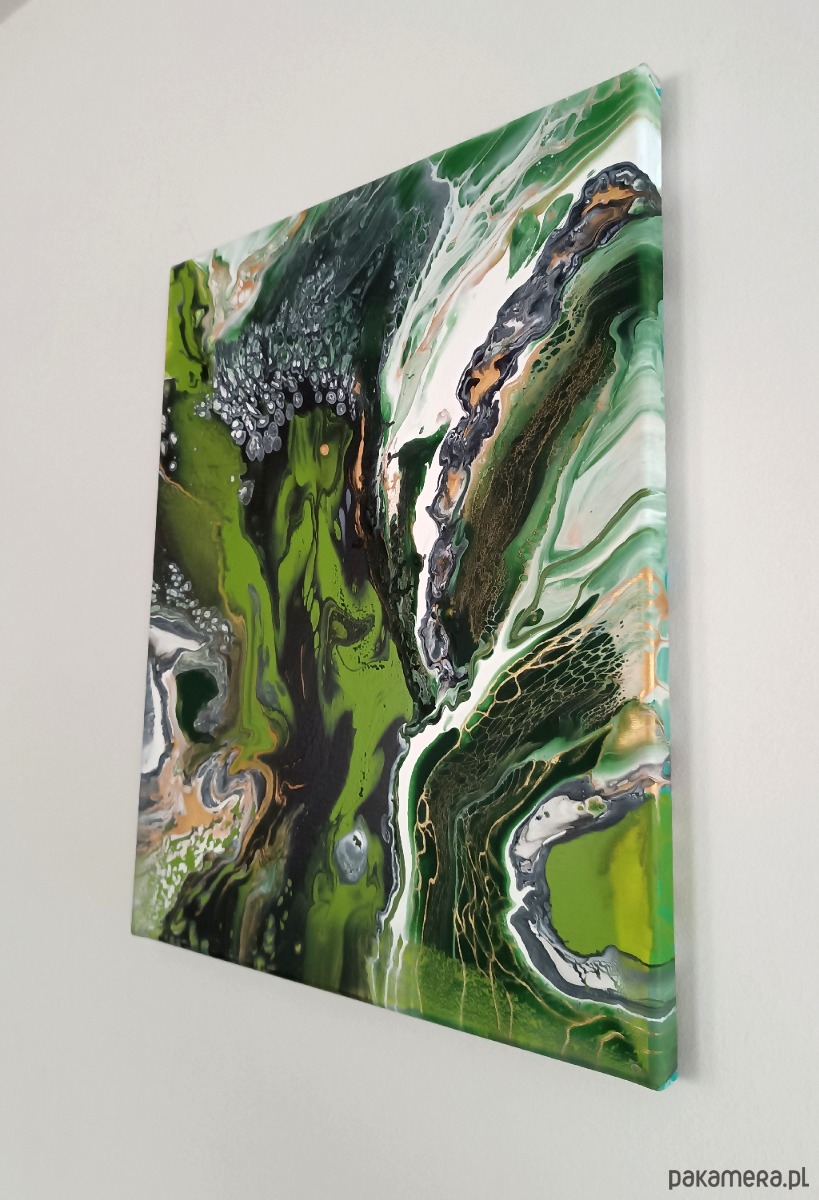 Obraz malowany farbami akrylowymi na dobrej jakości podobraziu bawełnianym, zabezpieczony werniksem. Nierówności i spękania uzyskane zostały przy zastosowaniu techniki pouringu, czyli operowania farbami w stanie ciekłym. Sygnowany z boku podobrazia i podpisany z tyłu. Boki są przedłużeniem obrazu - gotowy do powieszenia bez ramy.