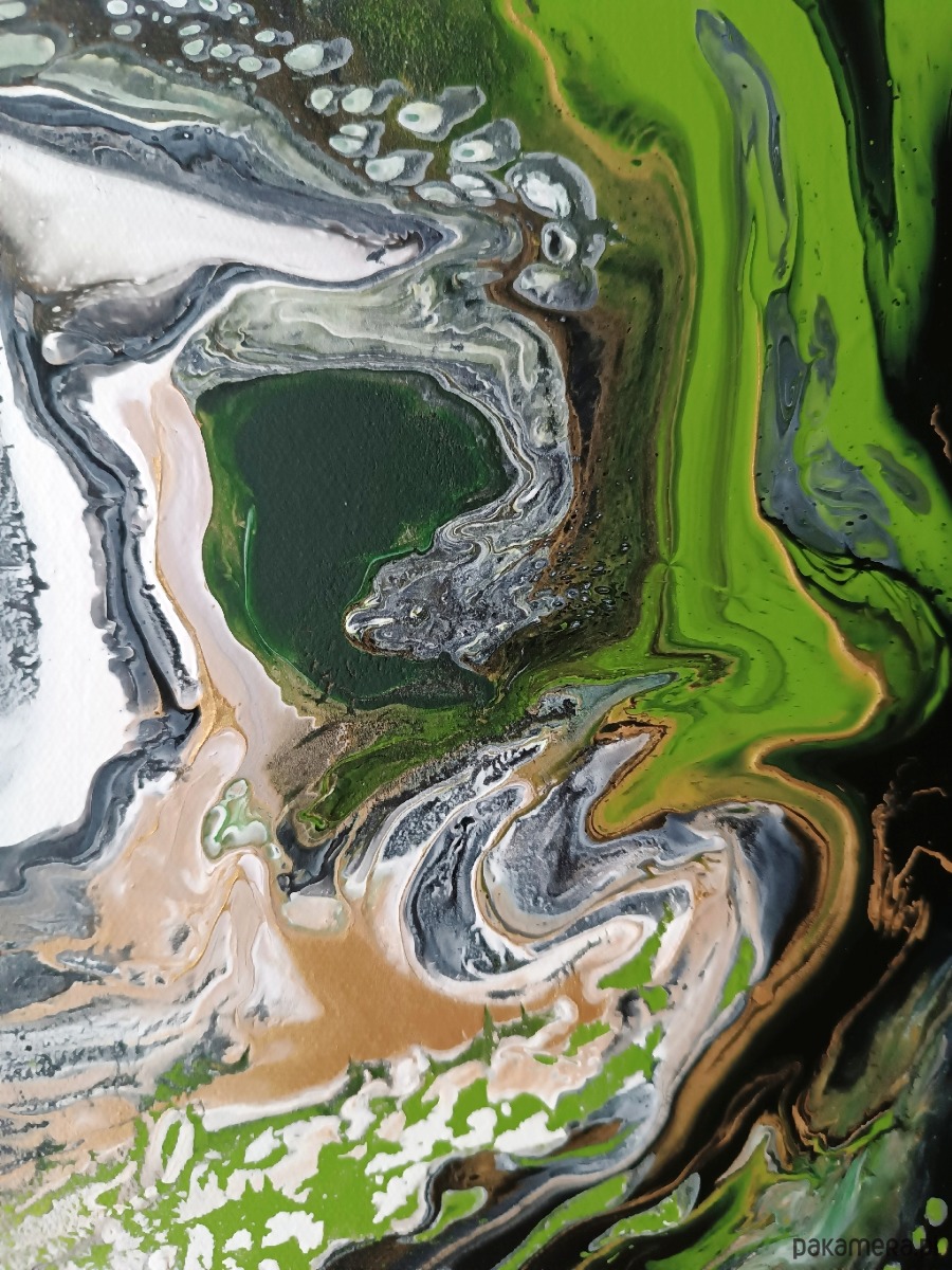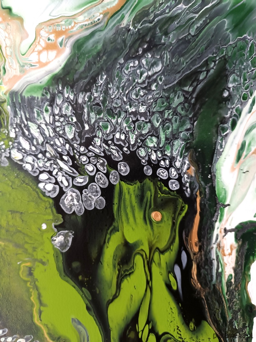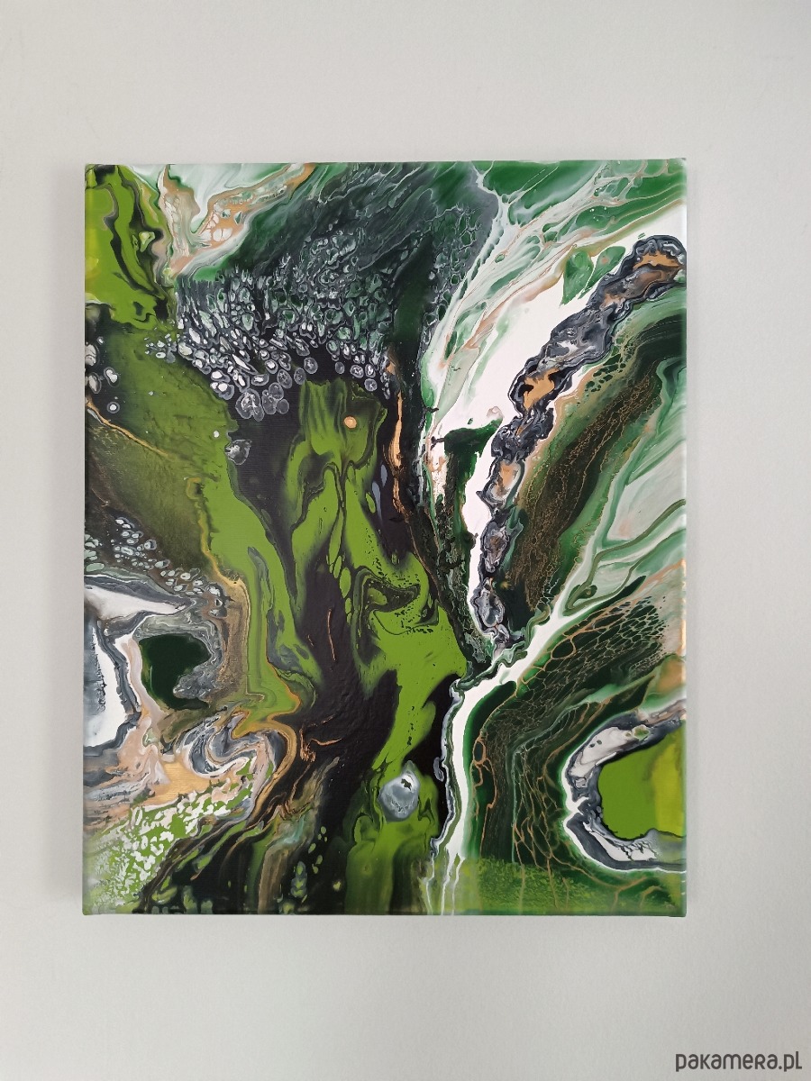Obraz malowany farbami akrylowymi na dobrej jakości podobraziu bawełnianym, zabezpieczony werniksem. Nierówności i spękania uzyskane zostały przy zastosowaniu techniki pouringu, czyli operowania farbami w stanie ciekłym. Sygnowany z boku podobrazia i podpisany z tyłu. Boki są przedłużeniem obrazu - gotowy do powieszenia bez ramy.