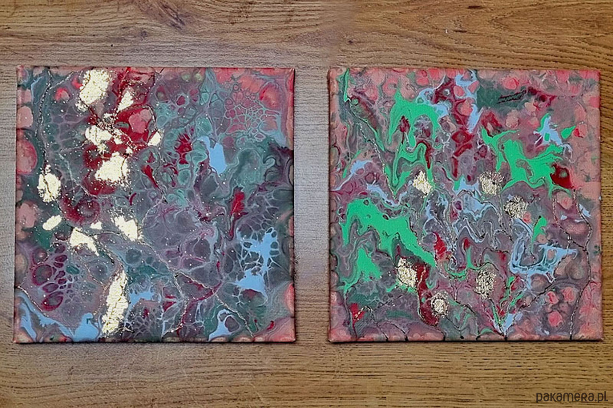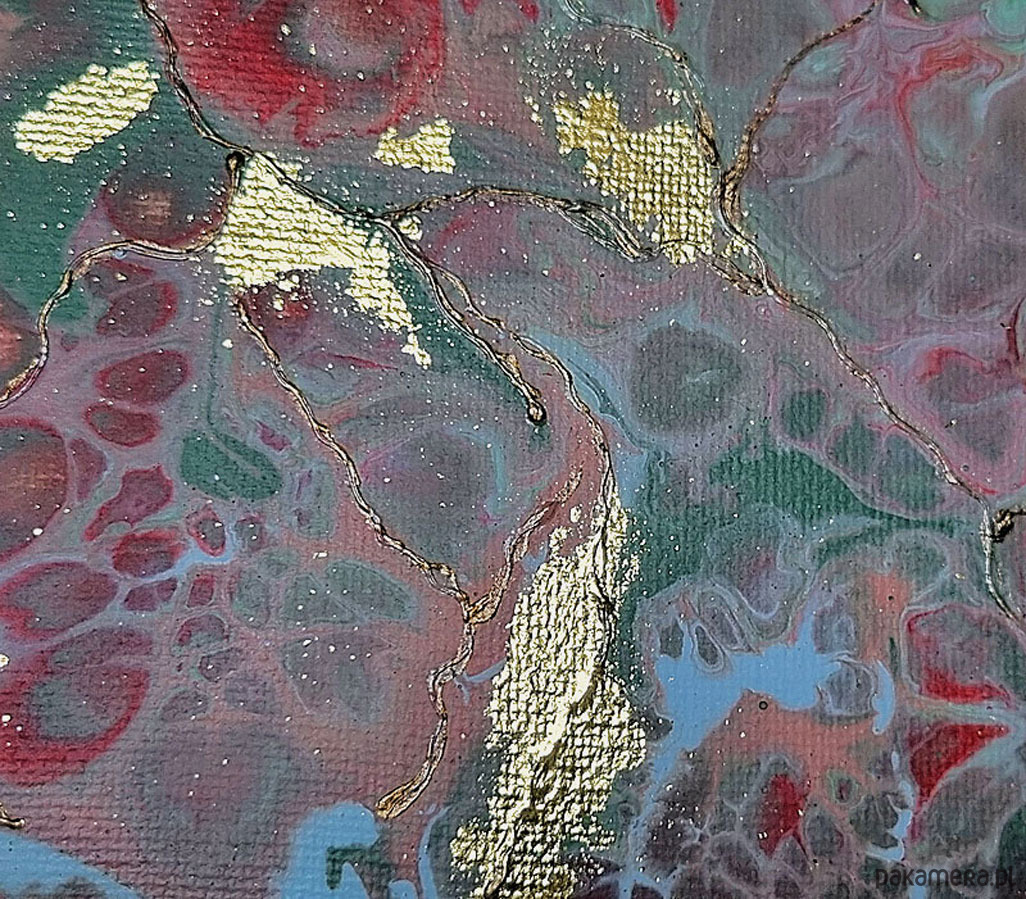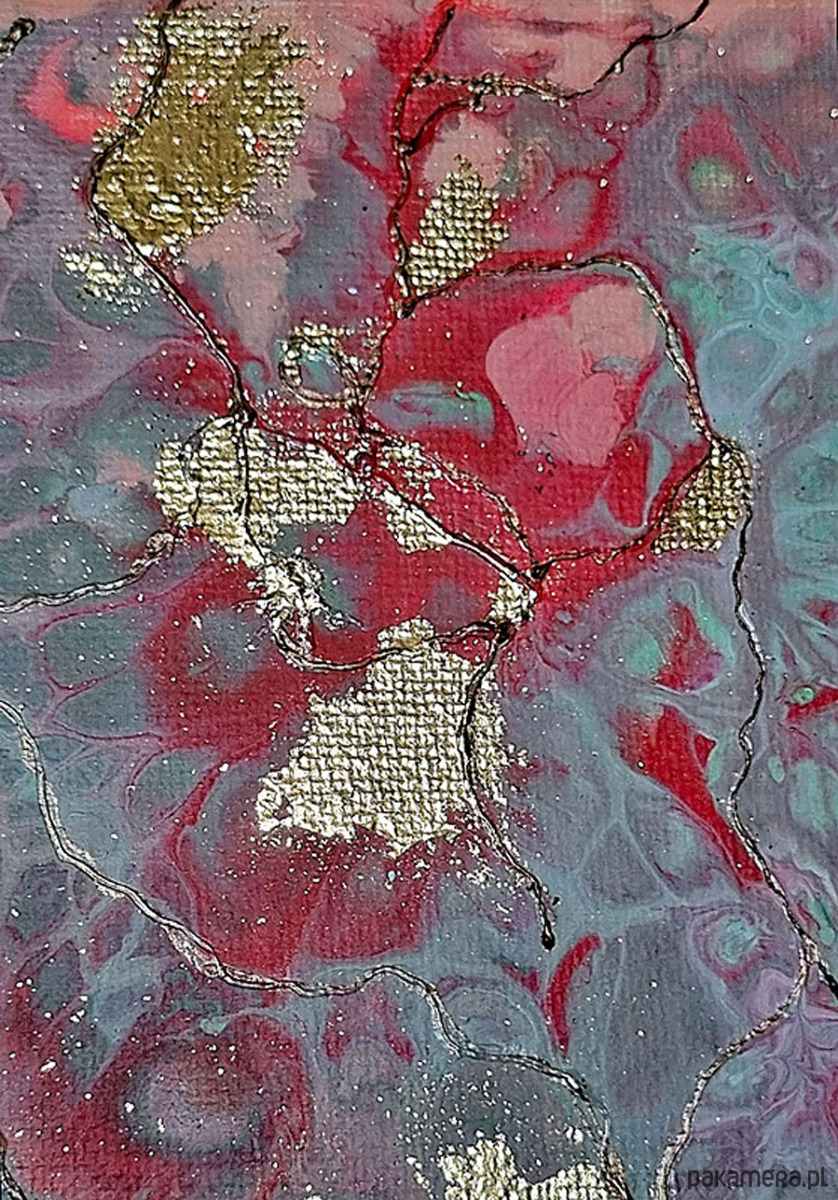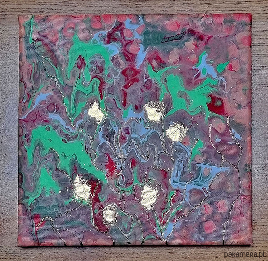Duet miniatur wykonanych metoda pouringu, czyli wylewania farb i neuroartu, okraszonych odrobiną złota. Niczym złote progi u wejścia do magicznej krainy - gdy działa wyobraźnia. Idealnie się uzupełniają .