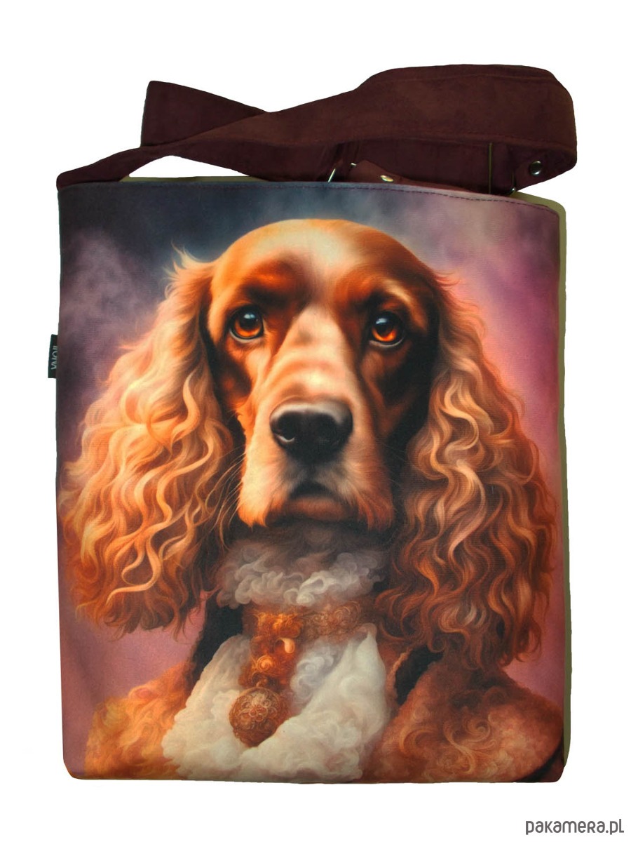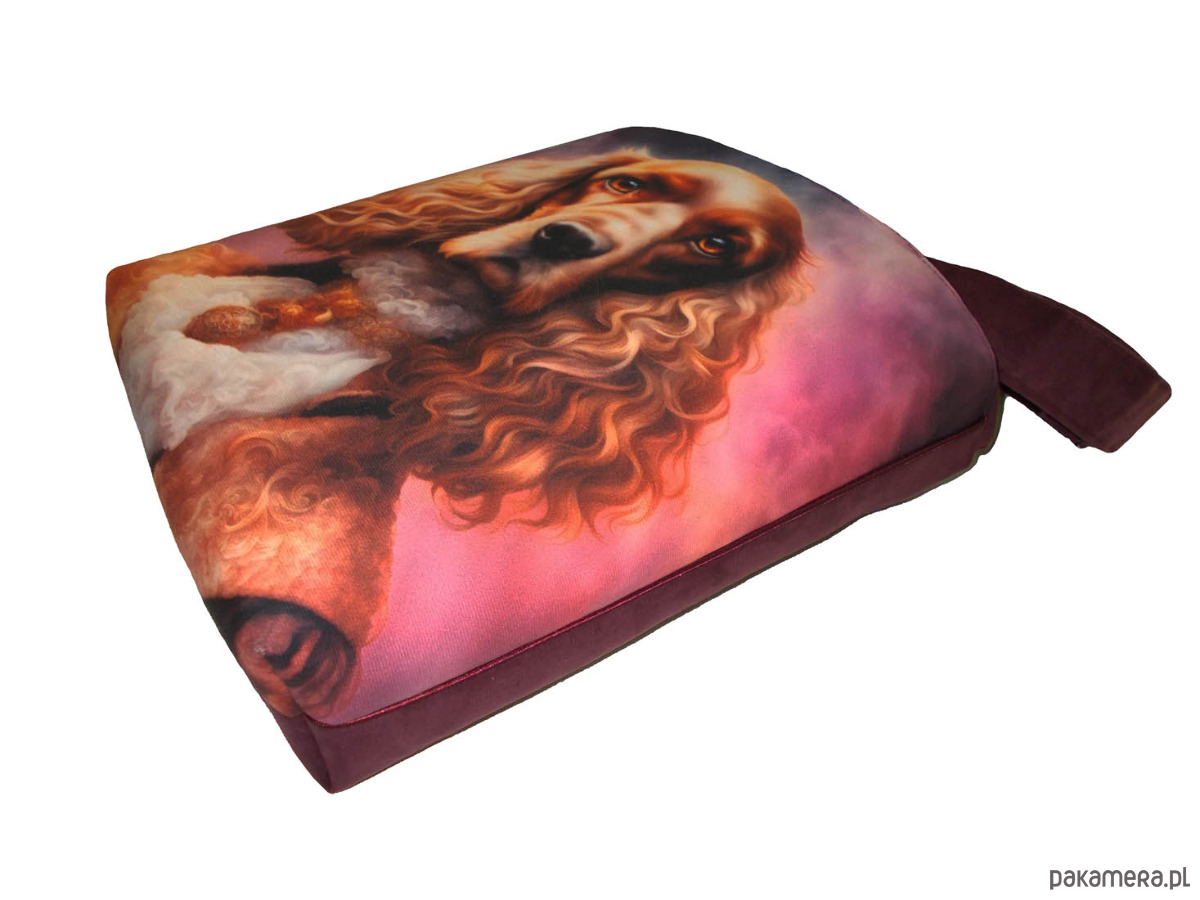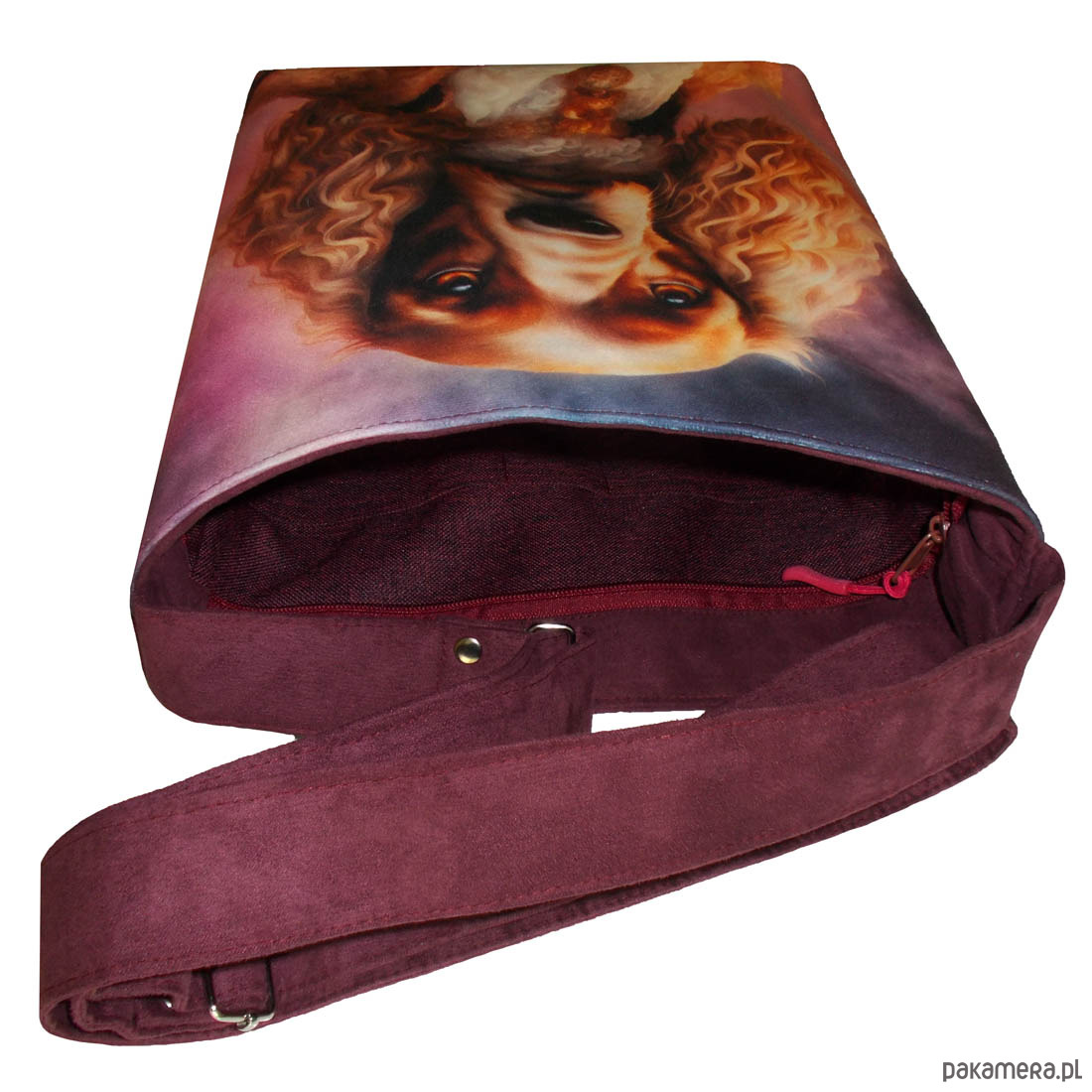 Autorska torba z usztywnionego eko zamszu, zapinana na zamek. Przód z weluru tapicerskiego. Pasek regulowany. Tył w kolorze paska (burgund). Torba trzyma fason. Wewnątrz dwie kieszenie - jedna na zamek, druga z miejscem na telefon i coś jeszcze. W szwach wypustka. Denko poszerzone. szerokość 32cm wysokość 30cm plus denko 8cm