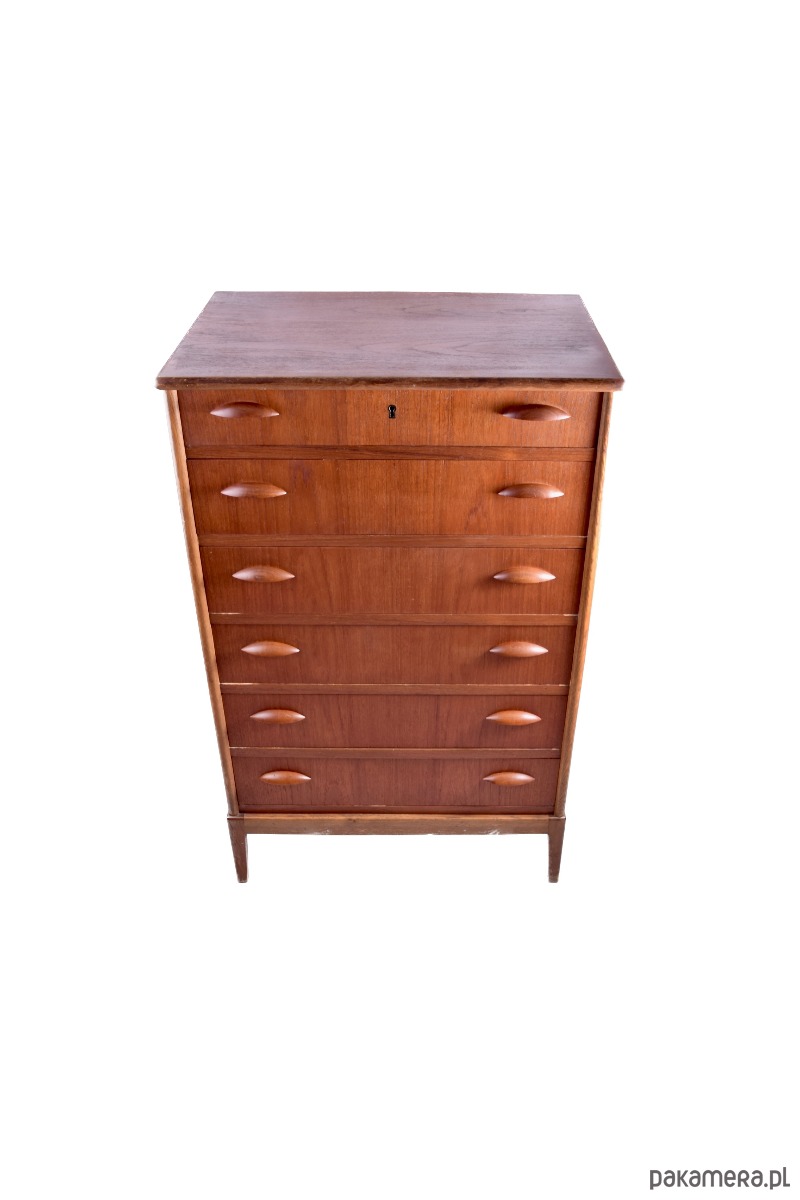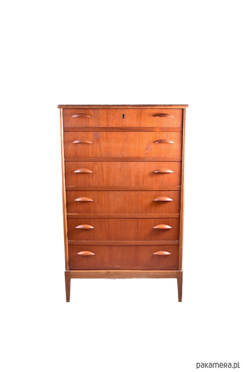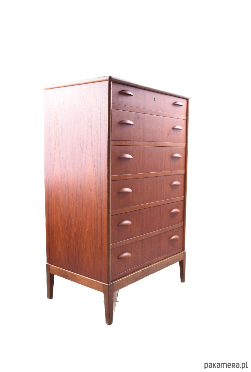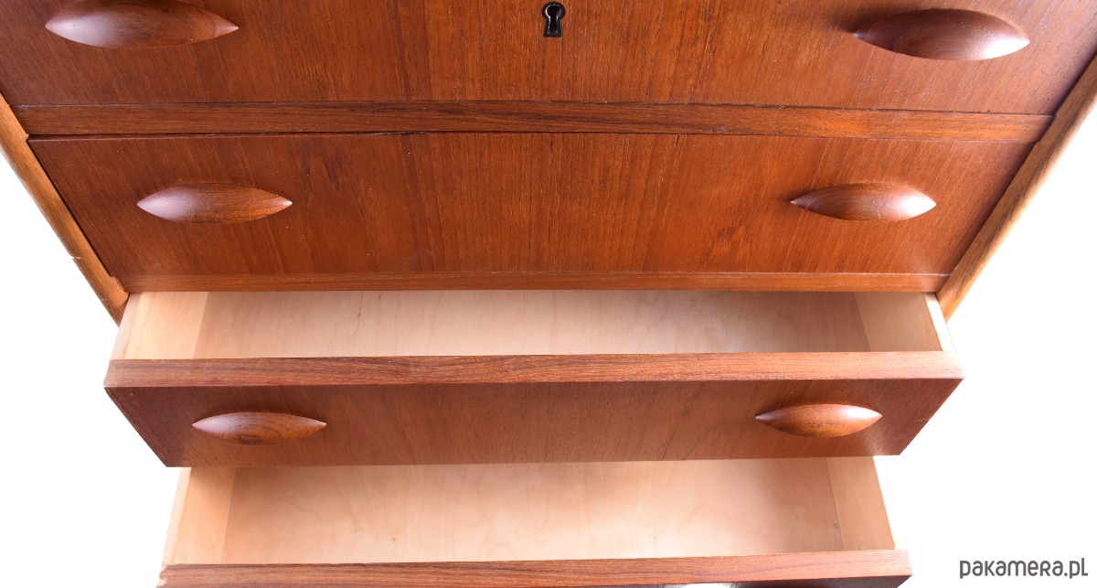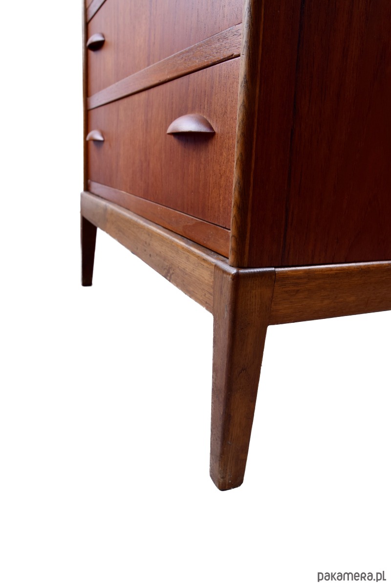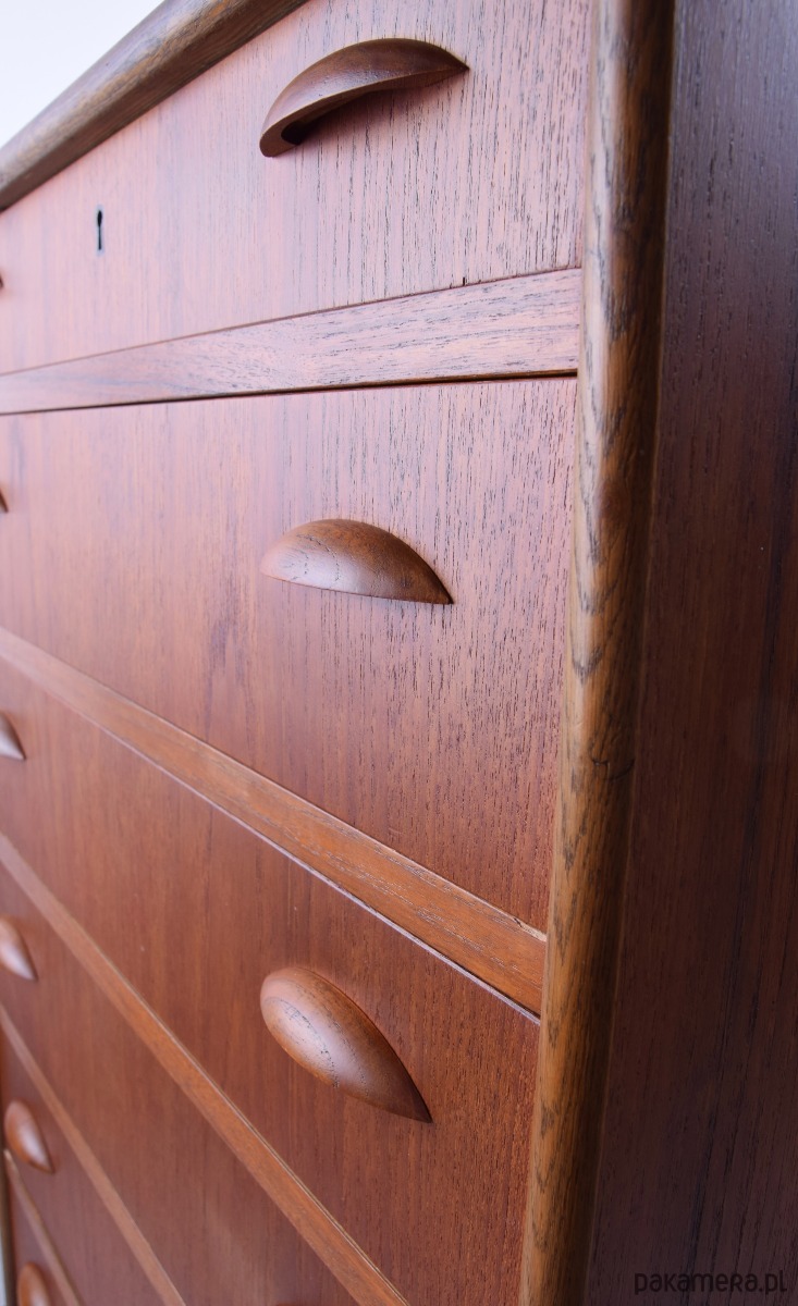 Komoda w stylu duńskiego modernizmu z lat 60., wykonana z naturalnego forniru teakowego o pięknym, głębokim rysunku drewna.