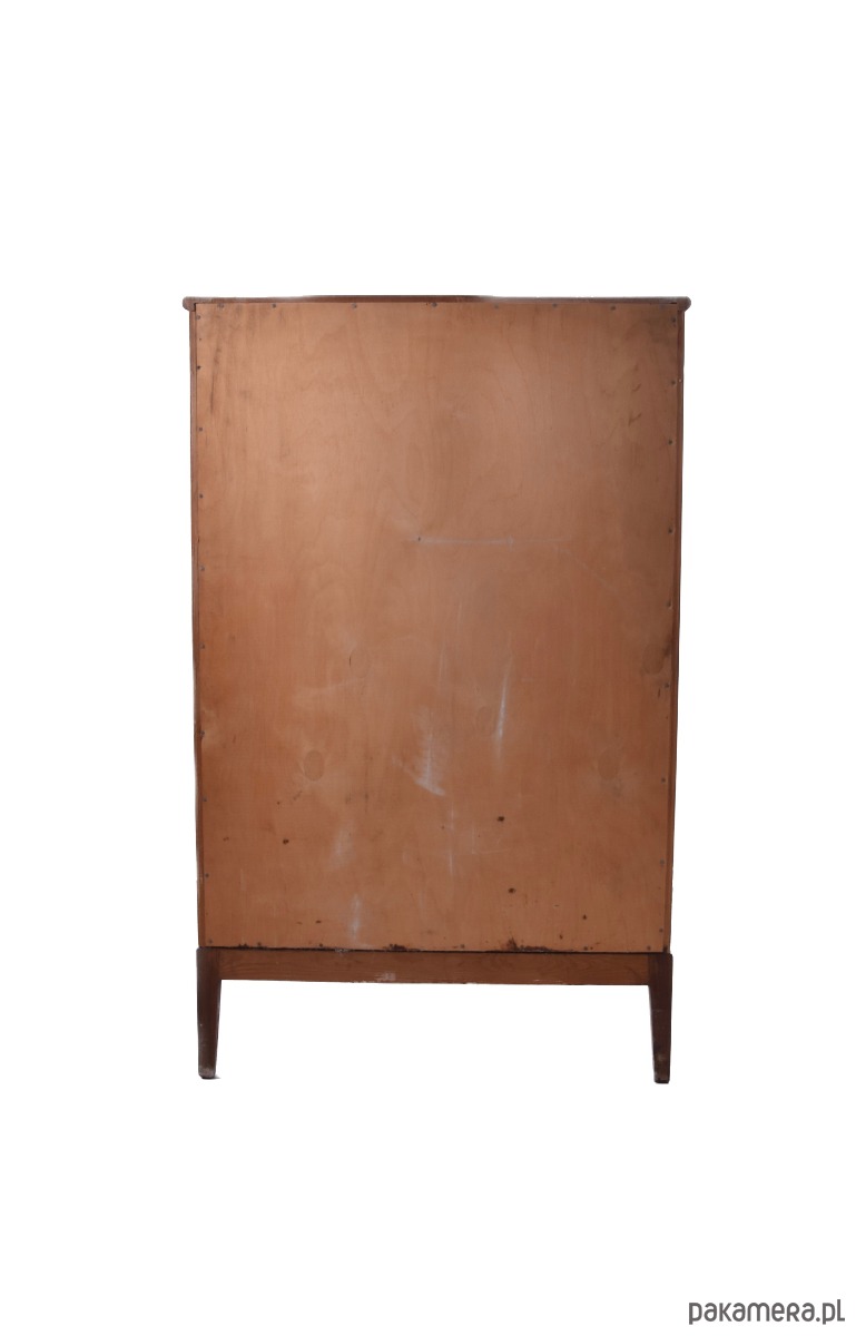Na uwagę zasługują charakterystyczne, rzeźbione uchwyty o organicznej formie, które nadają bryle wyjątkowego charakteru. Górna szuflada zamykana na klucz.