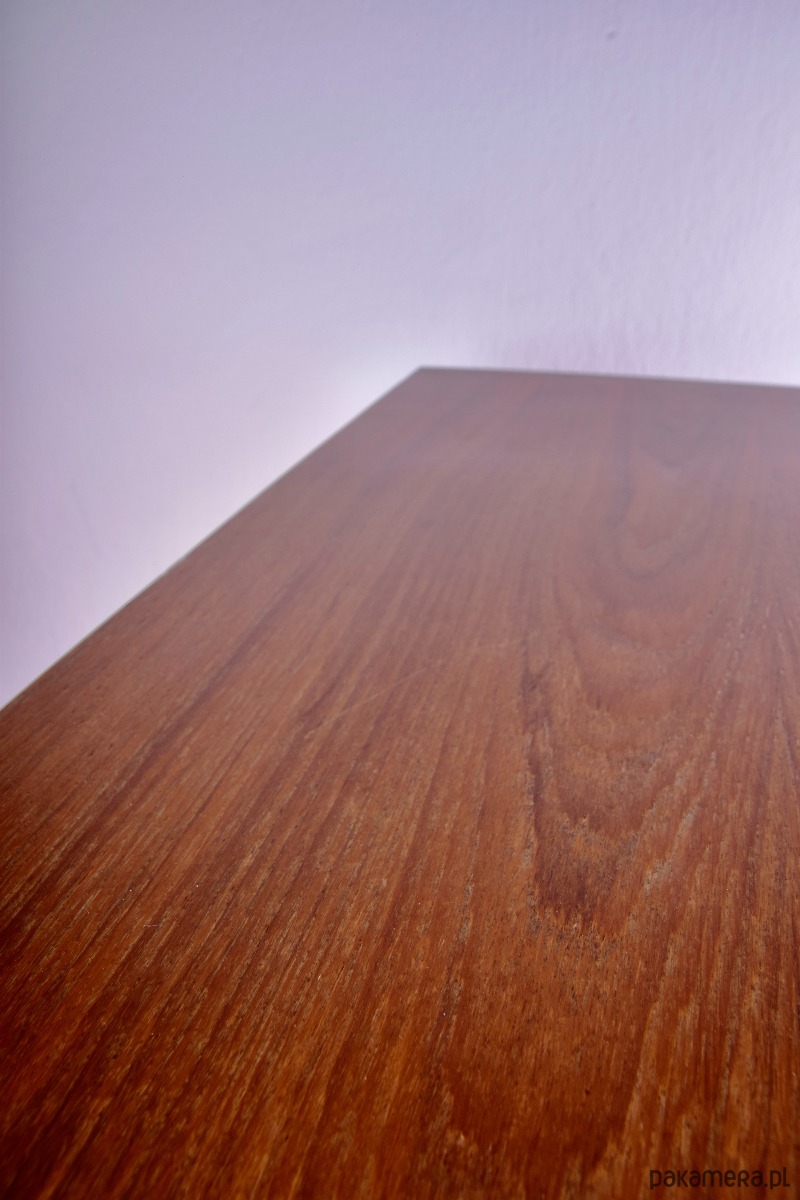 Mebel po starannej renowacji – powierzchnia została oczyszczona i wykończona w sposób podkreślający naturalną strukturę teaku, bez efektu sztucznego połysku.