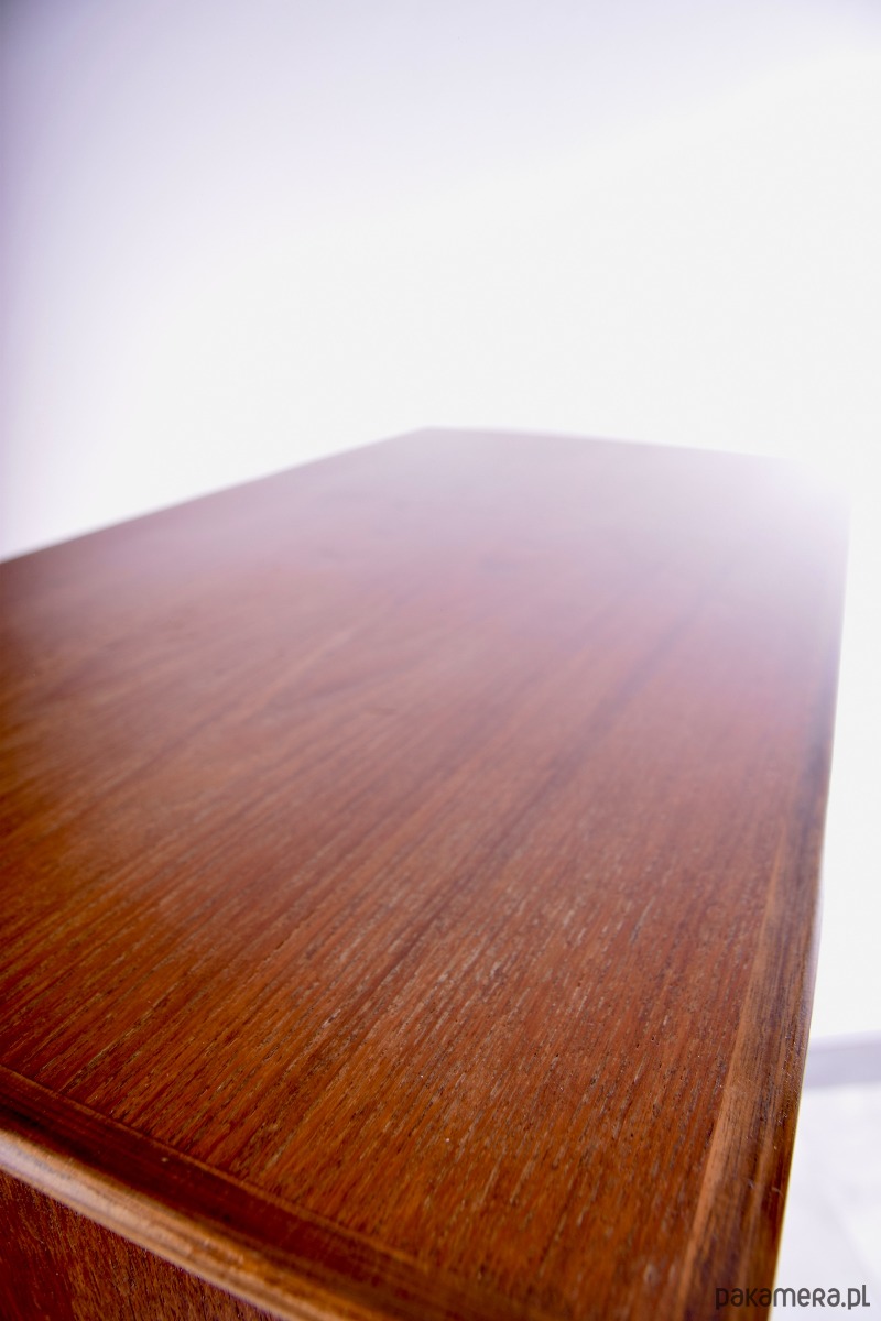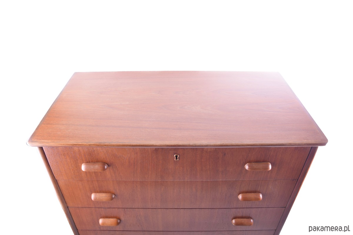 Komoda w stylu duńskiego modernizmu z lat 60., wykonana z naturalnego forniru teakowego o pięknym, głębokim rysunku drewna.