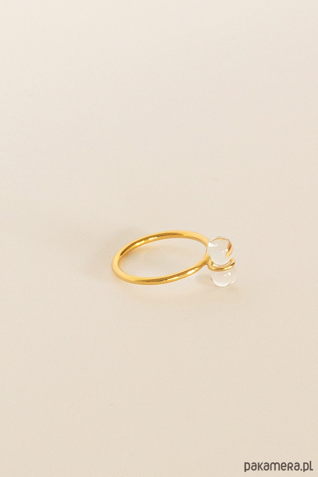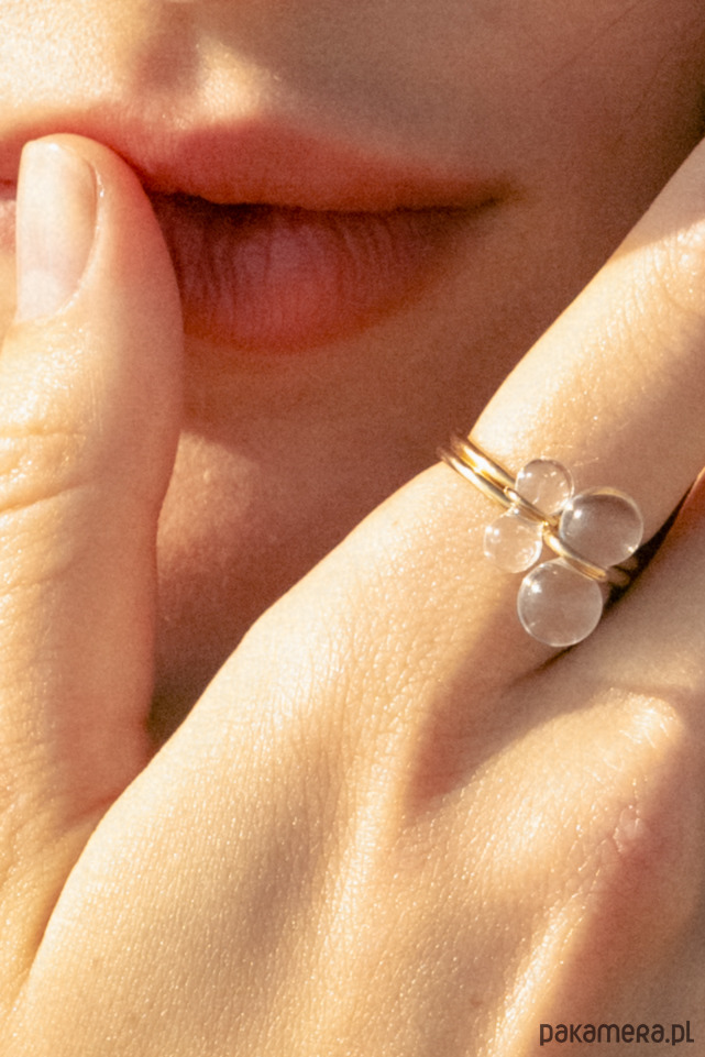 – srebrny pierścionek o grubości obrączki 1,5cm połączony ze szklanym elementem o długości 1,5cm