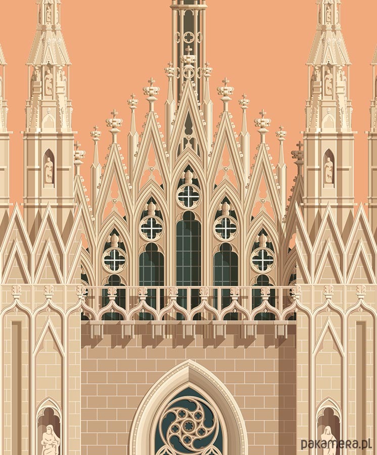 Plakat z autorską grafiką inspirowany Katedrą w Mediolanie (Duomo Di Milano). Pochodzi z serii "Dookoła Świata" i przedstawia gotycką marmurową katedrę, jedną z najbardziej rozpoznawalnych budowli we Włoszech. Zaprojektowana została przez Simone da Orsenigo.