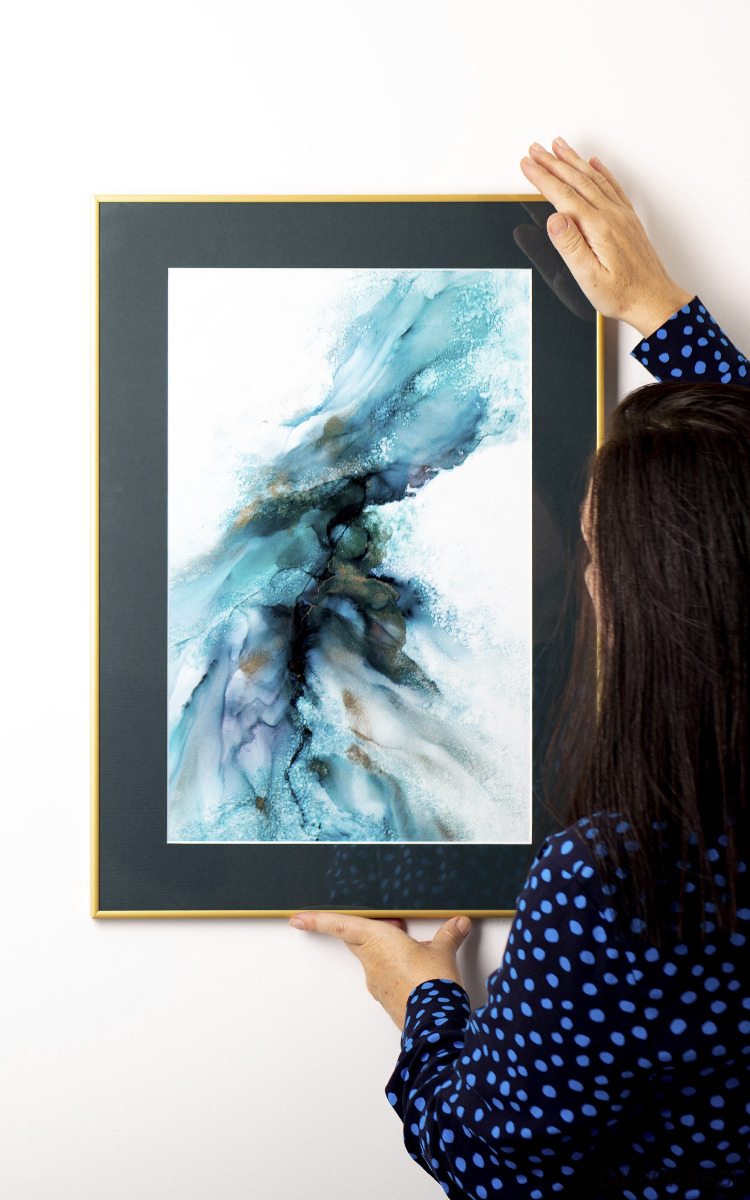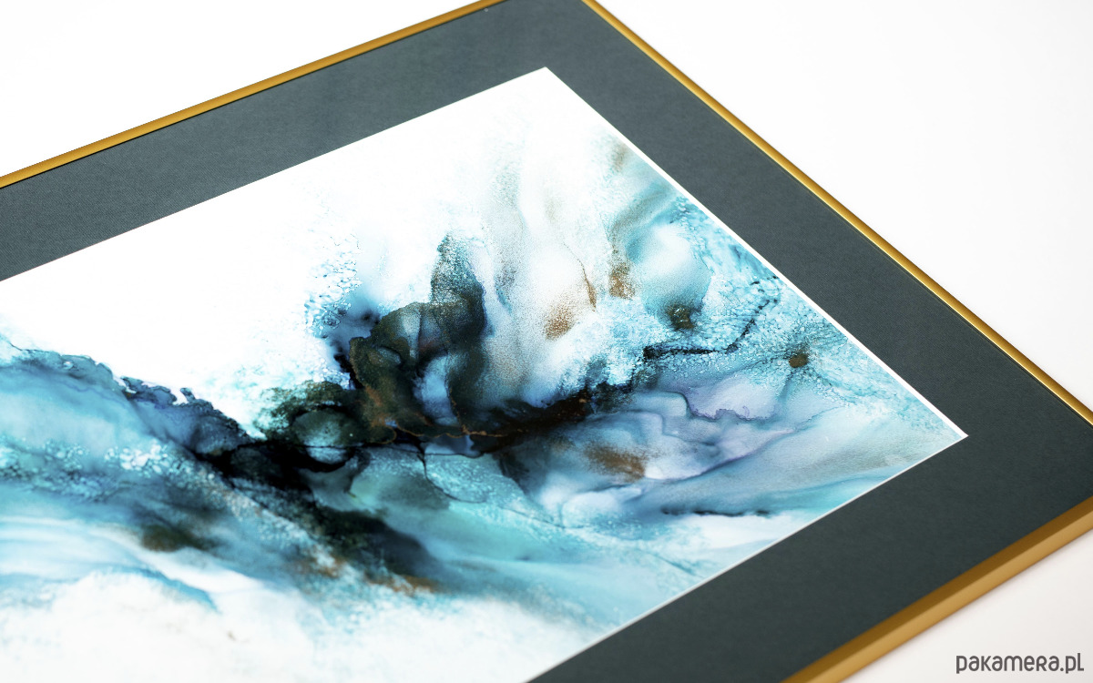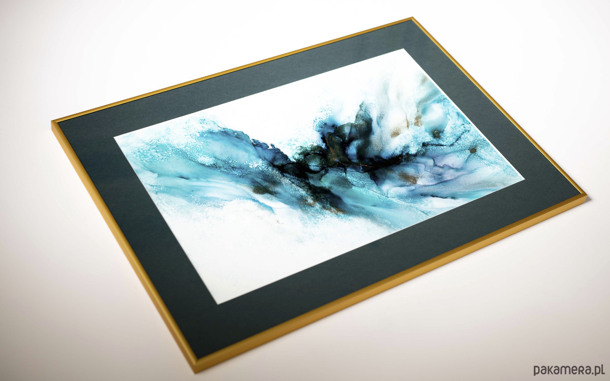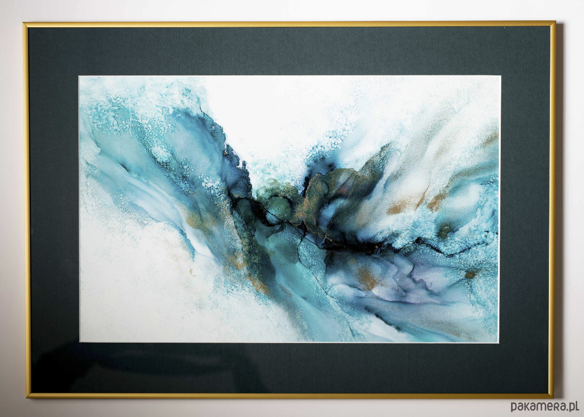 Obraz ręcznie malowany, tusz na papierze (około 30 x 50cm), z passe partout, w ramie metalowej w kolorze złotym w rozmiarze 42 x 60 cm, za szkłem.