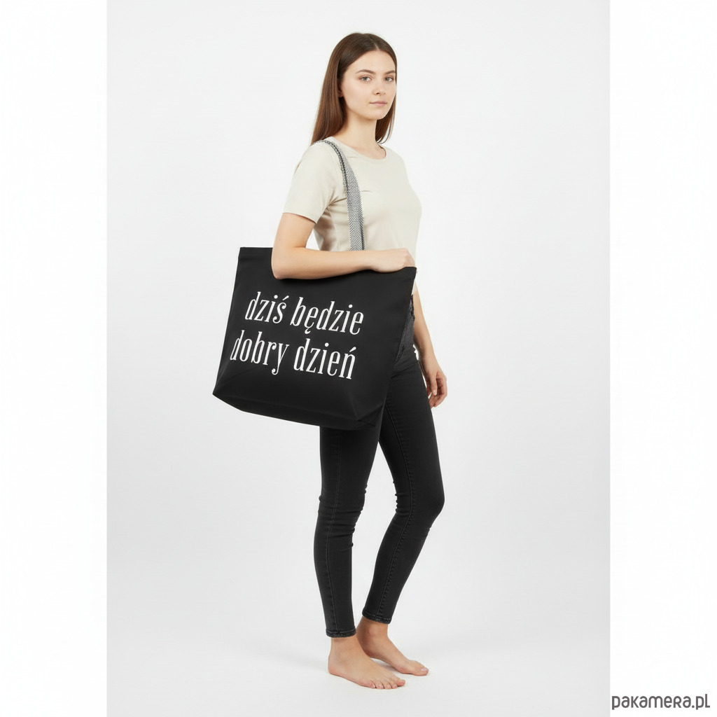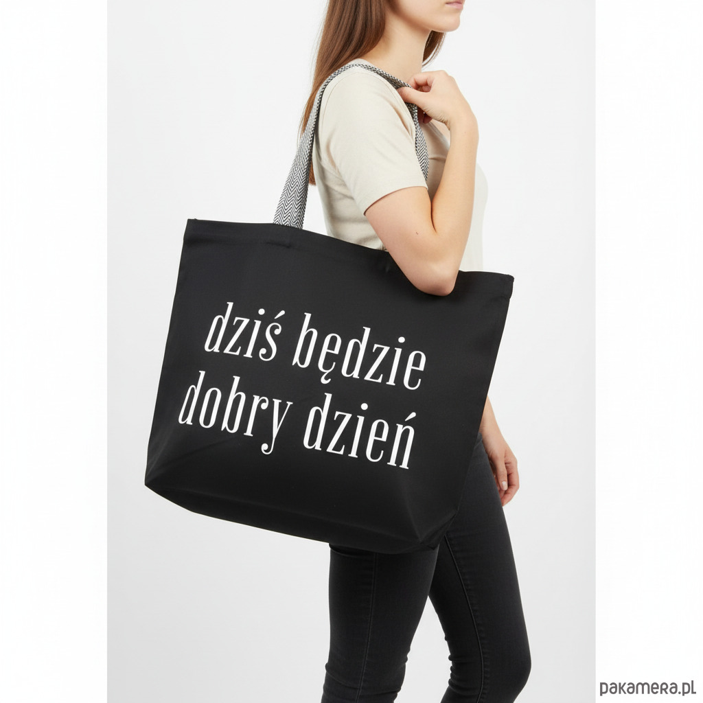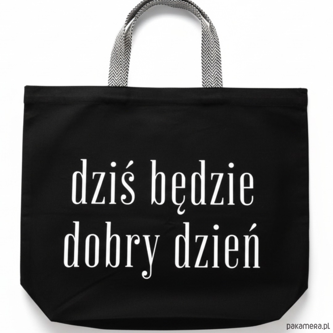 Bardzo duża bawełniana torba czarna z afirmacją DZIŚ BĘDZIE DOBRY DZIEŃ