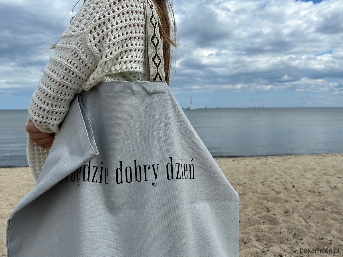 Bardzo duża bawełniana torba beżowa z afirmacją UŚMIECHNIJ SIĘ :)