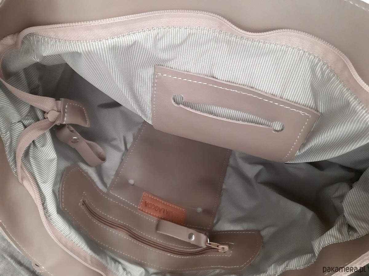 W środku podszewka , jedna kieszeń na zamek i 2 kieszenie skórzane np. na telefon.
