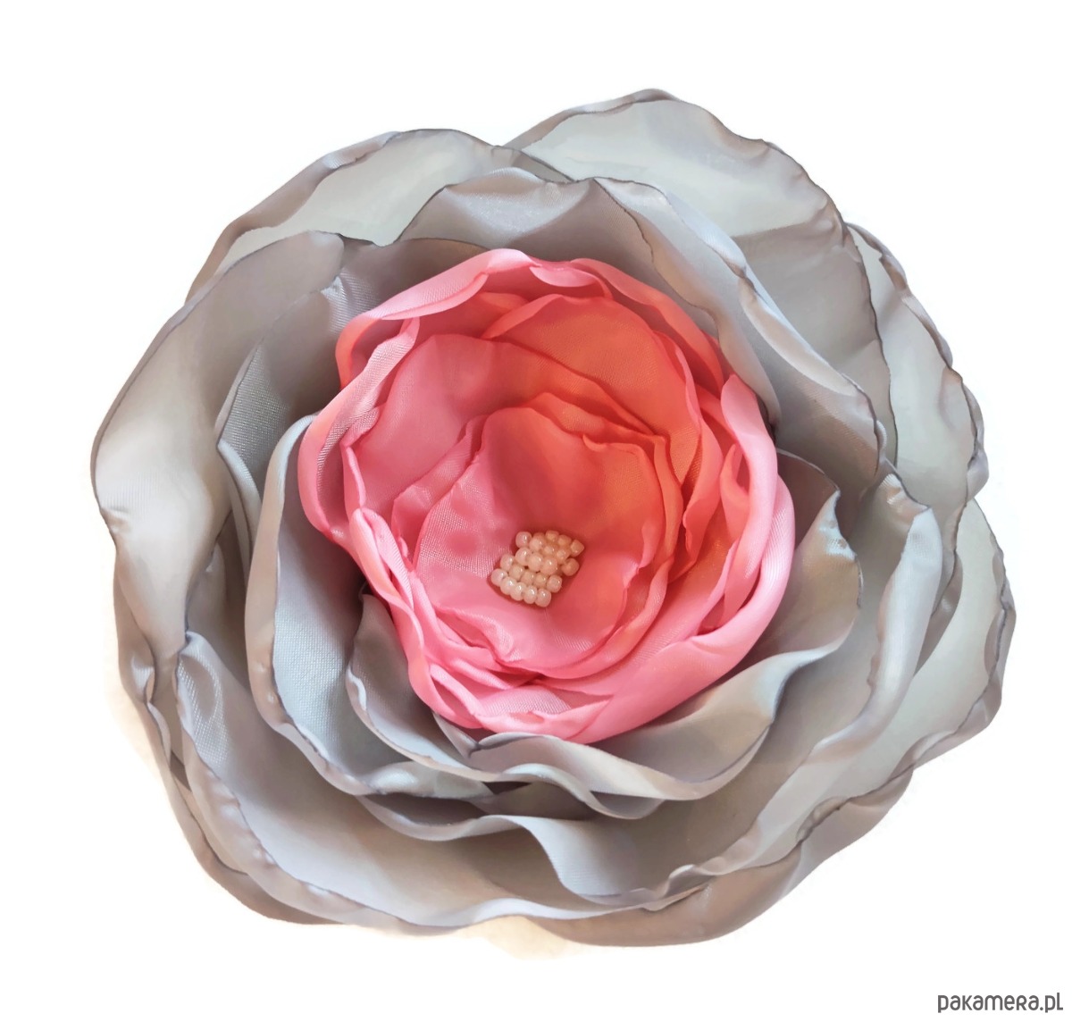 Duża broszka jasna pudrowy róż z szarym 12cm kwiat kwiatek