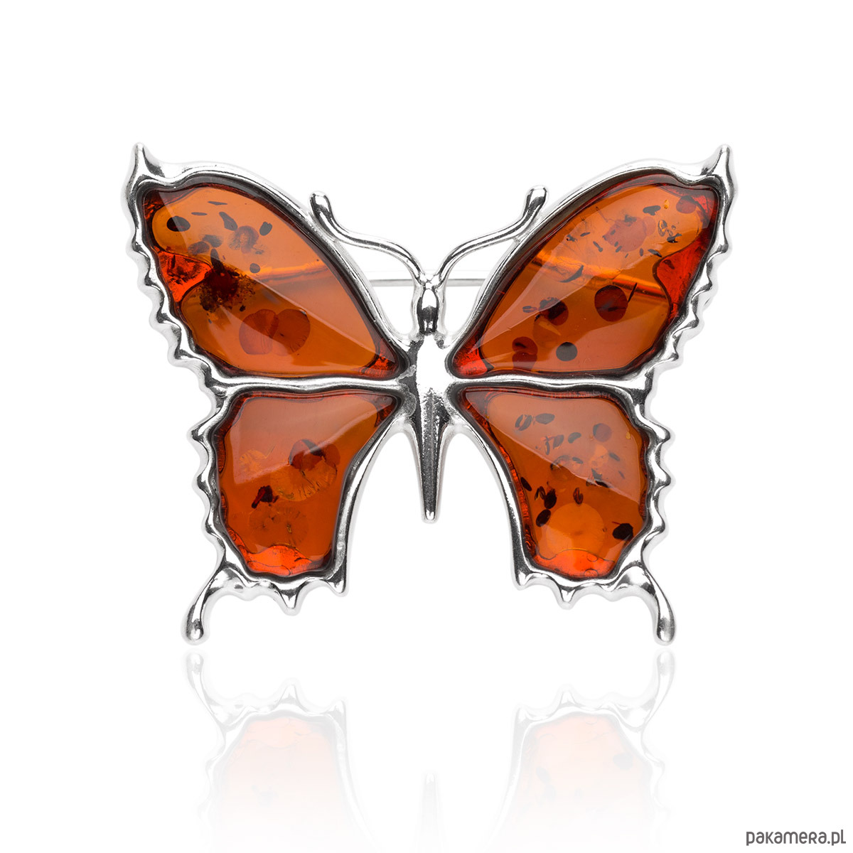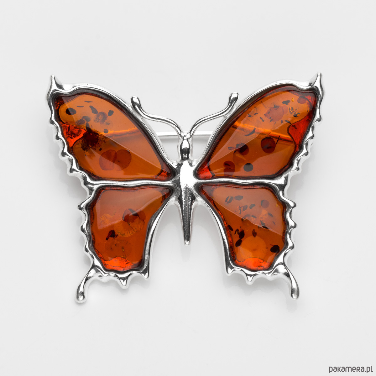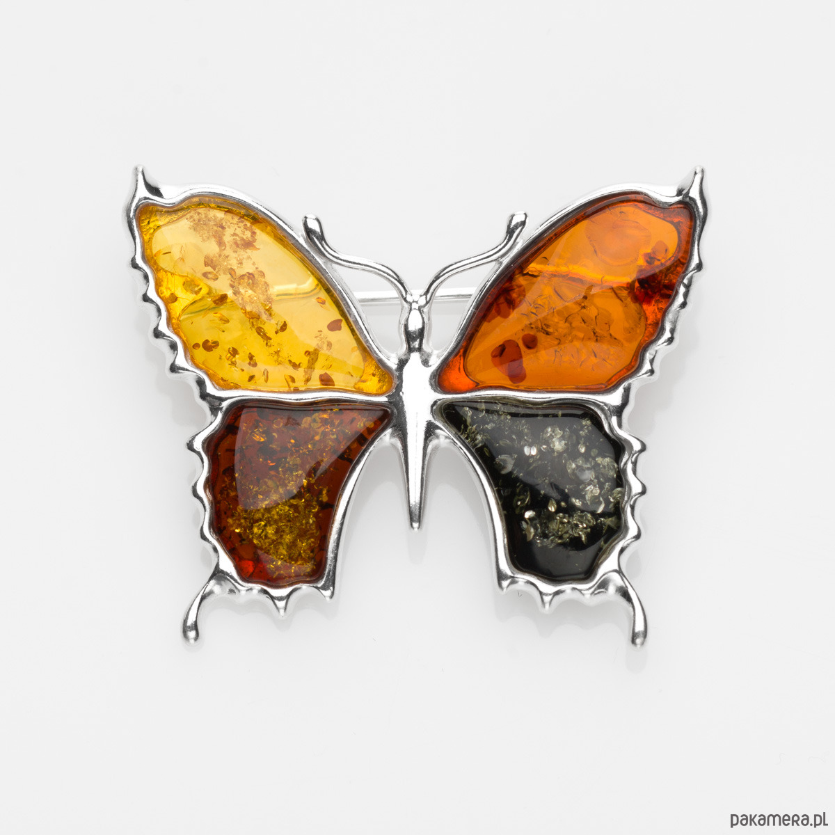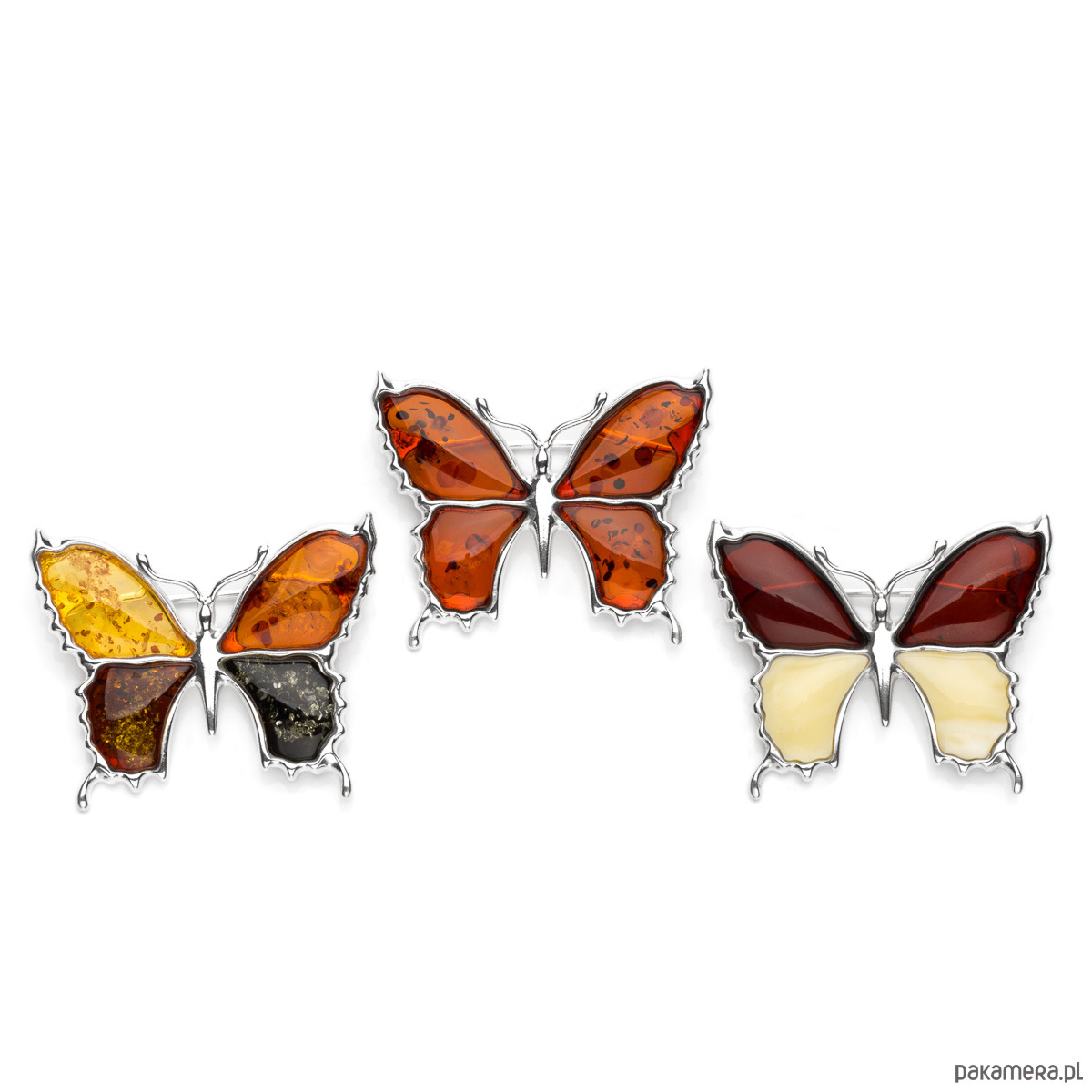 Wielkość broszki 35 mm x 30 mm. Do wyboru warianty kolorystyczne: 1) motyl z bursztynu kolorowego 2) motyl z bursztynu jednokolorowego - koniak.