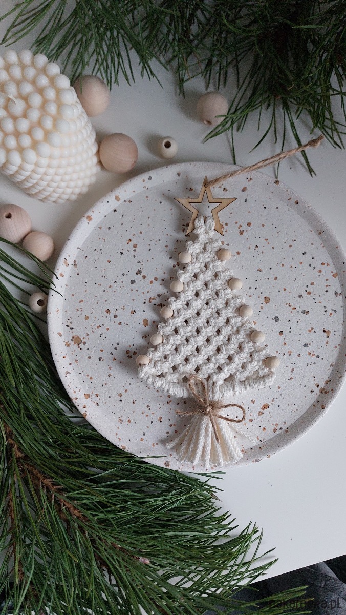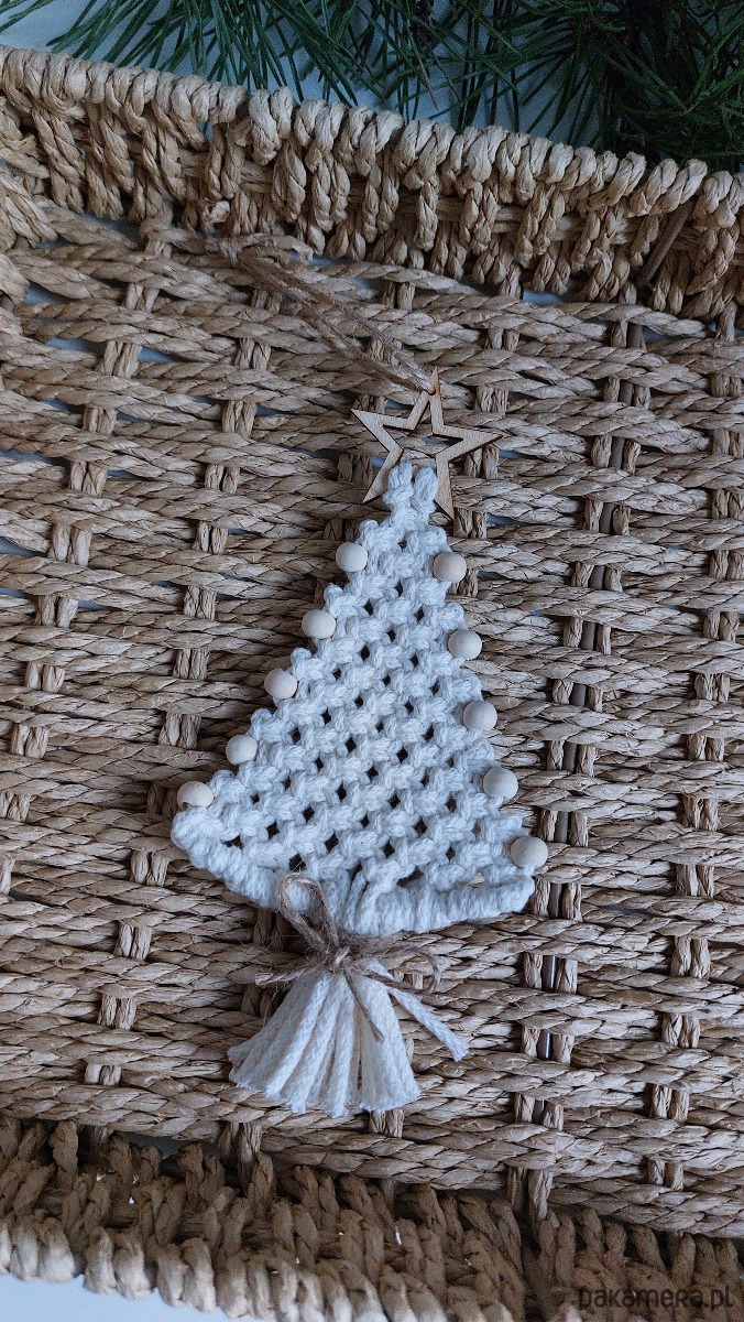 Ozdoba choinkowa wykonana własnoręcznie ze sznurka bawełnianego 3mm w kolorze naturalnym z drewnianymi elementami gwiazdką i koralikami