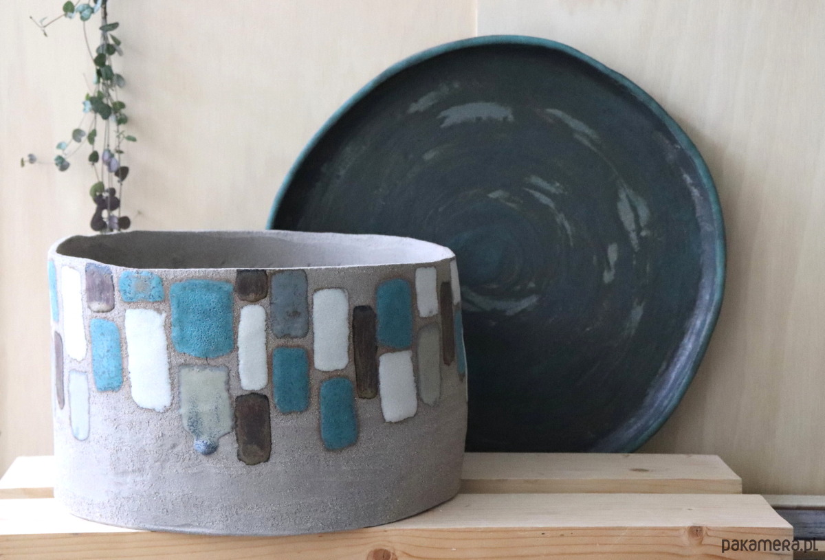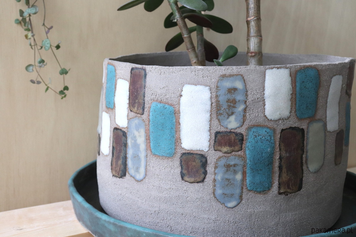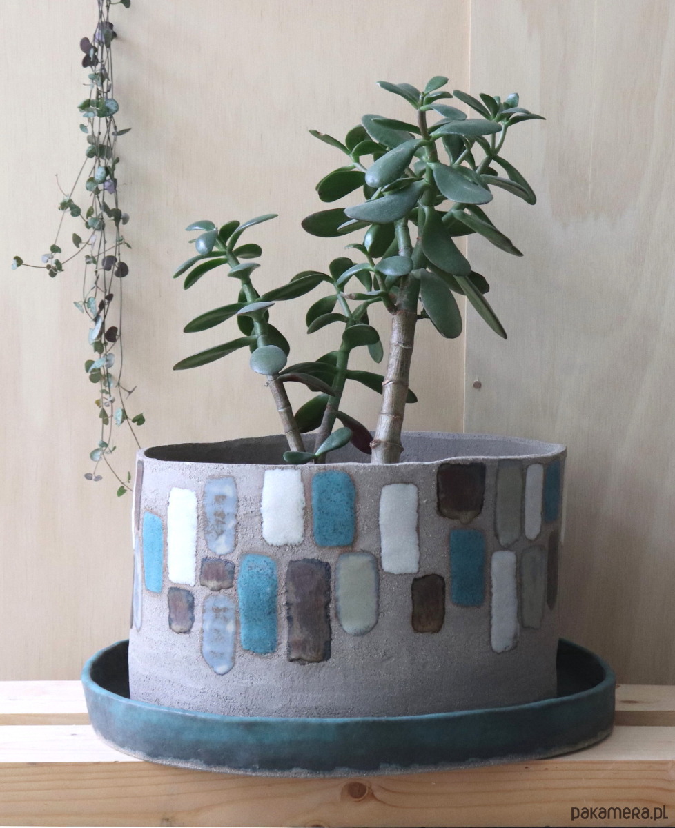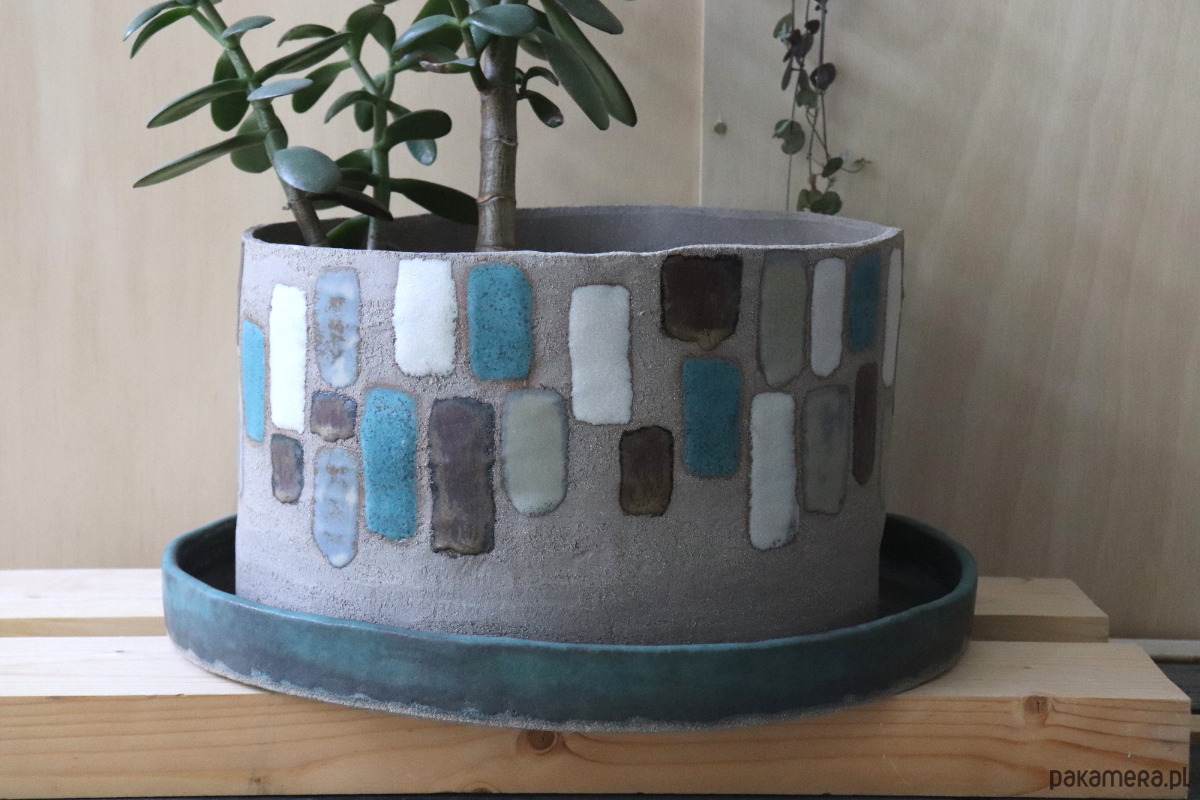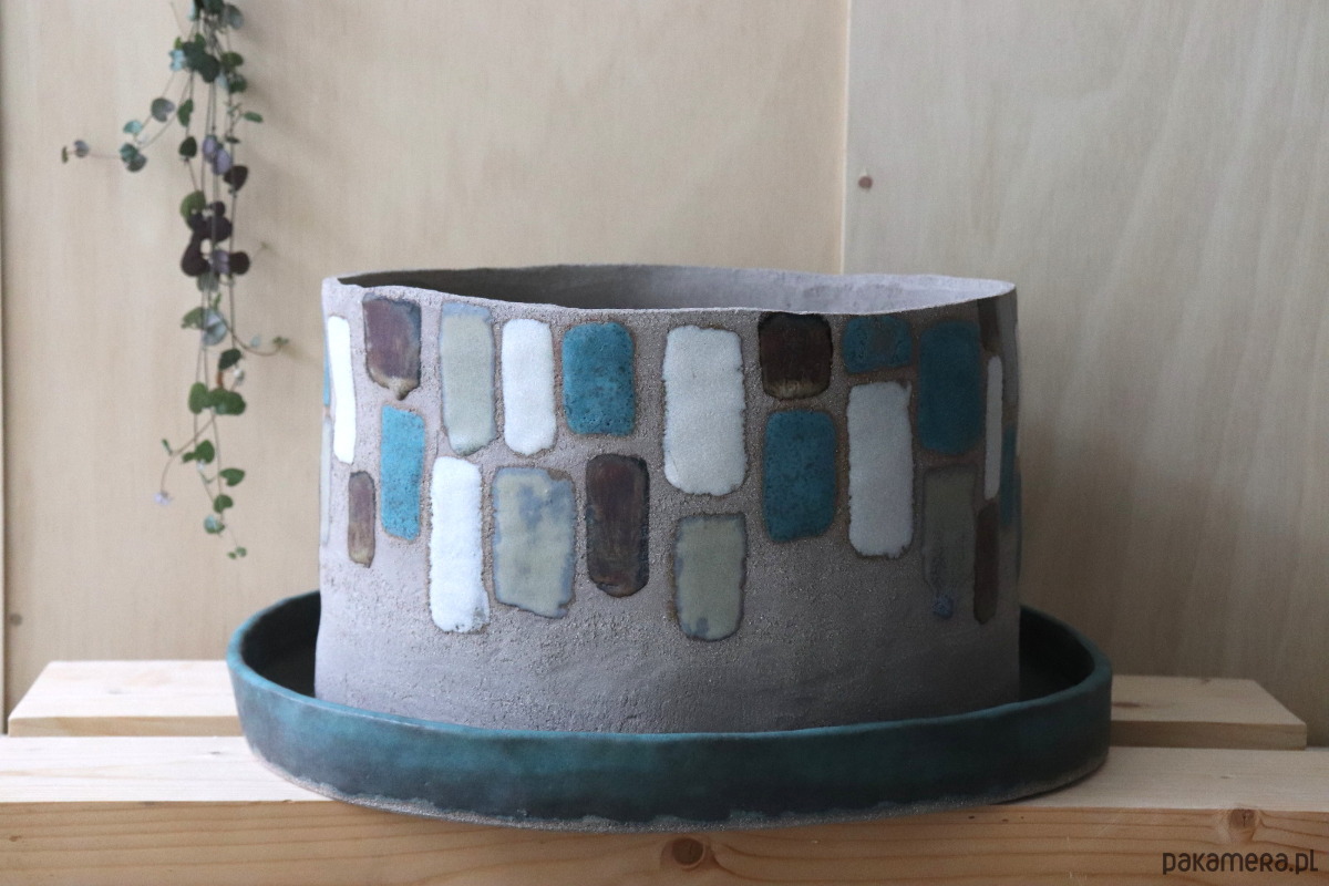 Doniczka z szarej, surowej gliny o ciepłym odcieniu, dekorowana plamami stonowanych szkliw. Podstawka w całości pokryta niebieskim szkliwem z przebarwieniami.