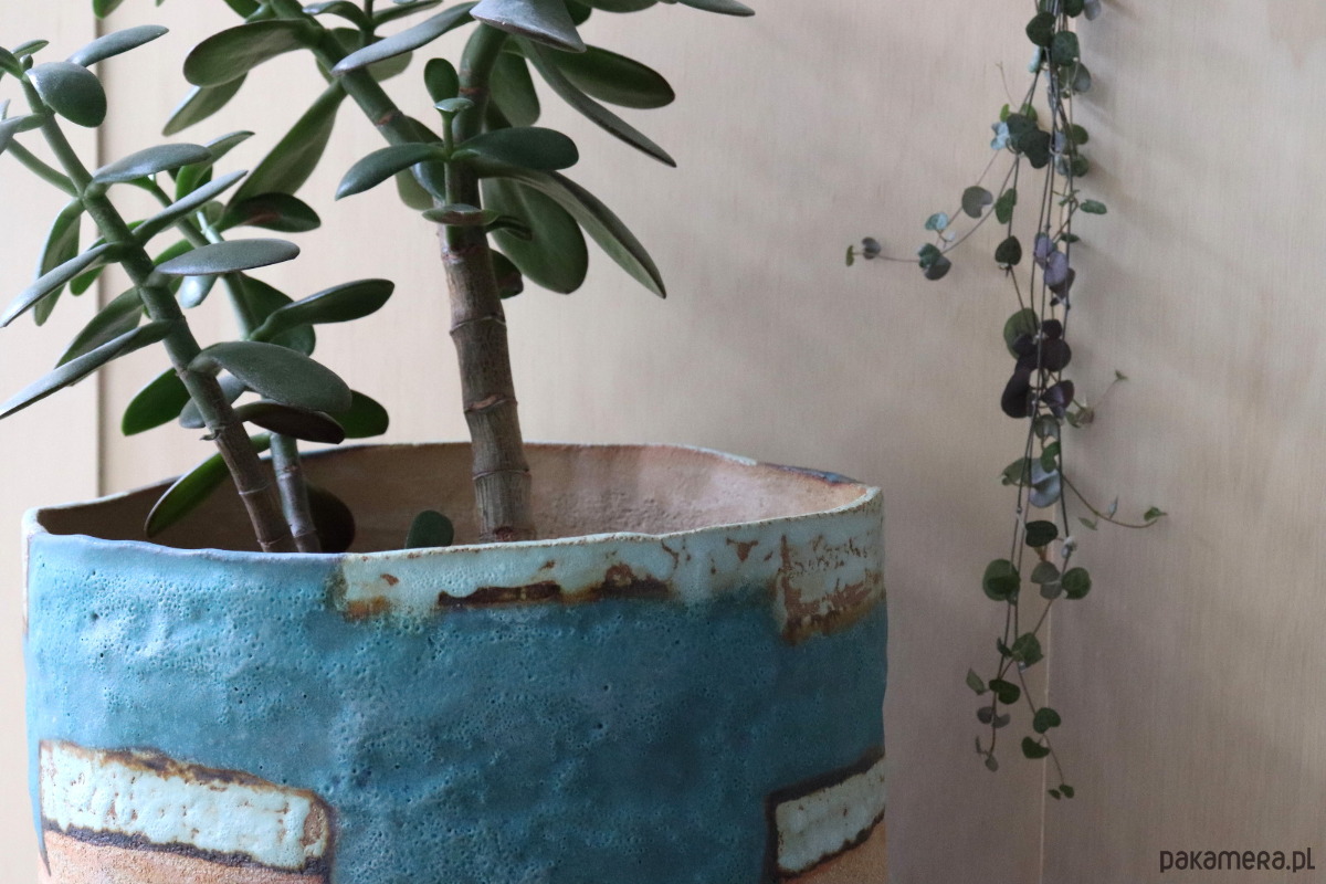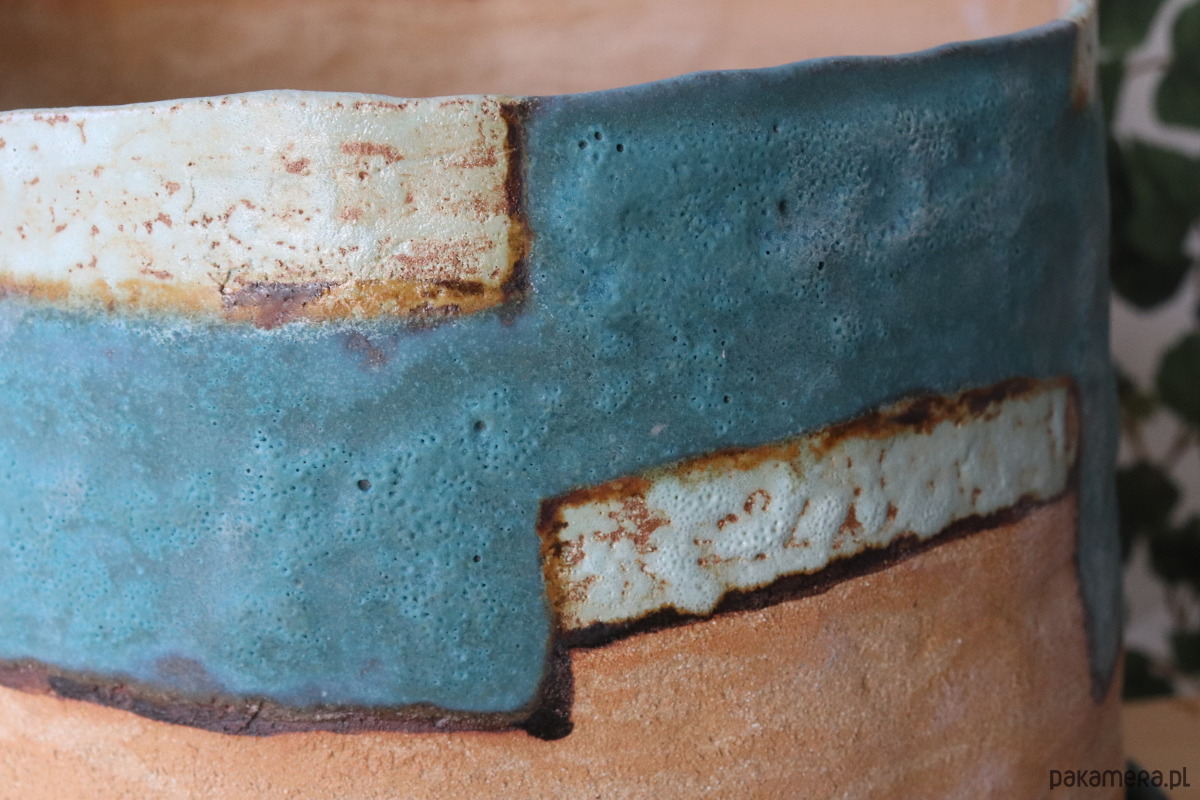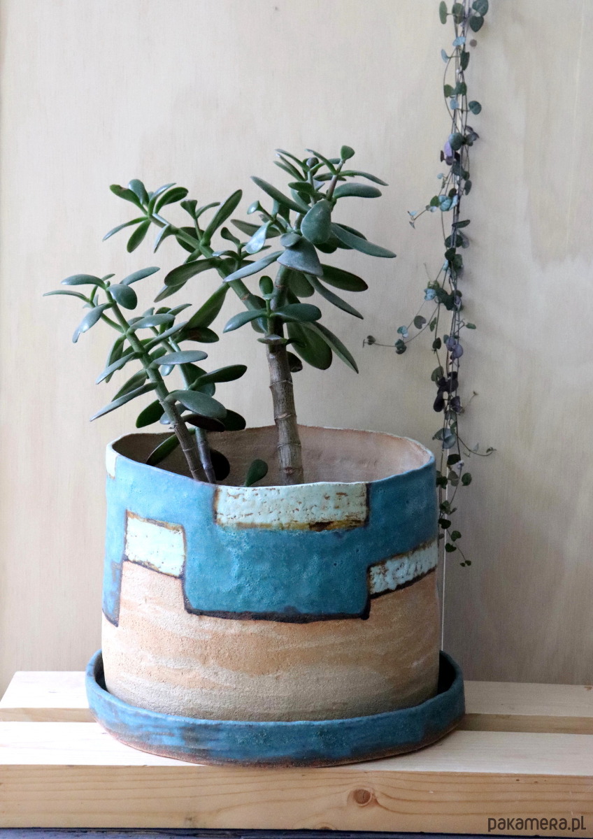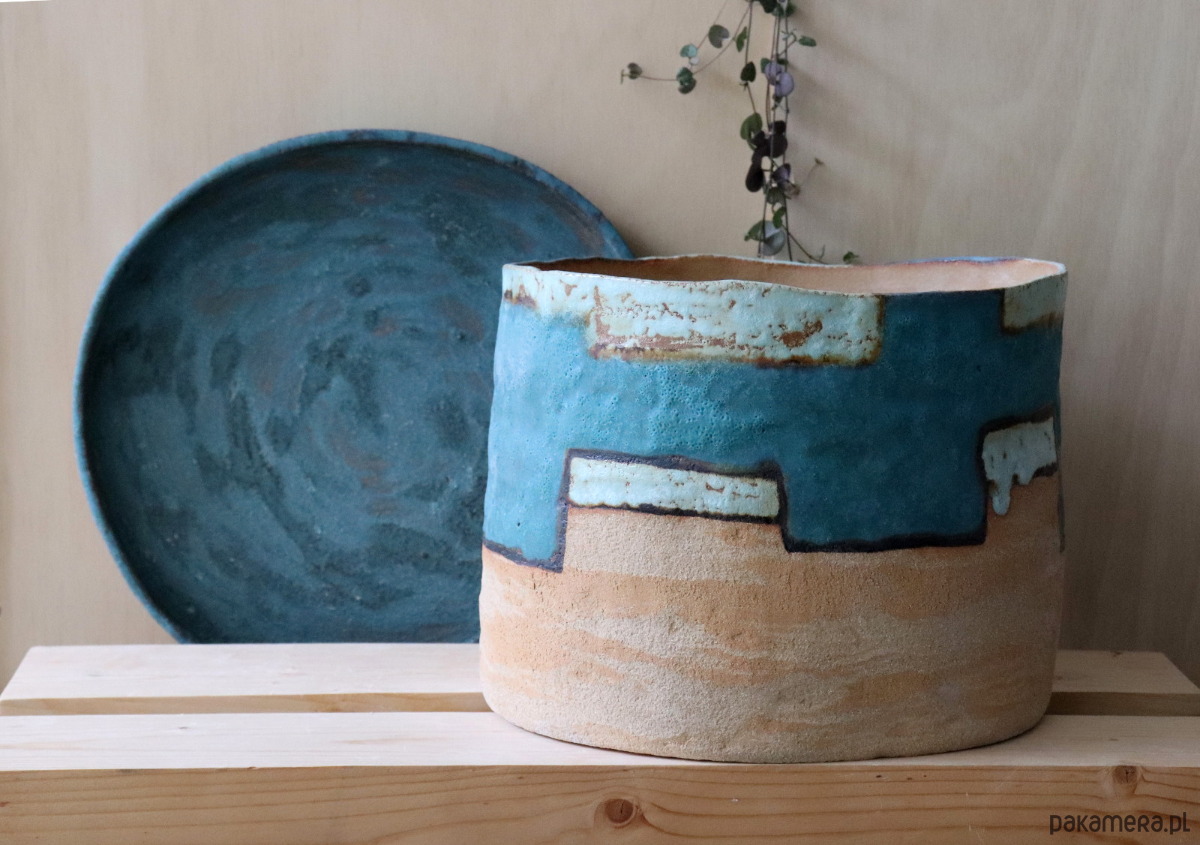 Doniczka wykonana z żółtej gliny, częściowo pokryta szkliwami w różnych odcieniach błękitu i mięty. Podstawka w całości pokryta niebieskim szkliwem z przebarwieniami. Wzory na doniczce nie są powtarzalne, więc z każdej strony wygląda nieco inaczej. Naczynie zostało wykonane ręcznie, bez użycia koła garncarskiego.