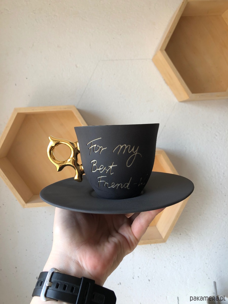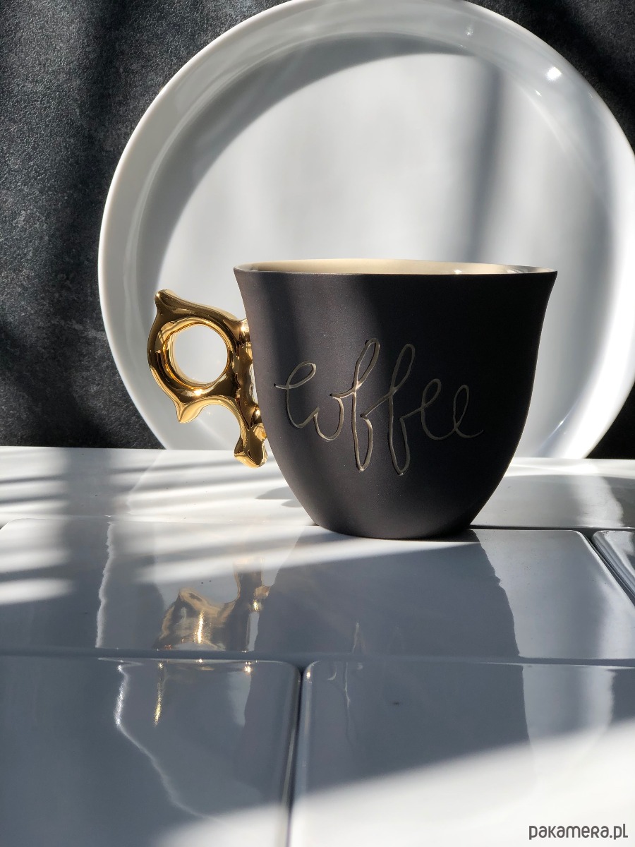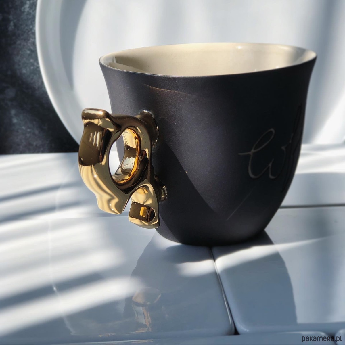 Naczynia są czarne matowe na zewnątrz, w środku kremowe szkliwione. Uszko pokryte prawdziwym złotem.
