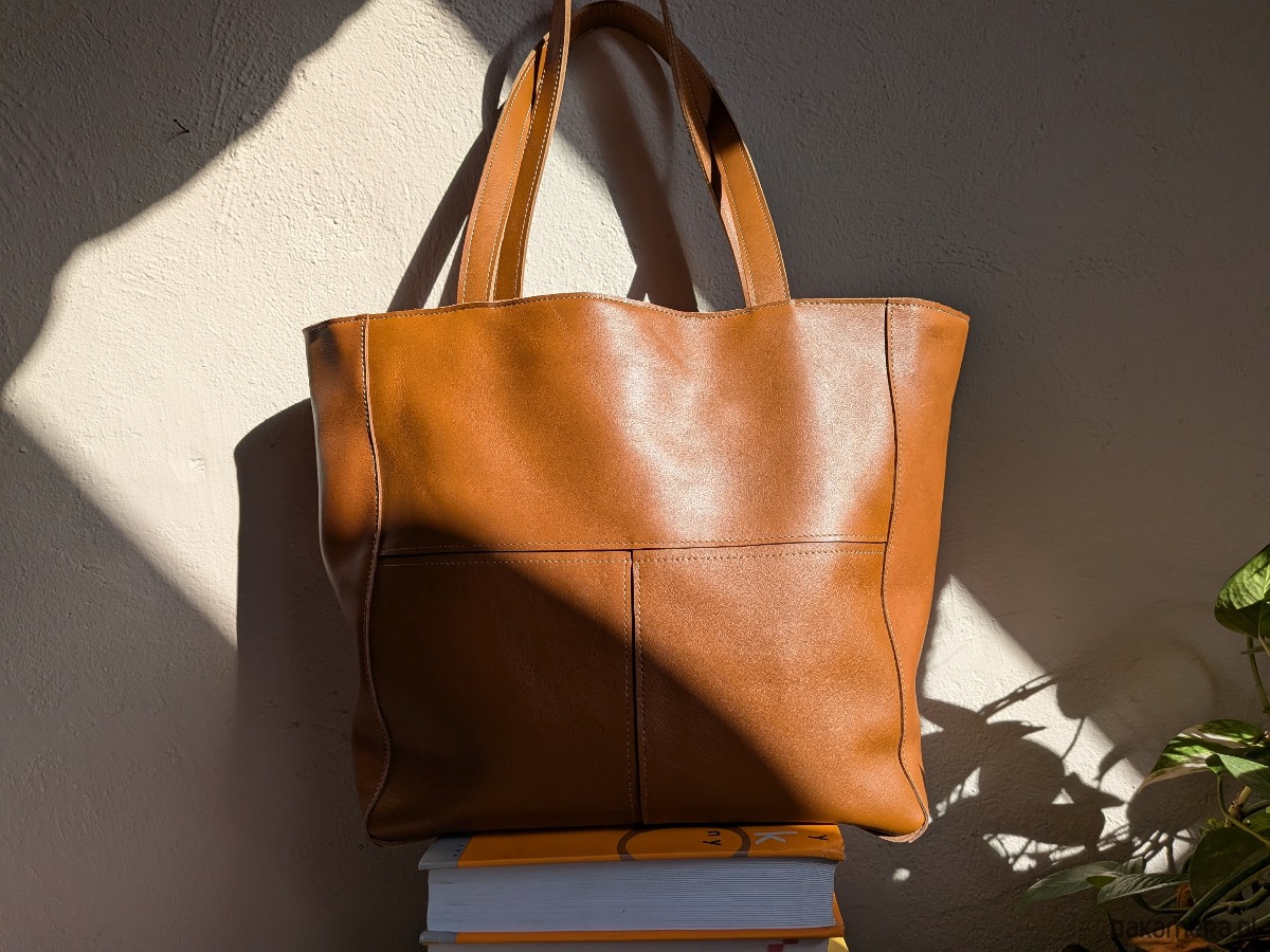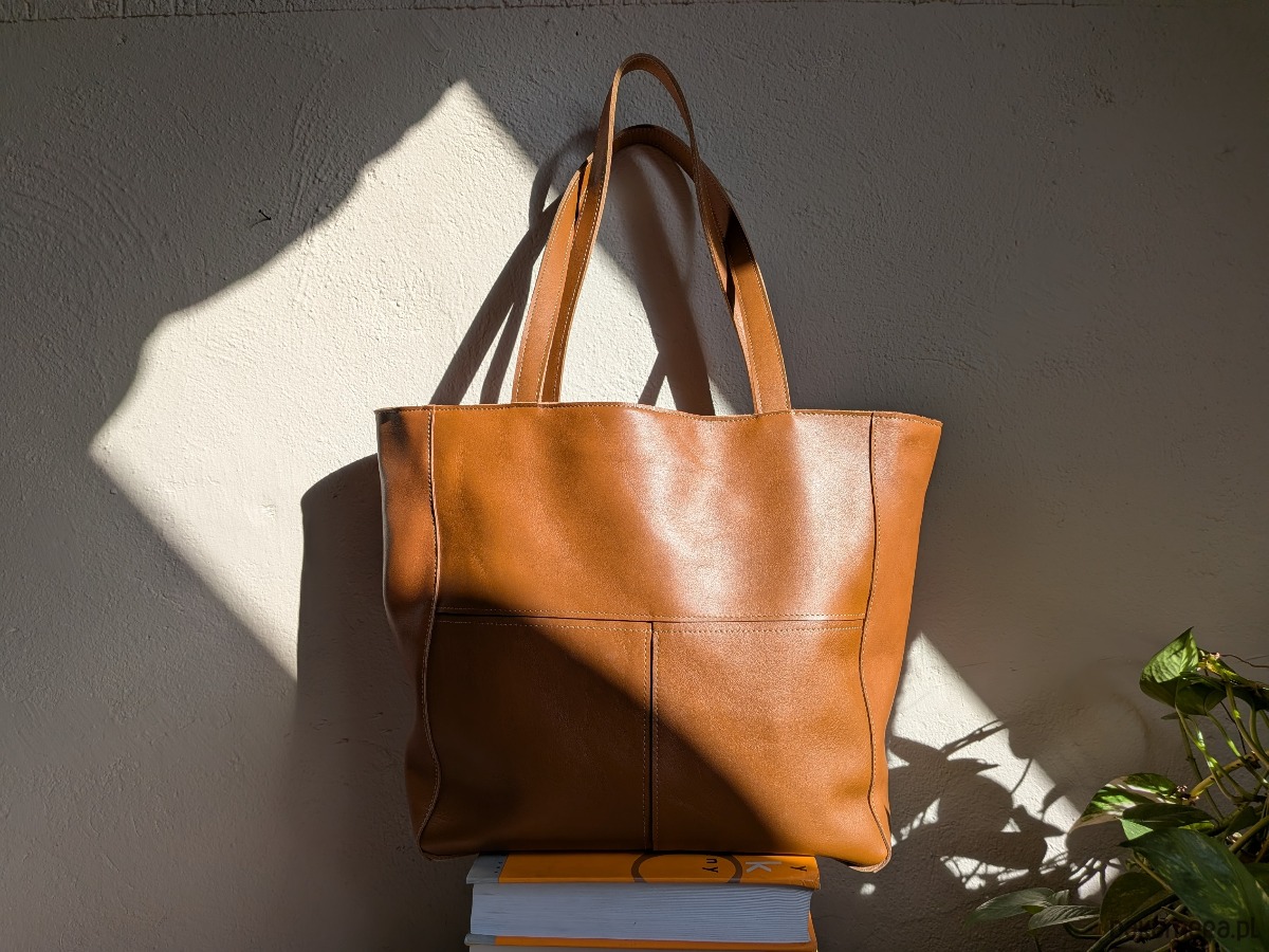 Duża, uszyta ze skóry naturalnej w kolorze koniakowym.