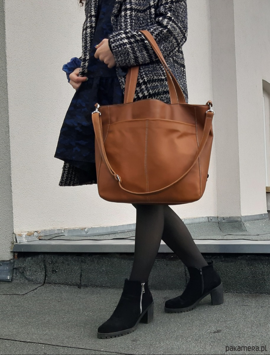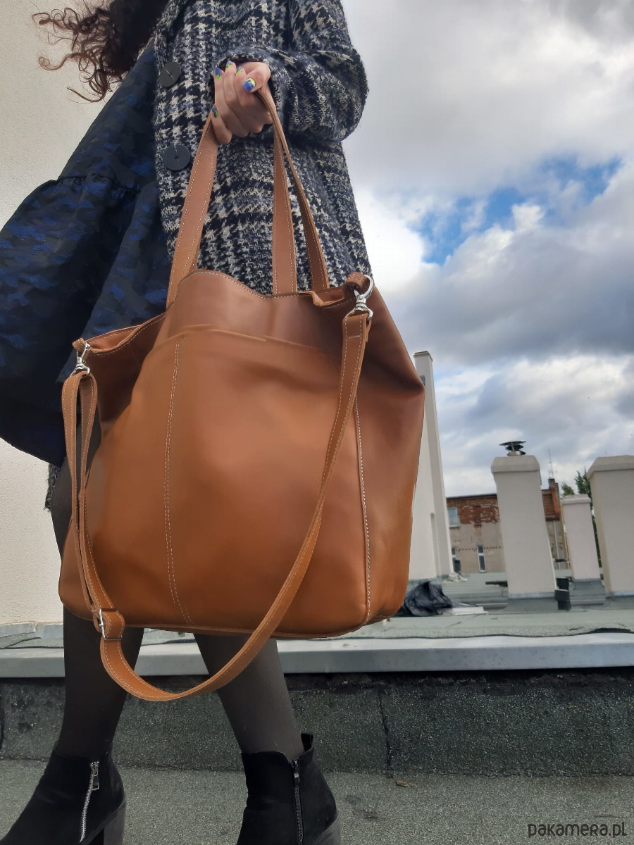 Duża koniakowa skórzana torba z dużymi kieszeniami