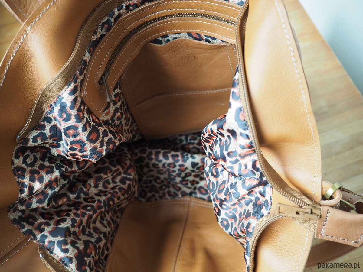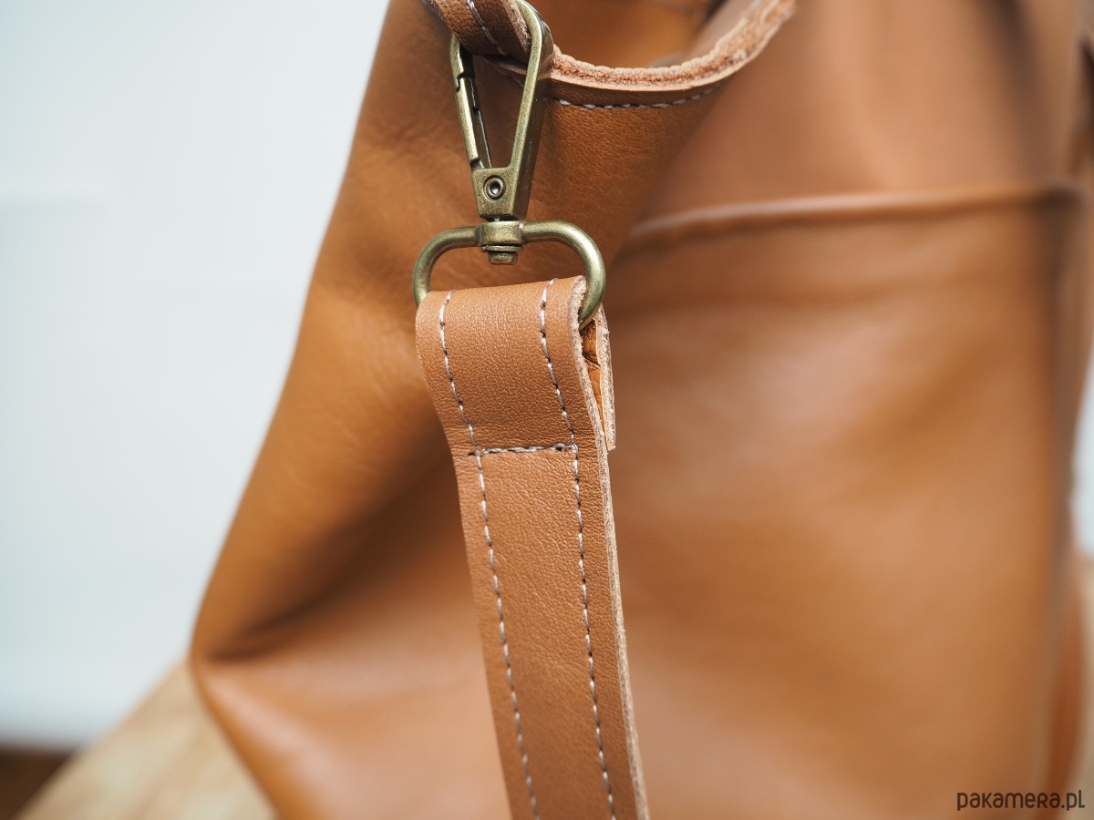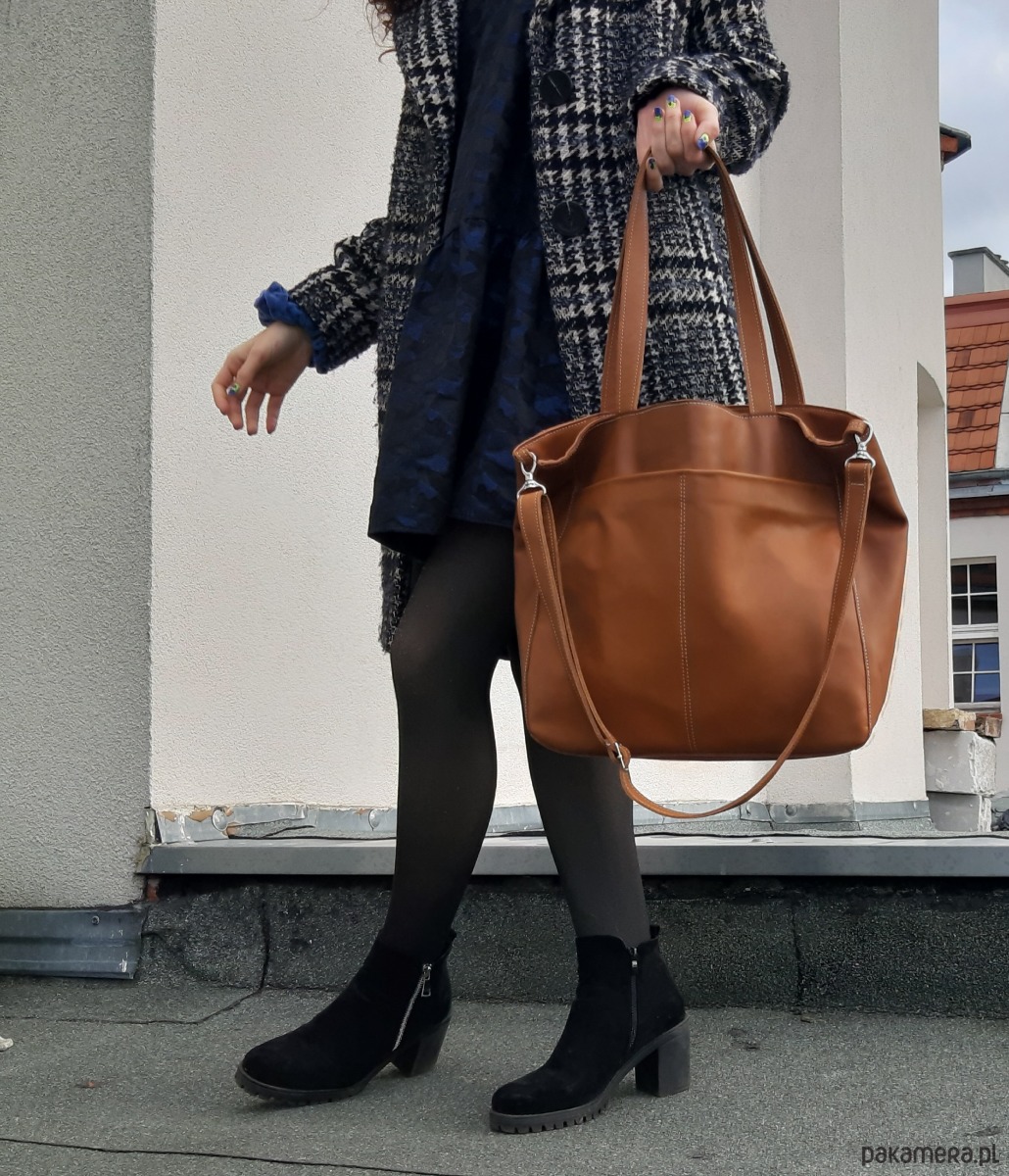 Duża, uszyta ze skóry naturalnej w kolorze koniakowym.