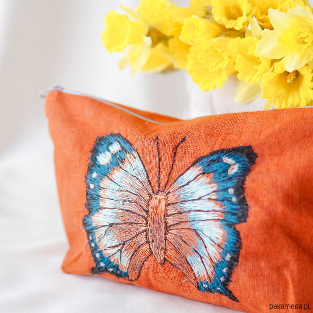 Kobieca kosmetyczka ręcznie szyta z ręcznie wyszywanym motywem motyla – elegancja i funkcjonalność w jednym